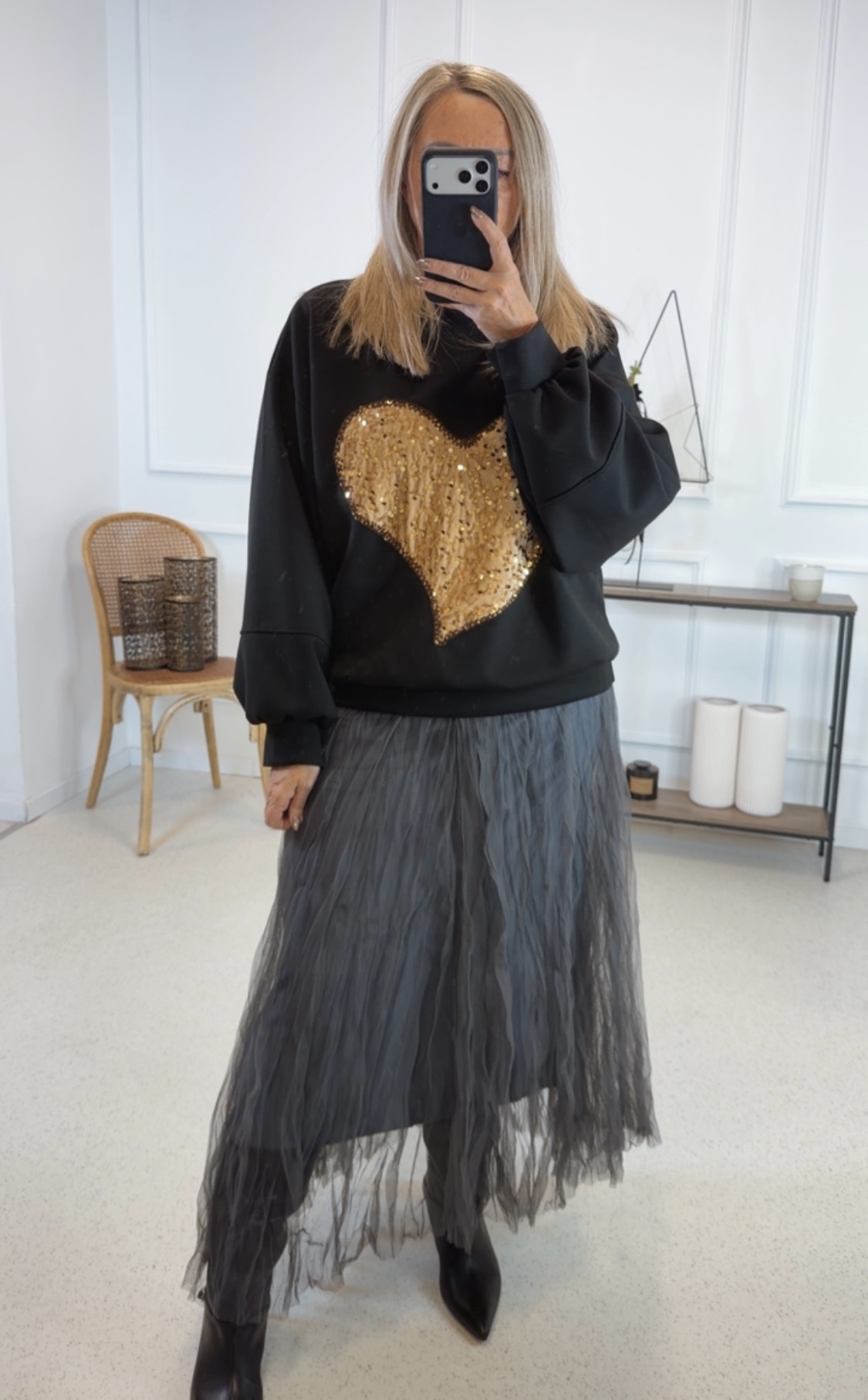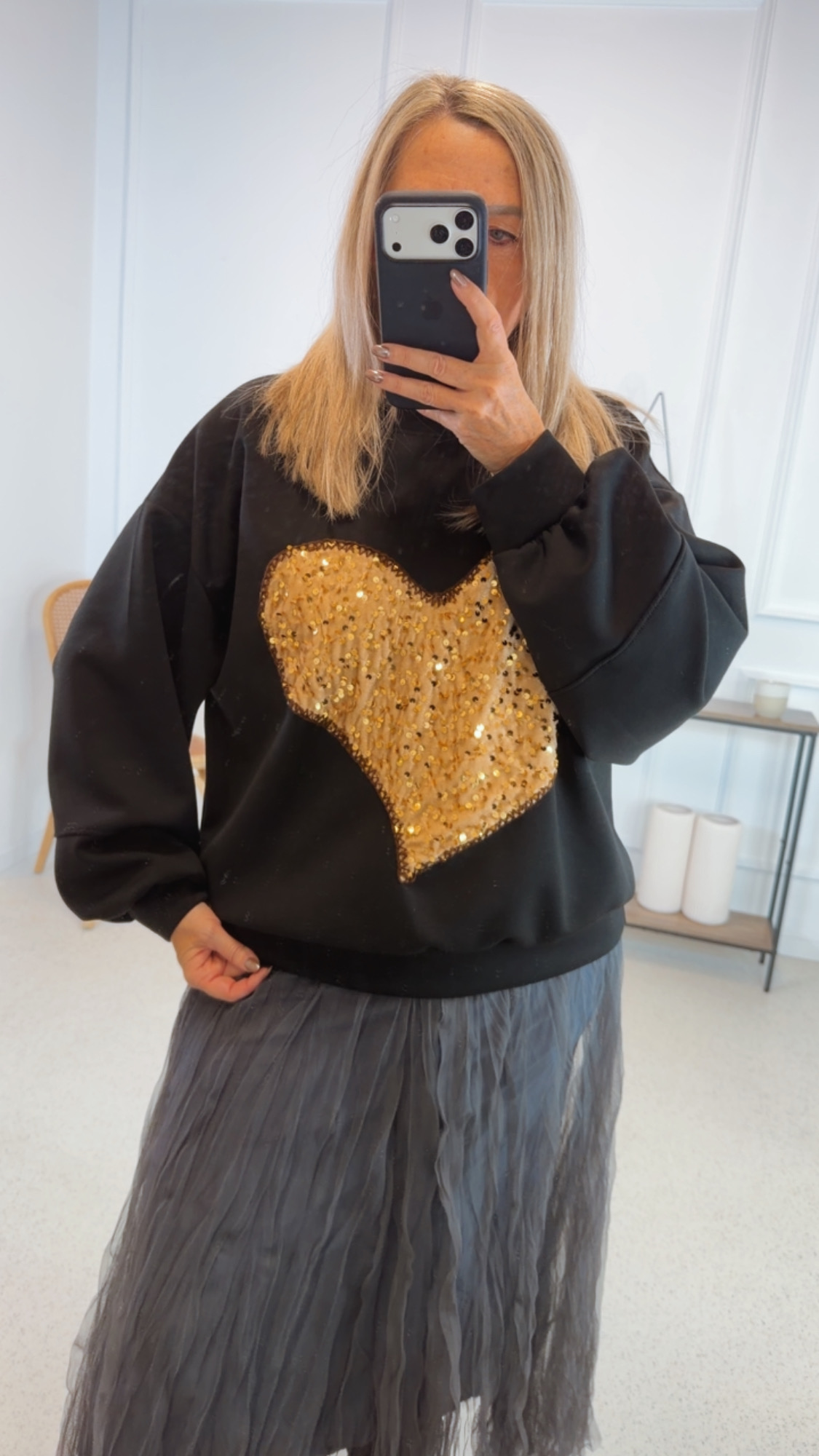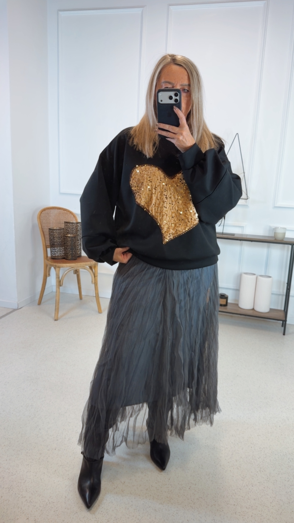 Der wunderschöne Oversize-Pullover „Alma“ begeistert mit einem einzigartigen, trendigen Look und seinem unverwechselbaren GLITZER-HERZ aus Pailletten und Samt. Dieser kurzärmelige Sweater kombiniert modisches Design mit maximalem Wohlfühlfaktor und ist damit ein echtes Must-have für alle, die Style und Komfort lieben.