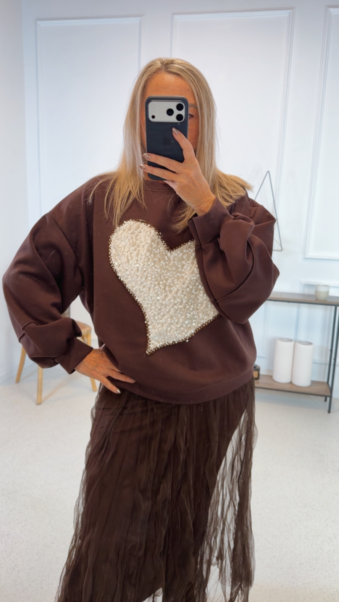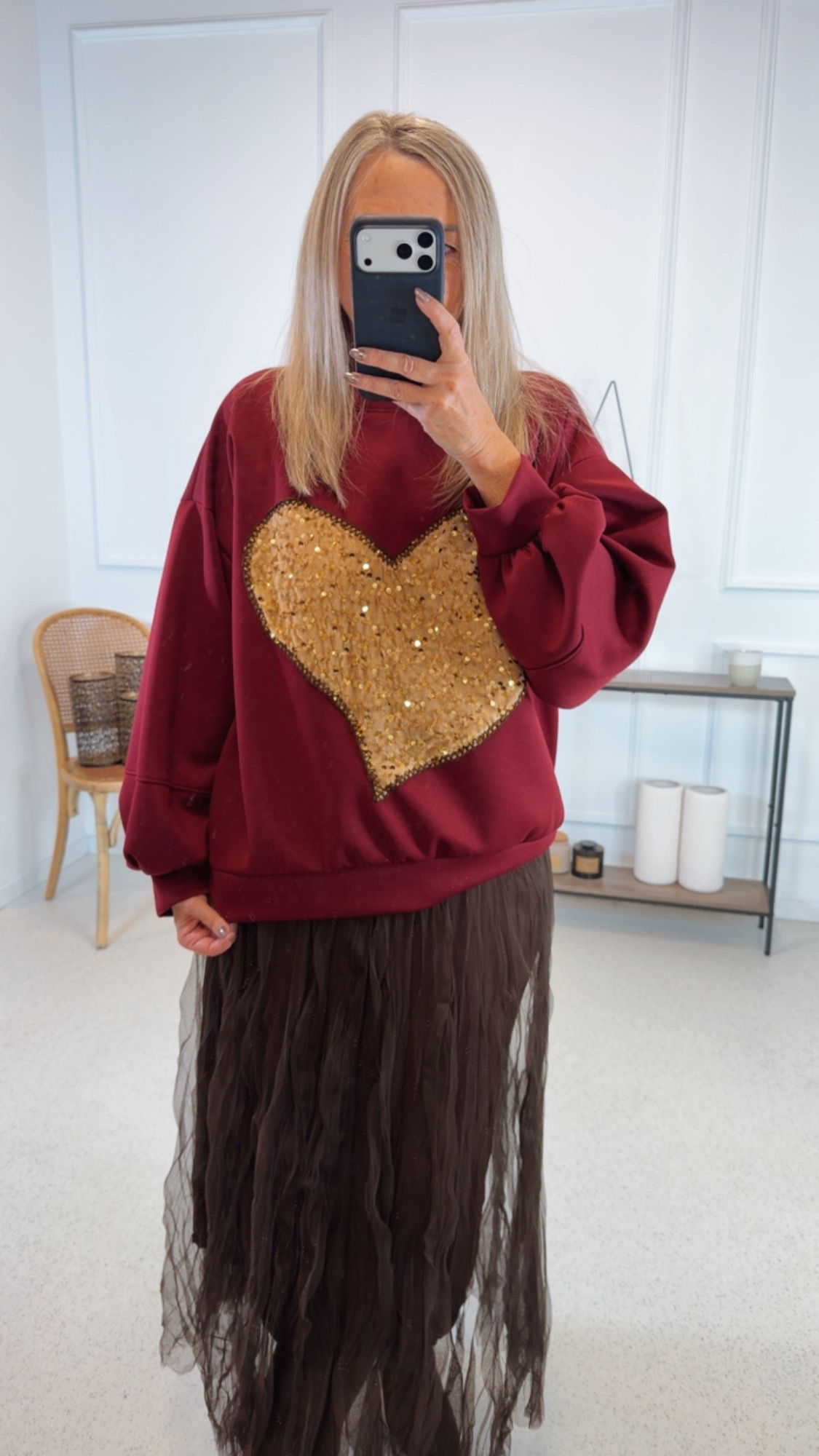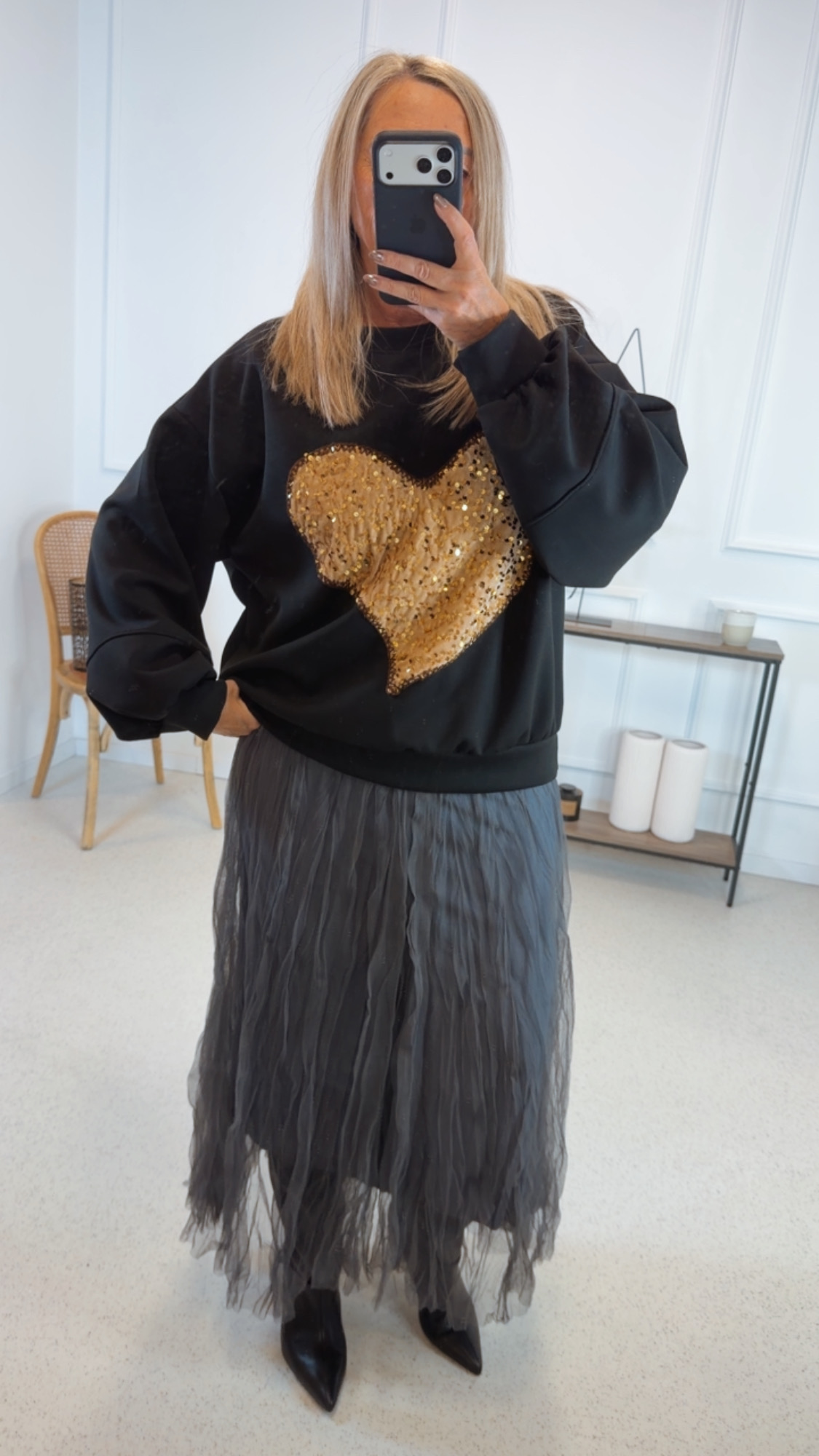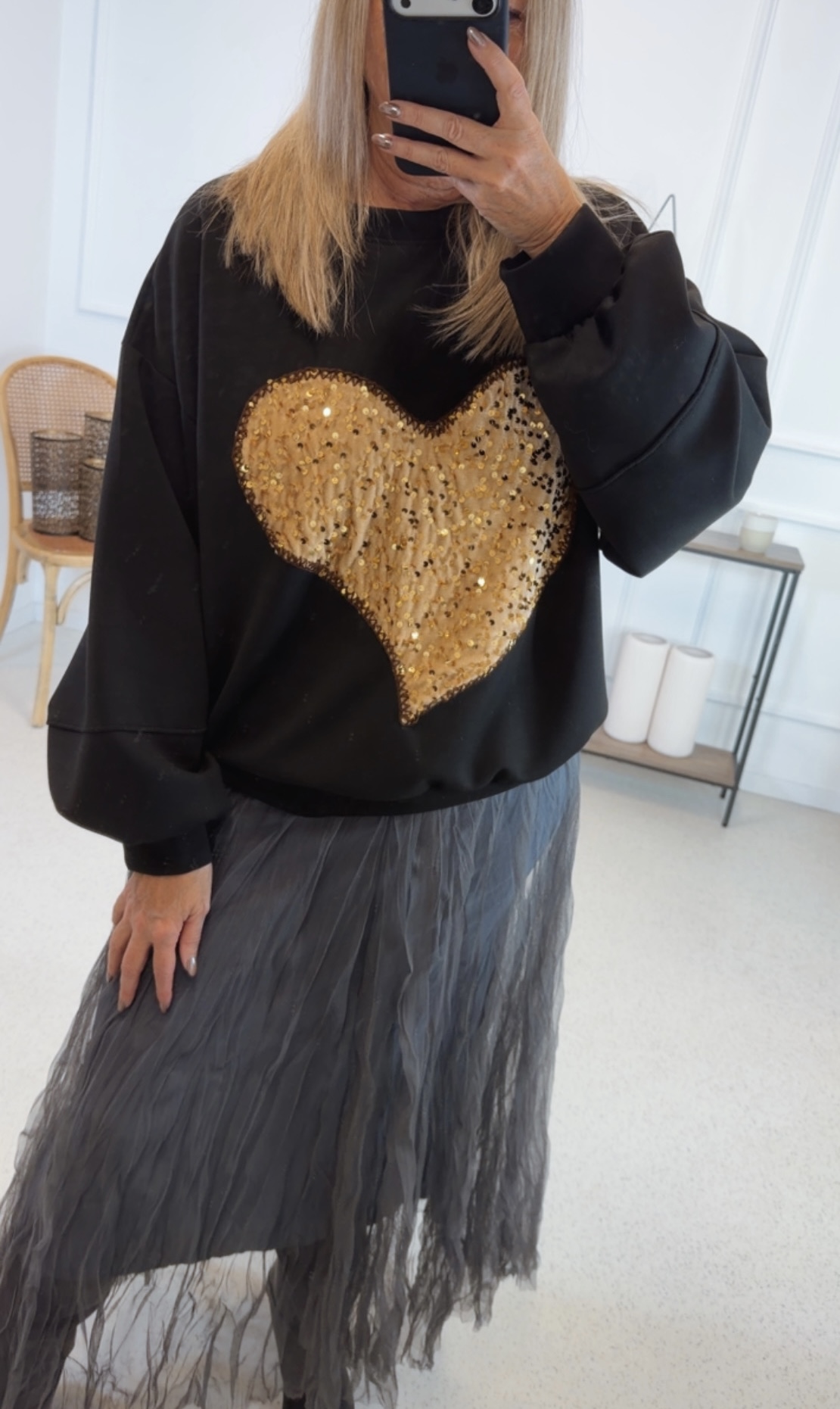 Der wunderschöne Oversize-Pullover „Alma“ begeistert mit einem einzigartigen, trendigen Look und seinem unverwechselbaren GLITZER-HERZ aus Pailletten und Samt. Dieser kurzärmelige Sweater kombiniert modisches Design mit maximalem Wohlfühlfaktor und ist damit ein echtes Must-have für alle, die Style und Komfort lieben.