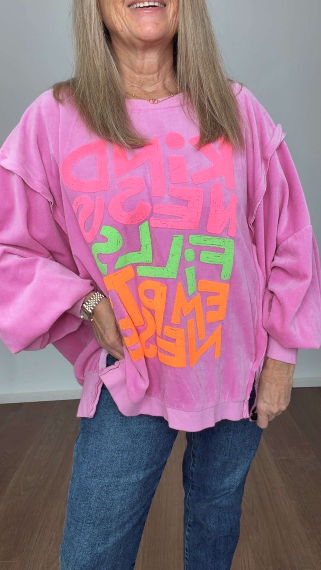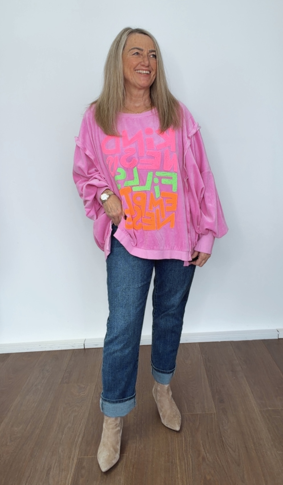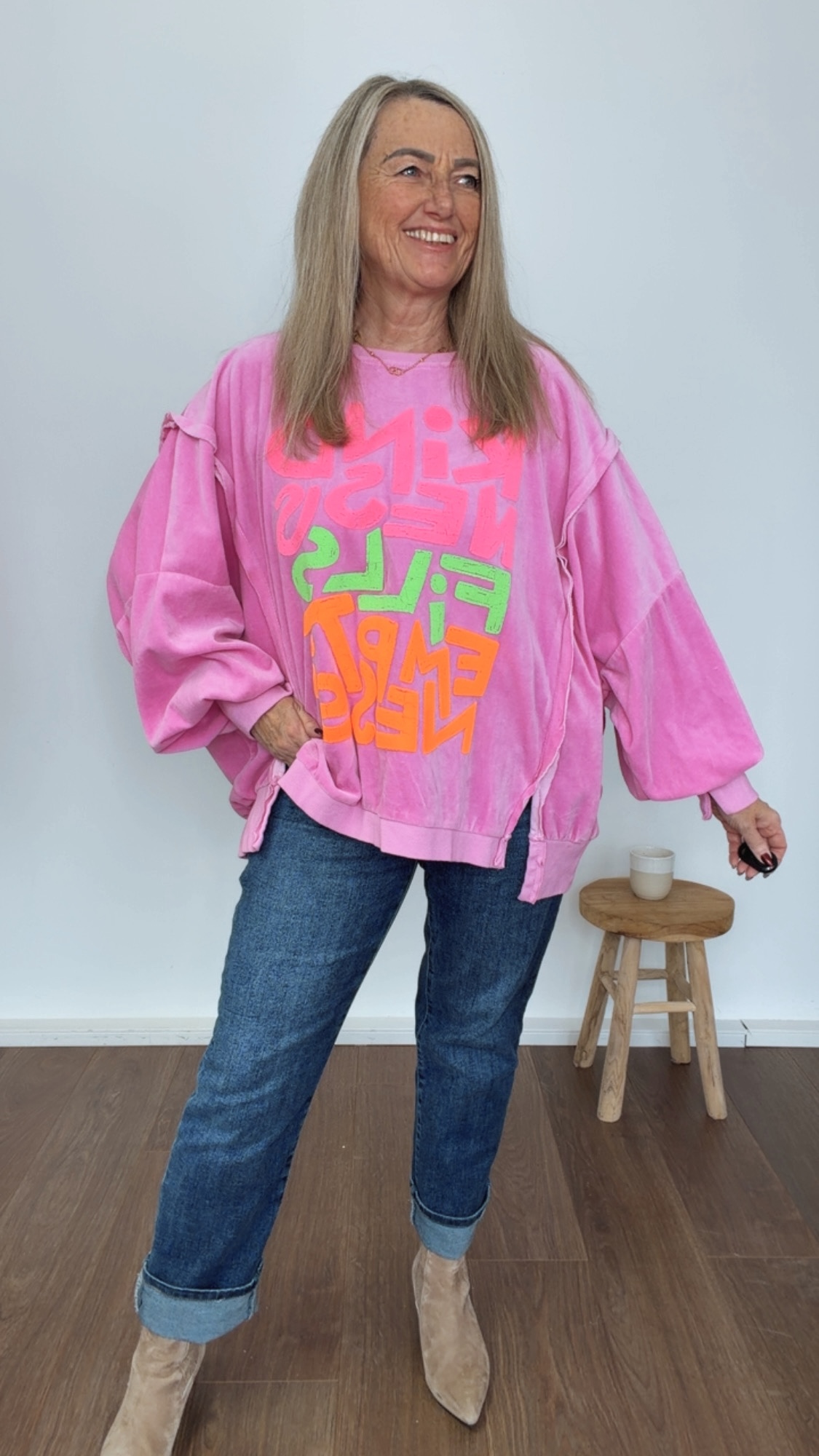 Der Oversize Sweater „Kindness“ überzeugt mit einem trendigen Aufdruck, lässigem Schnitt und einer Tragequalität, die man am liebsten den ganzen Tag genießen möchte. Komplett in weicher Nicki Qualität.