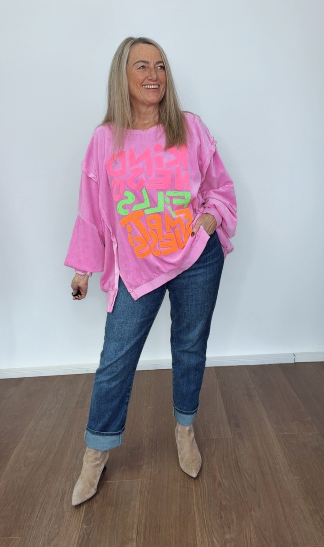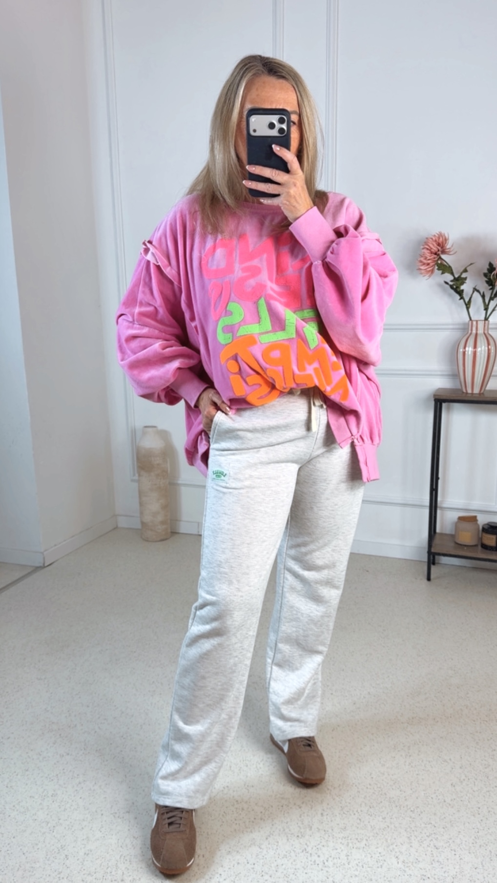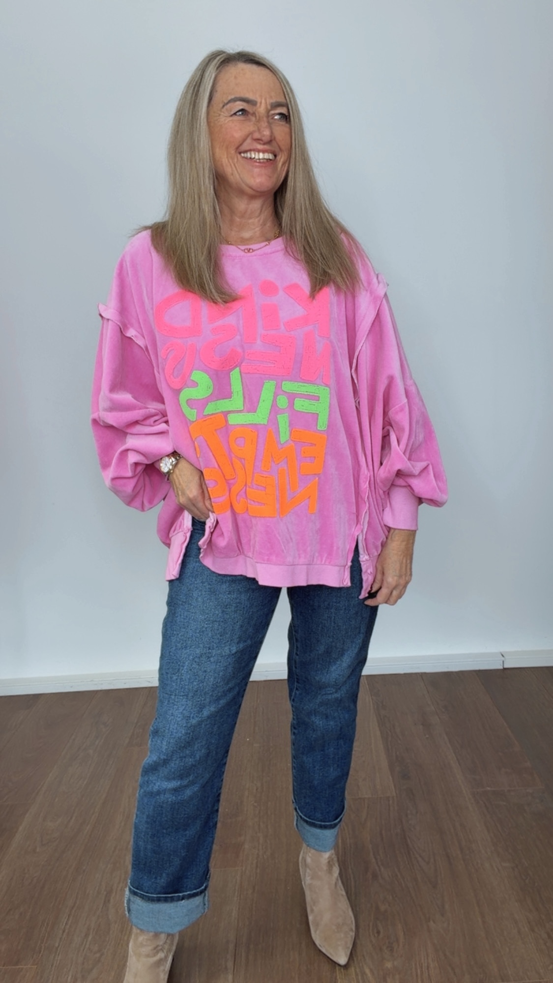 Der Oversize Sweater „Kindness“ überzeugt mit einem trendigen Aufdruck, lässigem Schnitt und einer Tragequalität, die man am liebsten den ganzen Tag genießen möchte. Komplett in weicher Nicki Qualität.