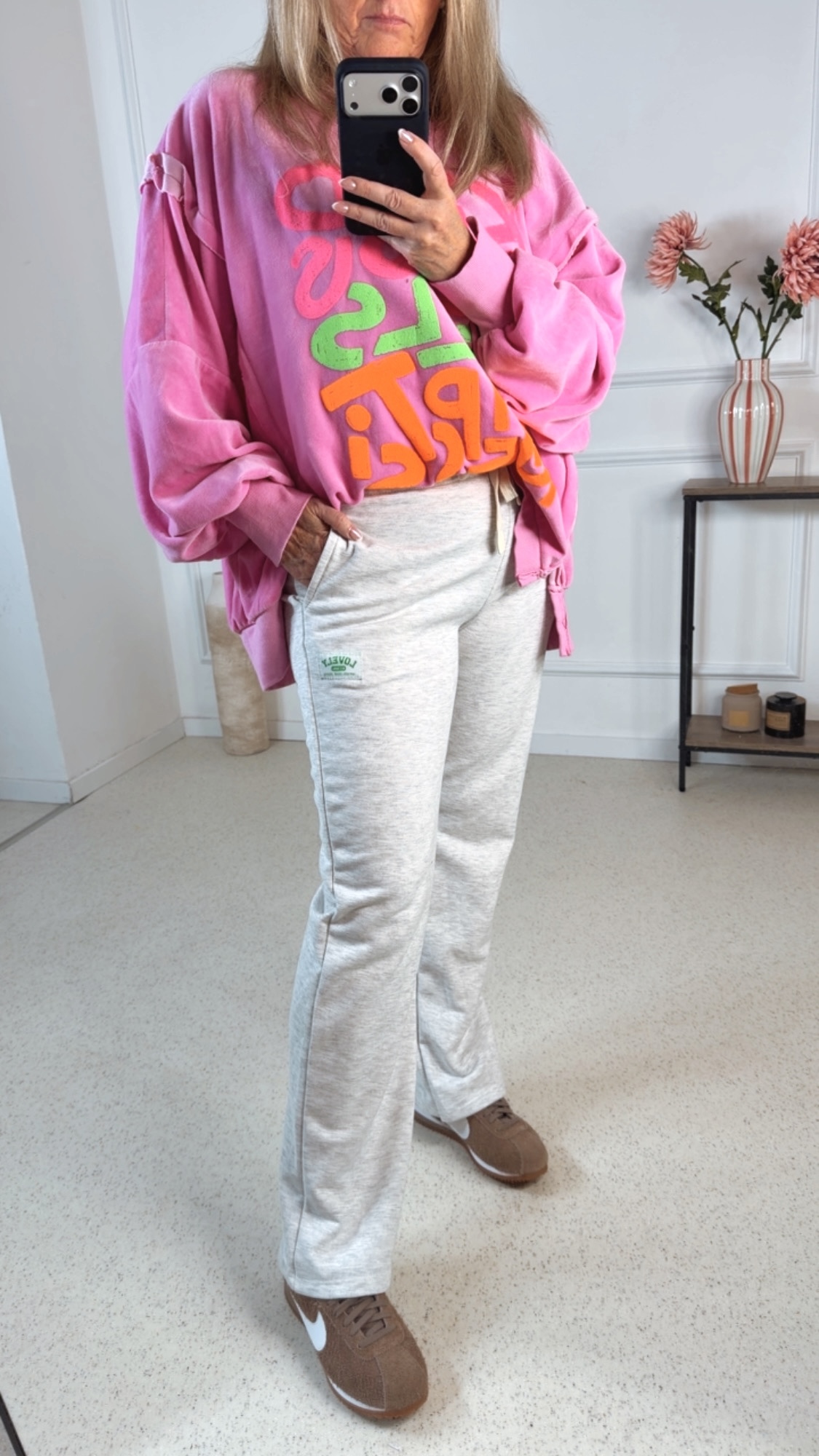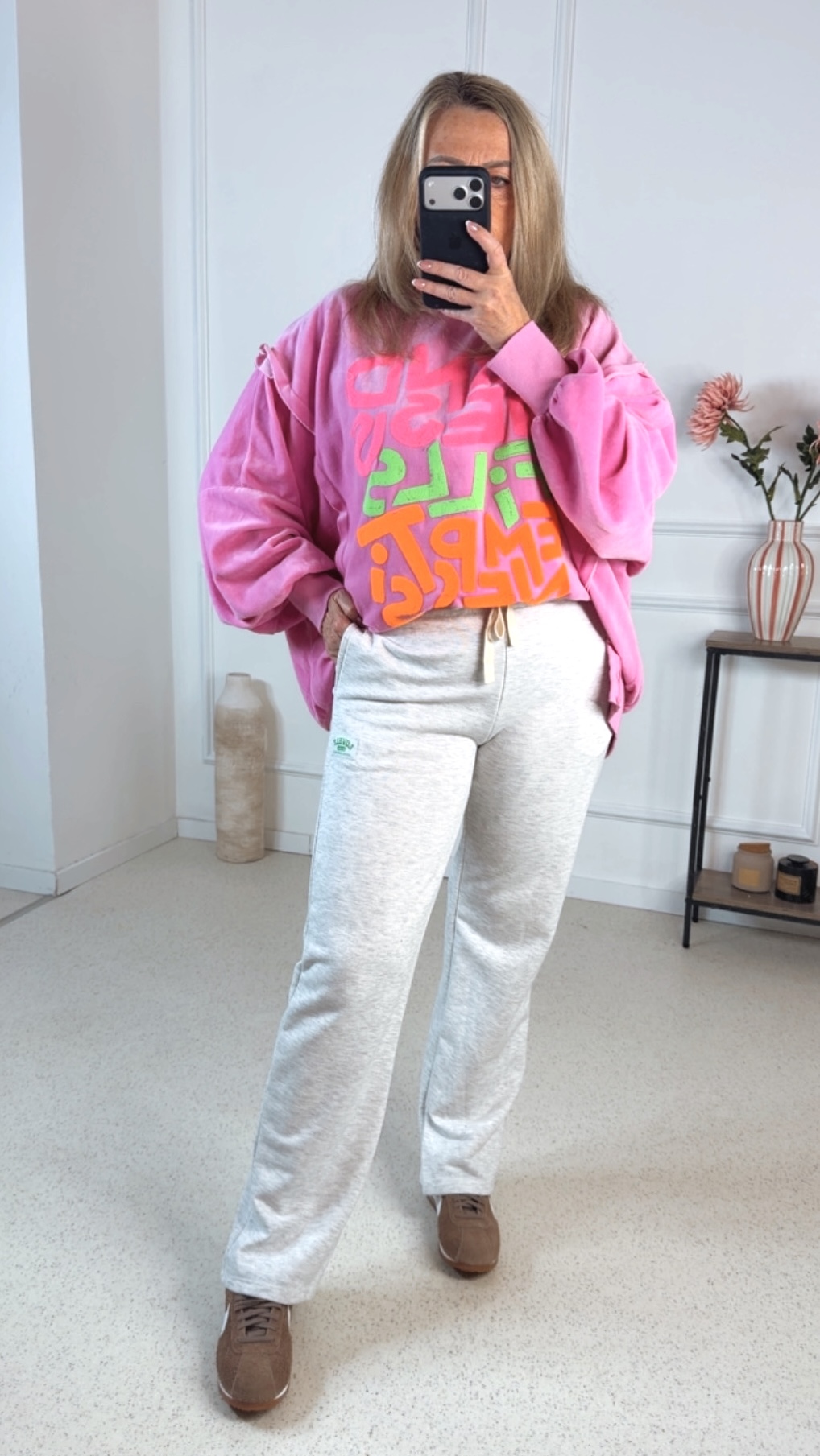 Der Rundhals-Ausschnitt und die bewusst schöne Oversize-Passform sorgen für einen modernen, entspannten Look – perfekt für Alltag, Reisen, Sofa-Momente oder stylische Casual-Outfits.