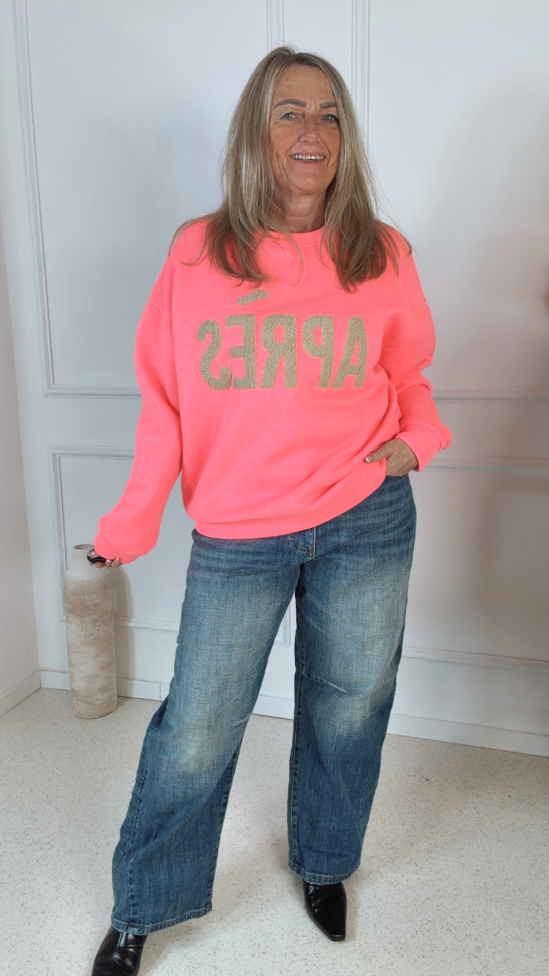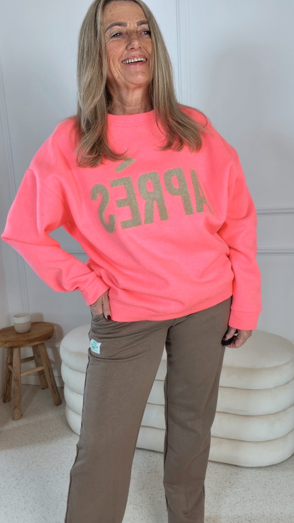 Ein besonderer Hingucker ist der geflockte „APRES“-Print auf der Vorderseite, der dem Look eine stylische und moderne Note verleiht. Der klassische Rundhalsausschnitt rundet das Design zeitlos ab.