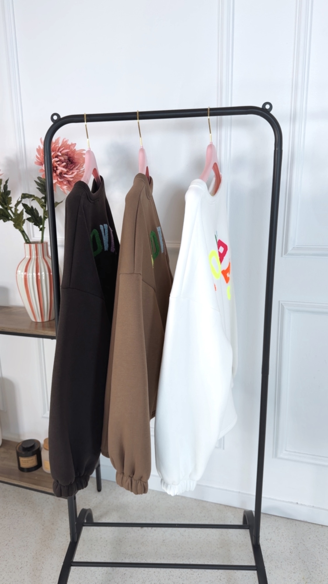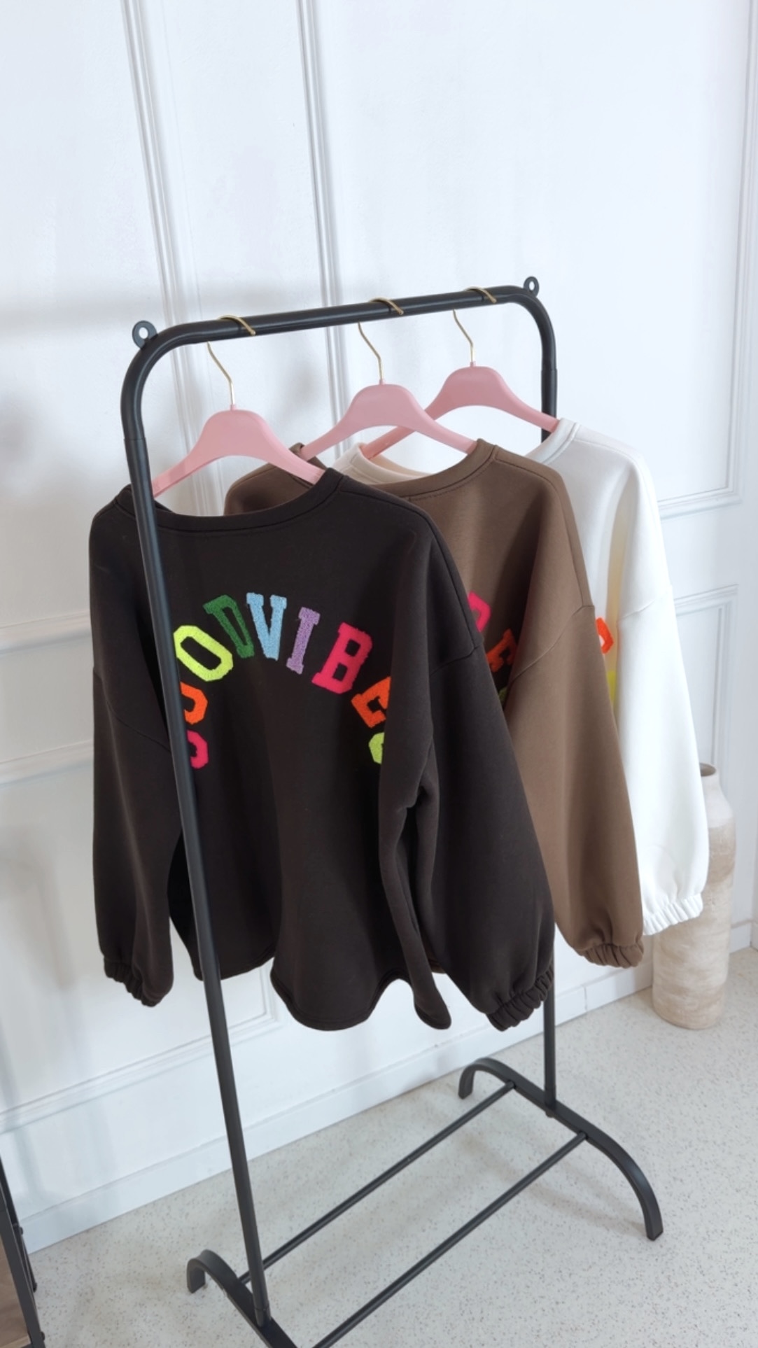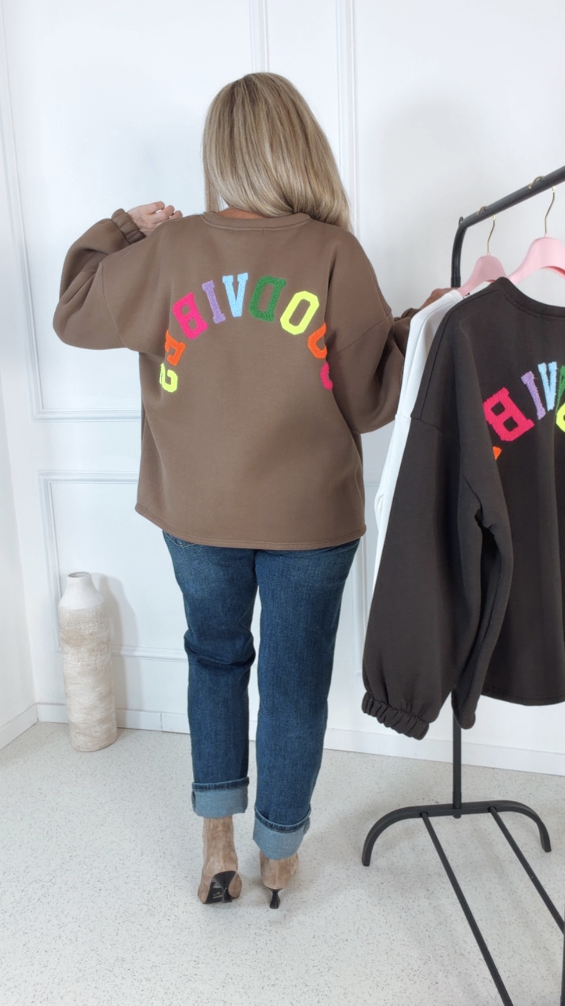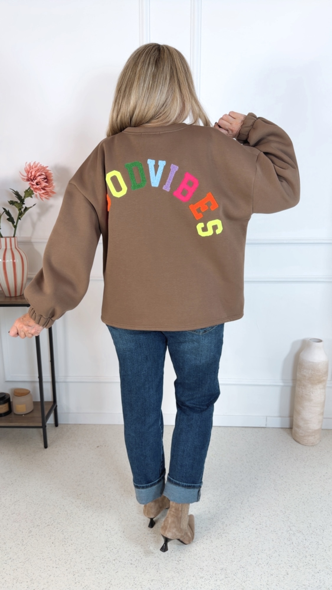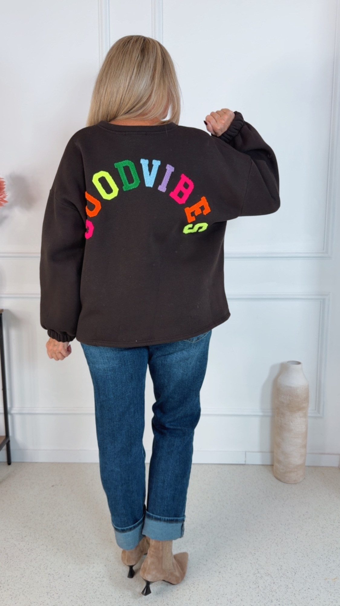 - ✨ Details: Weicher, kuscheliger Sweater Lässiger Oversize-Schnitt Bunter Schriftzug „GOODVIBES“ am Rücken