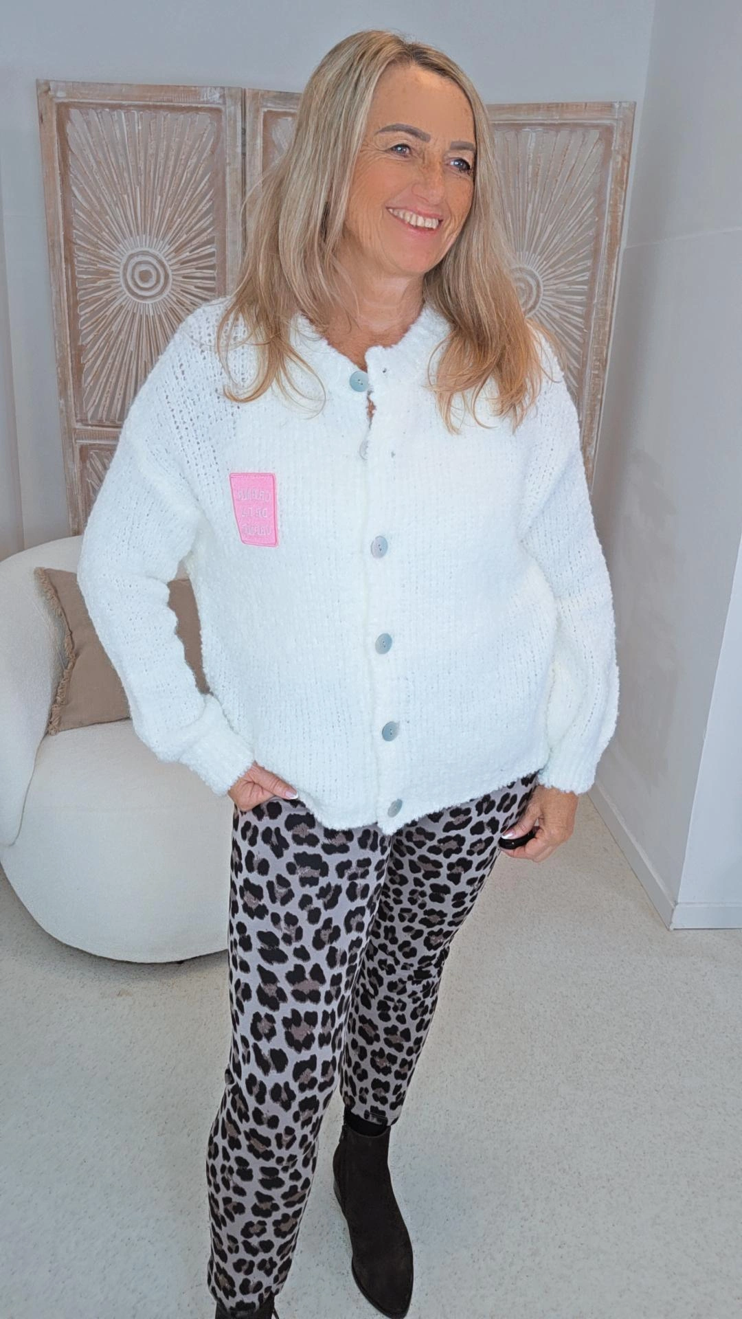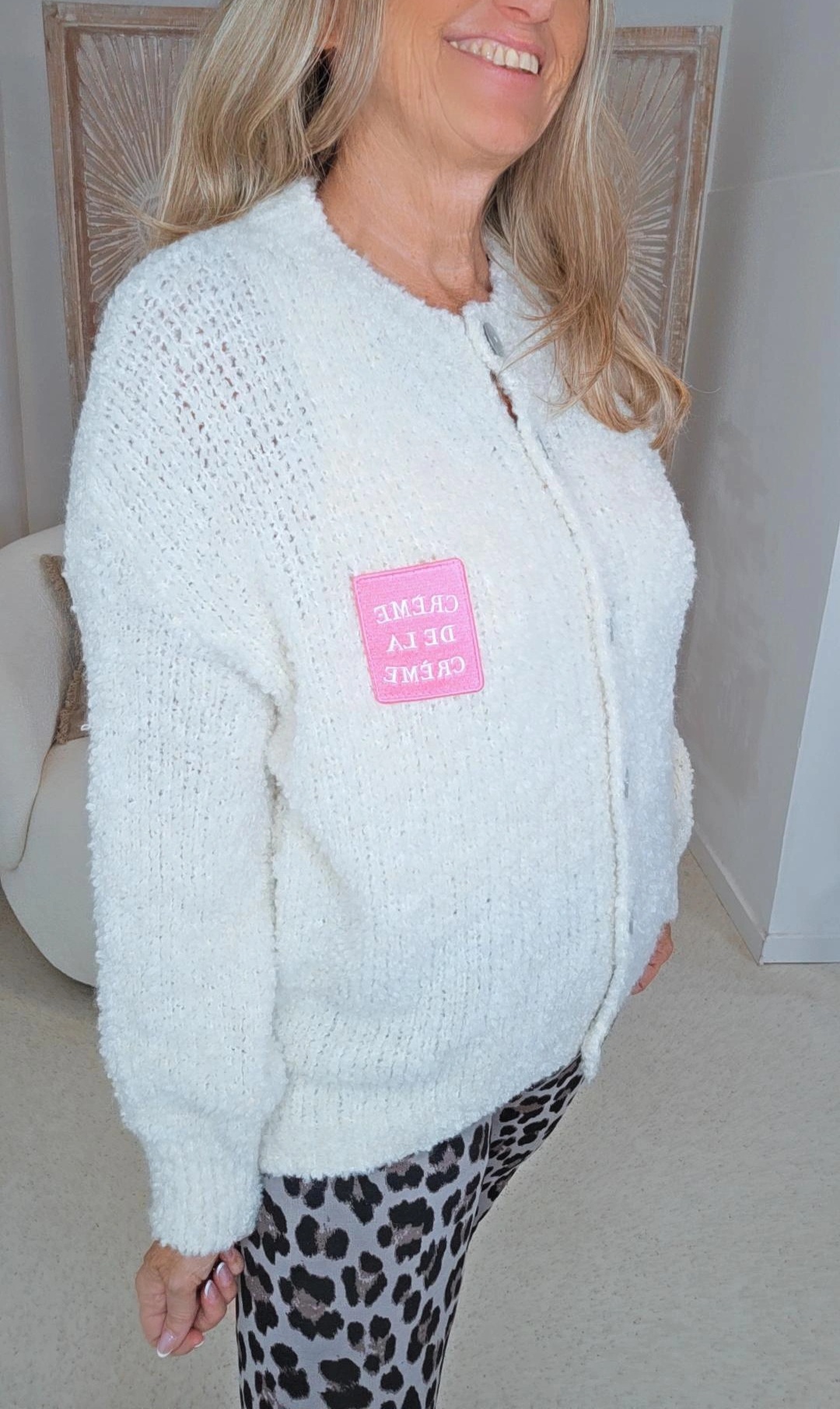 CREME BOUCLÉCARDIGAN MINNIE RUNDHALS UNI MIT PATCH.2