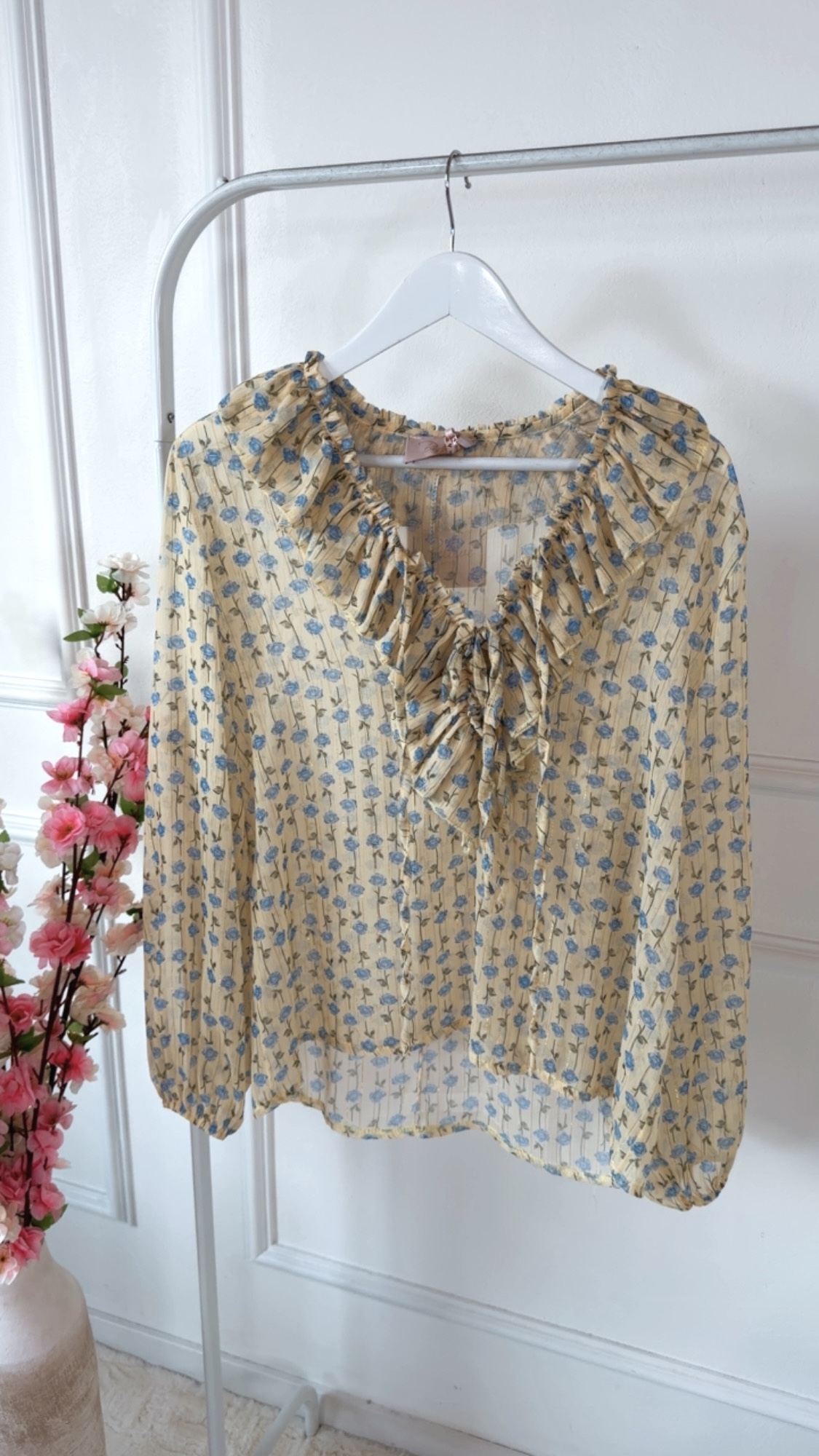 Bluse „AURORA“ – romantische Rüschenbluse mit zartem Blumenprint gelb
