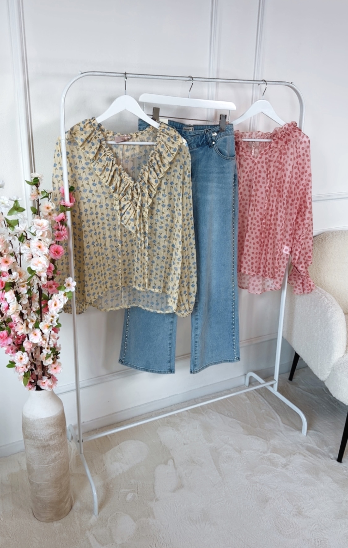 Bluse „AURORA“ – romantische Rüschenbluse mit zartem Blumenprint