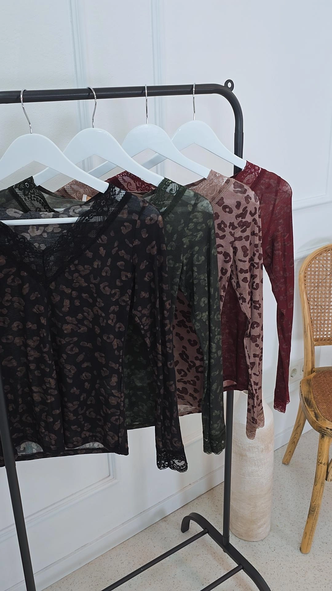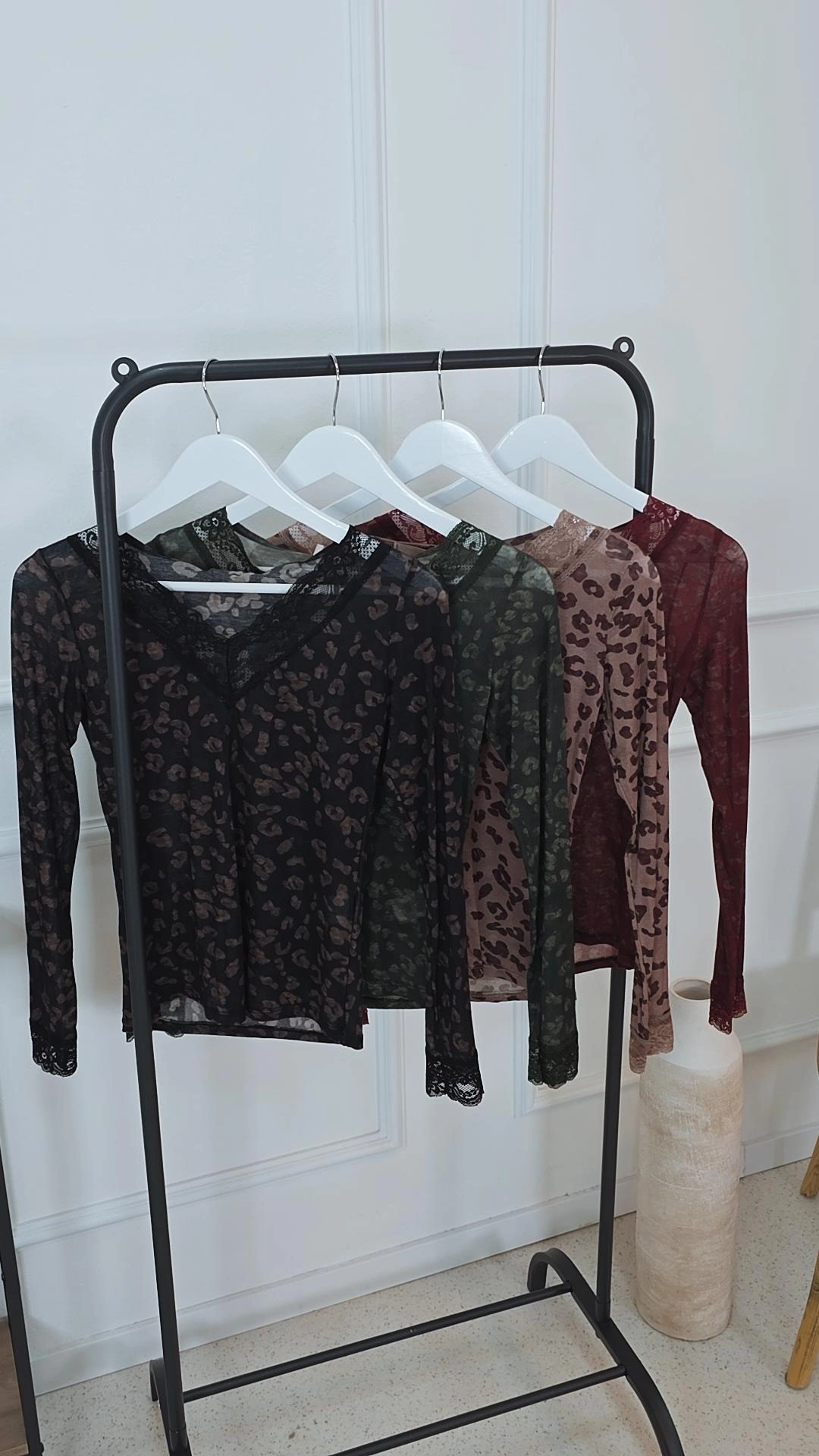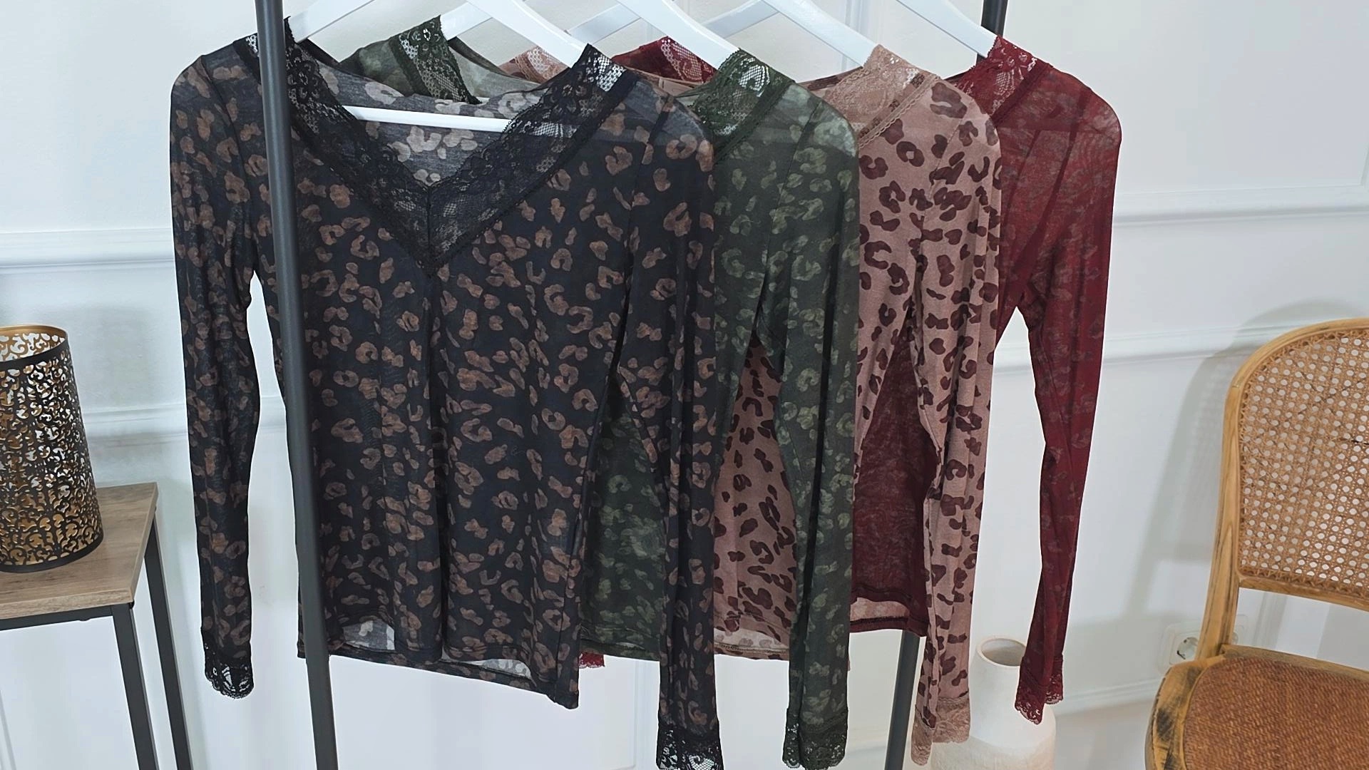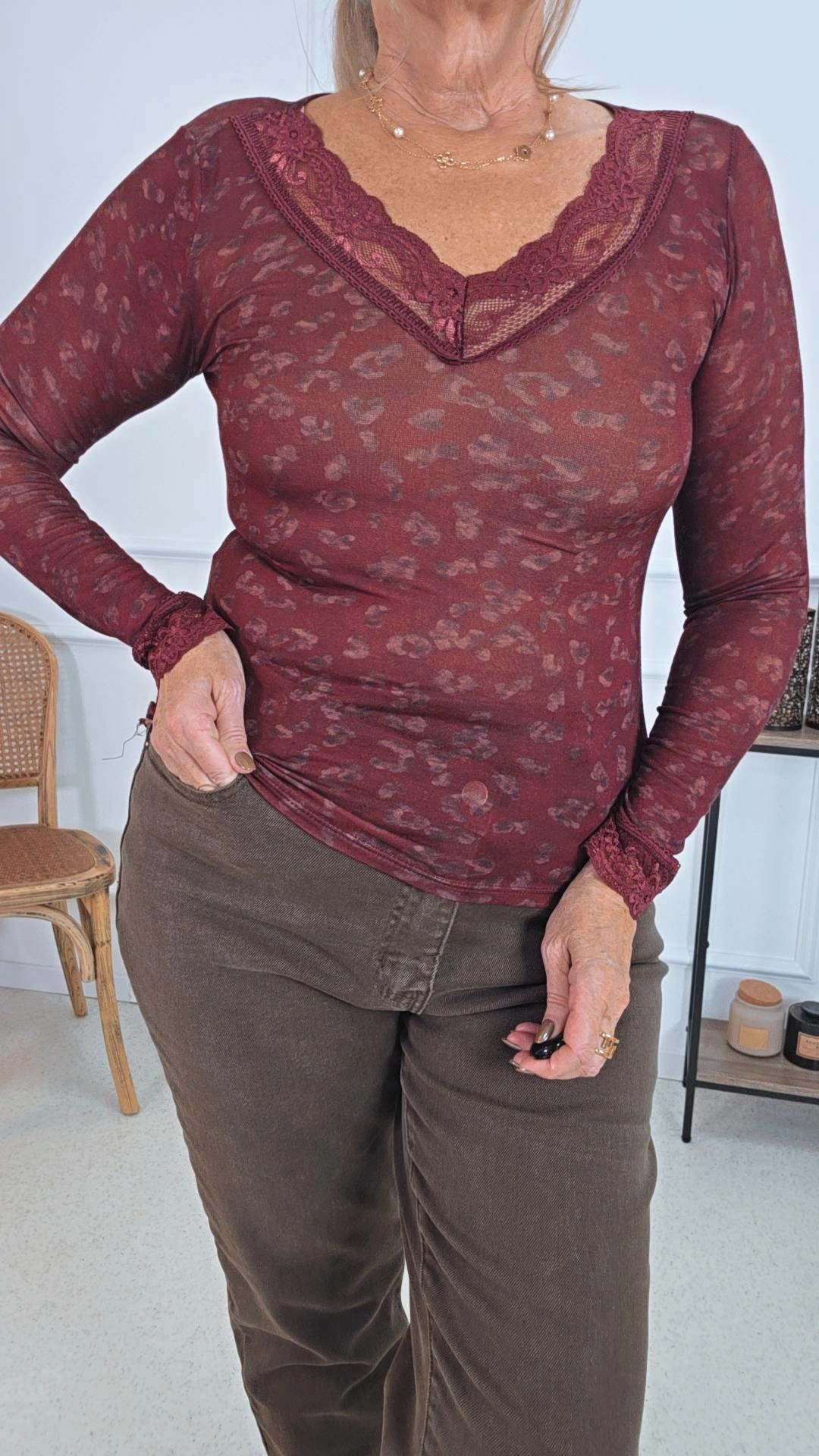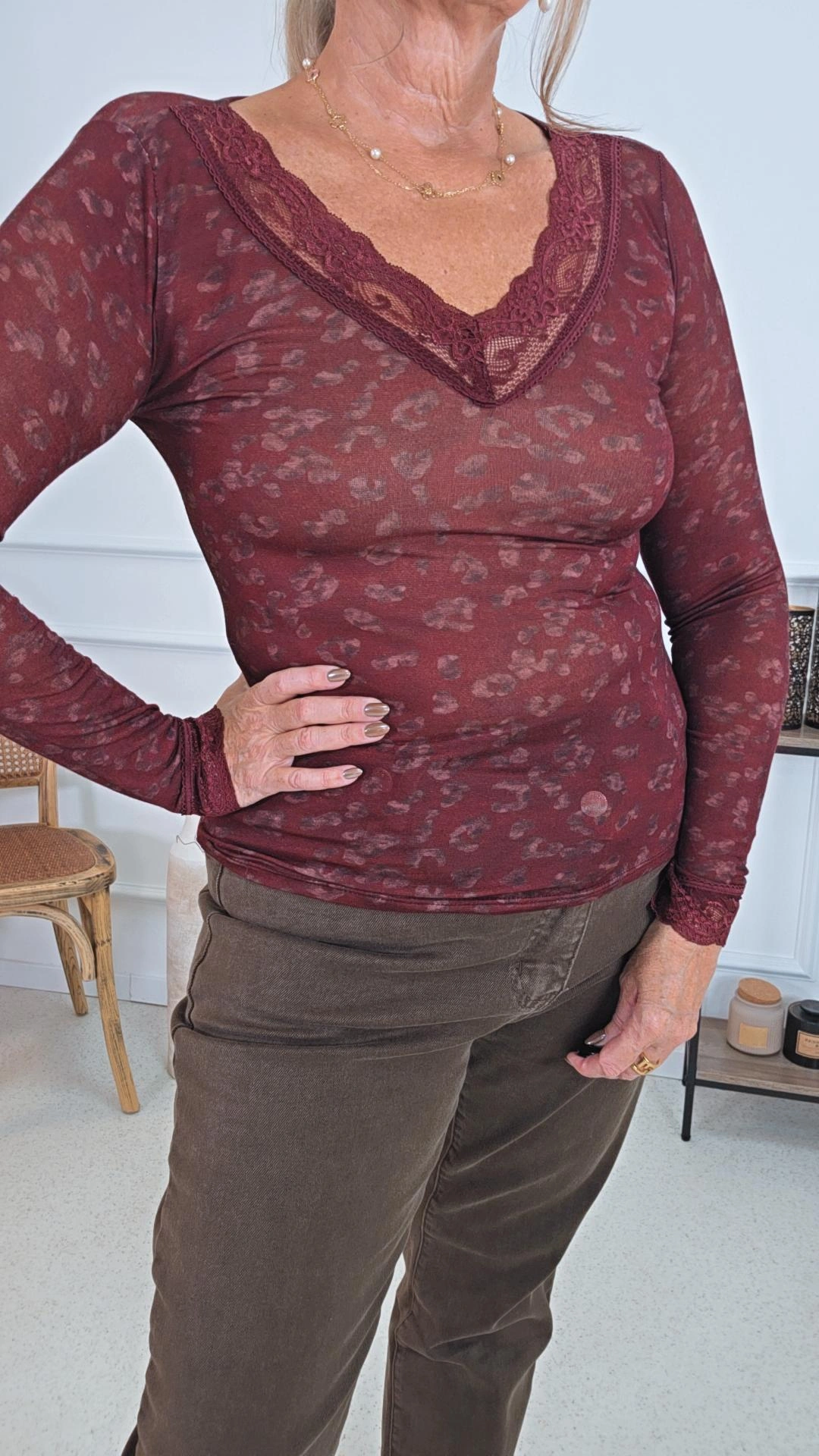 Zarte Spitzendetails an V-Ausschnitt und Ärmeln verleihen dem Shirt eine feminine Note und machen es zu einem echten Blickfang. Das Leomuster rundet den Look elegant ab.