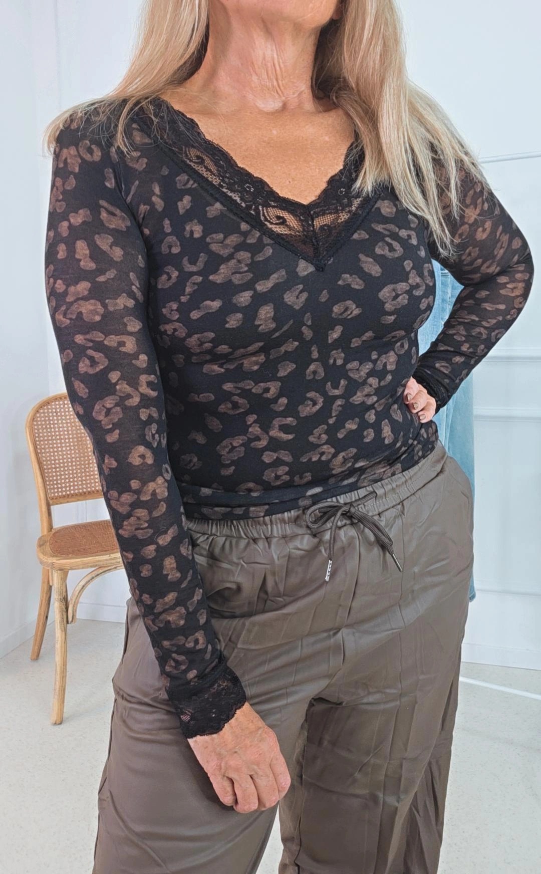 Zarte Spitzendetails an V-Ausschnitt und Ärmeln verleihen dem Shirt eine feminine Note und machen es zu einem echten Blickfang. Das Leomuster rundet den Look elegant ab.