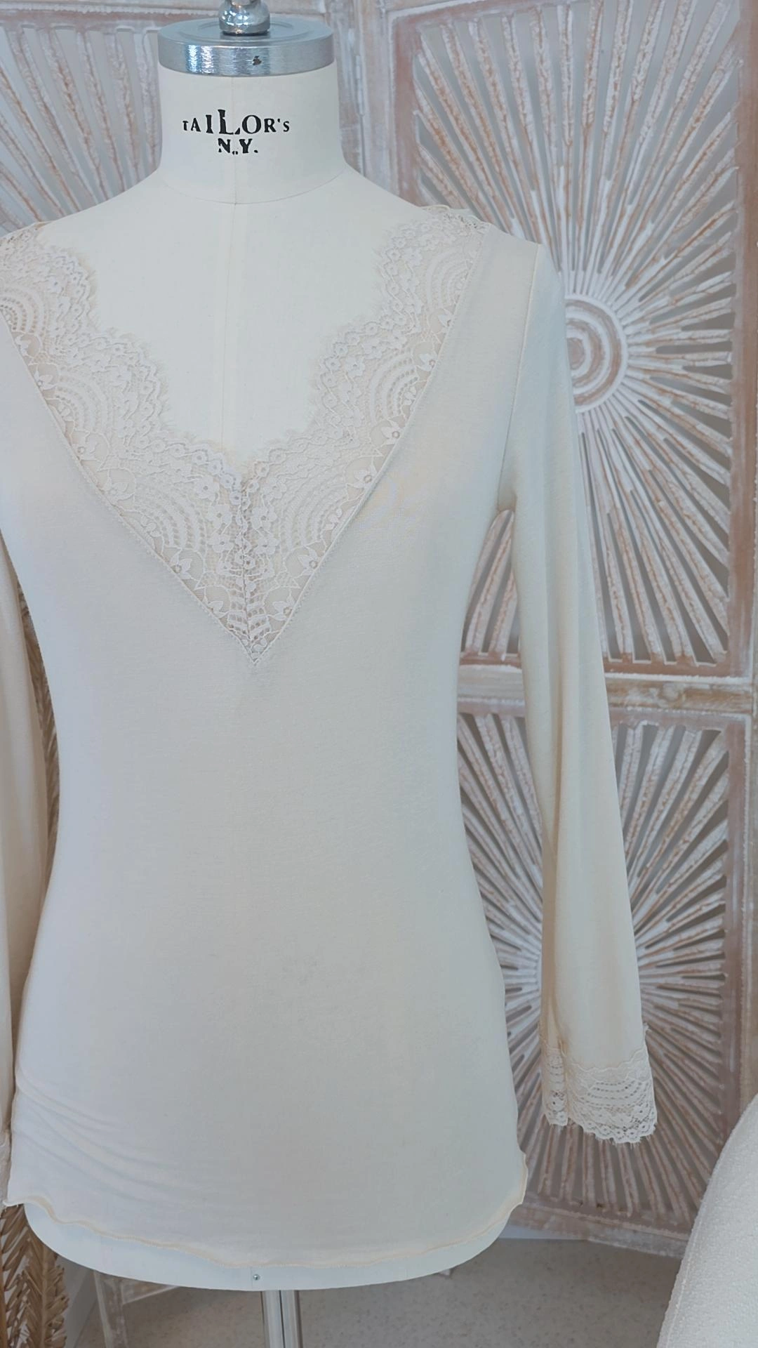 CASHMERE SHIRT ADRIANA MIT SPITZE an Ärmel & V-Ausschnitt, Stretchy 34-40/42 Made in Italy Longsleeve/langarm