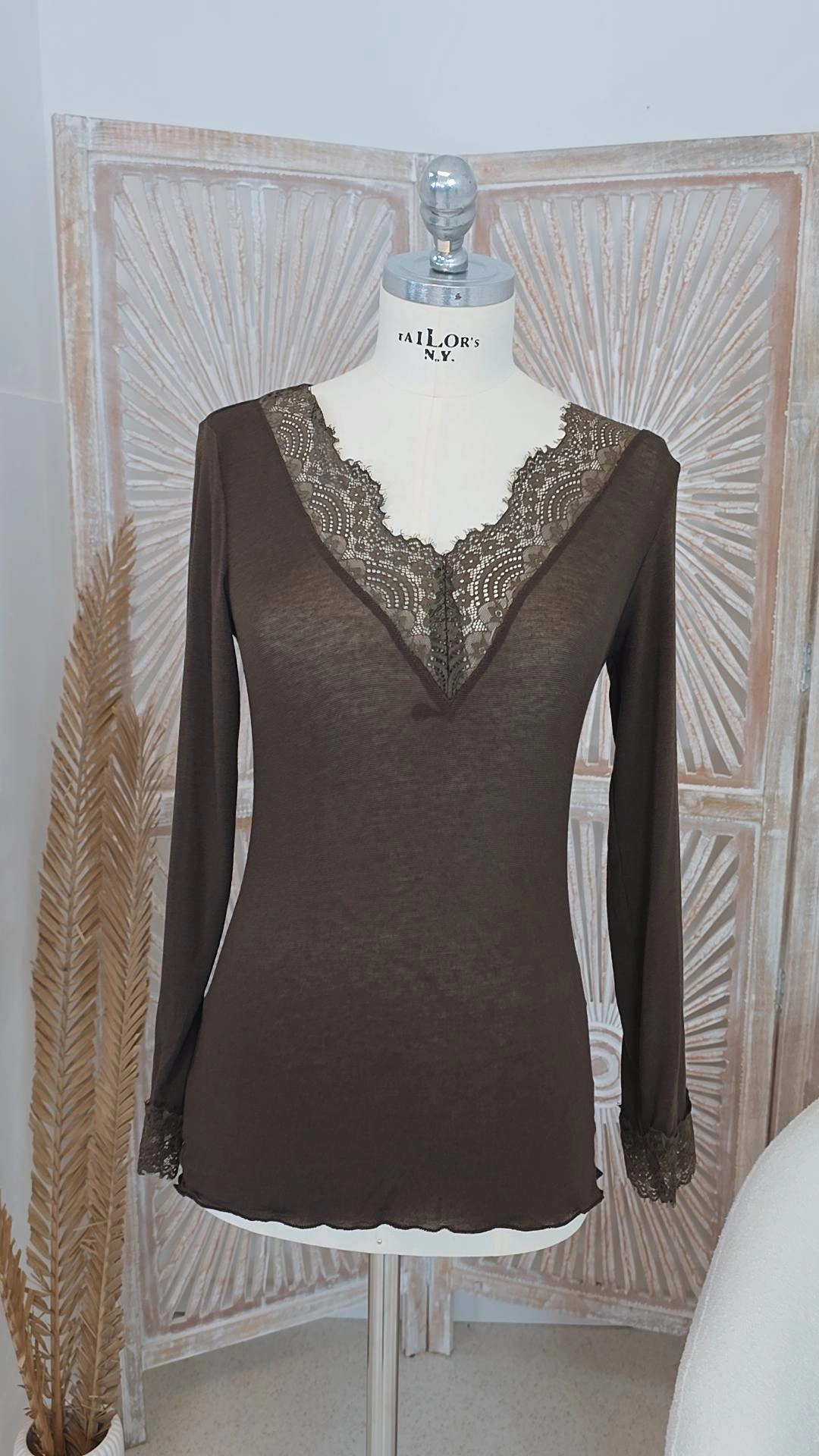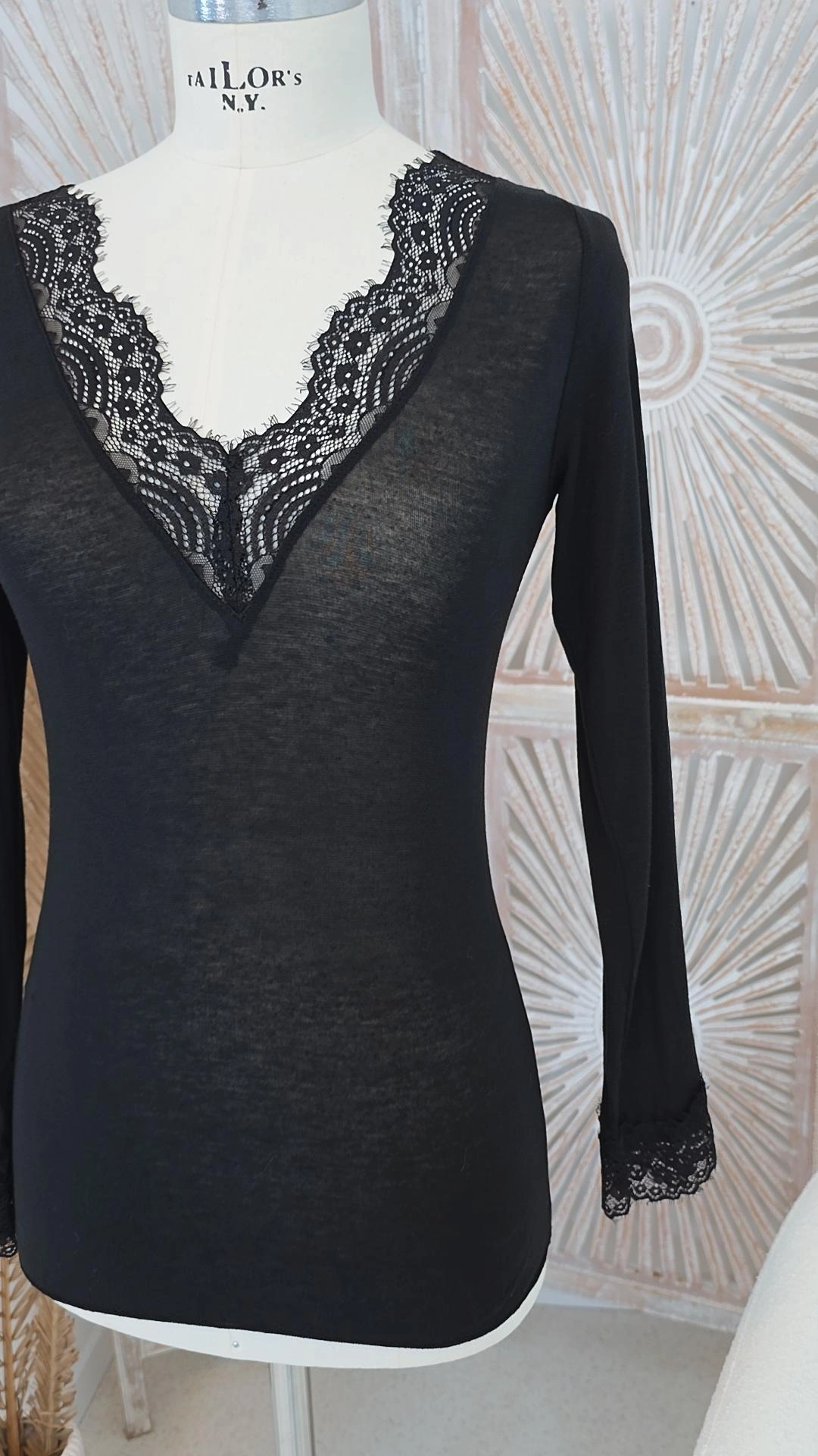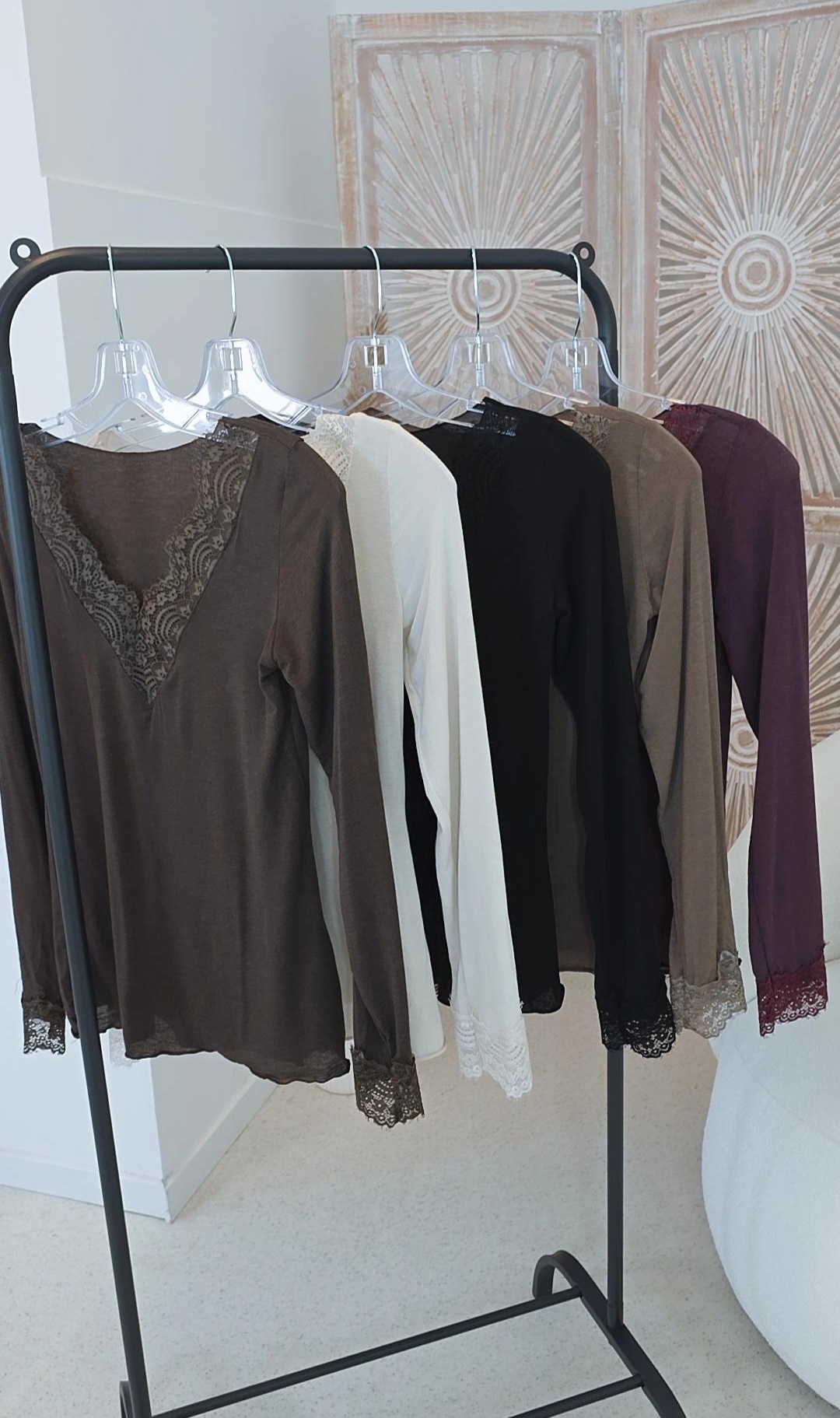 CASHMERE SHIRT ADRIANA MIT SPITZE an Ärmel & V-Ausschnitt, Stretchy 34-40/42 Made in Italy Longsleeve/langarm