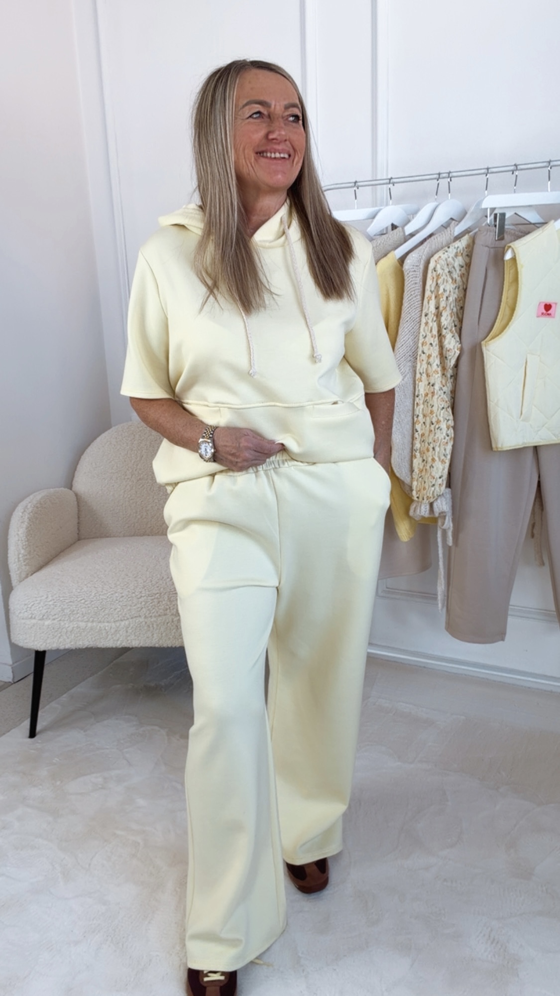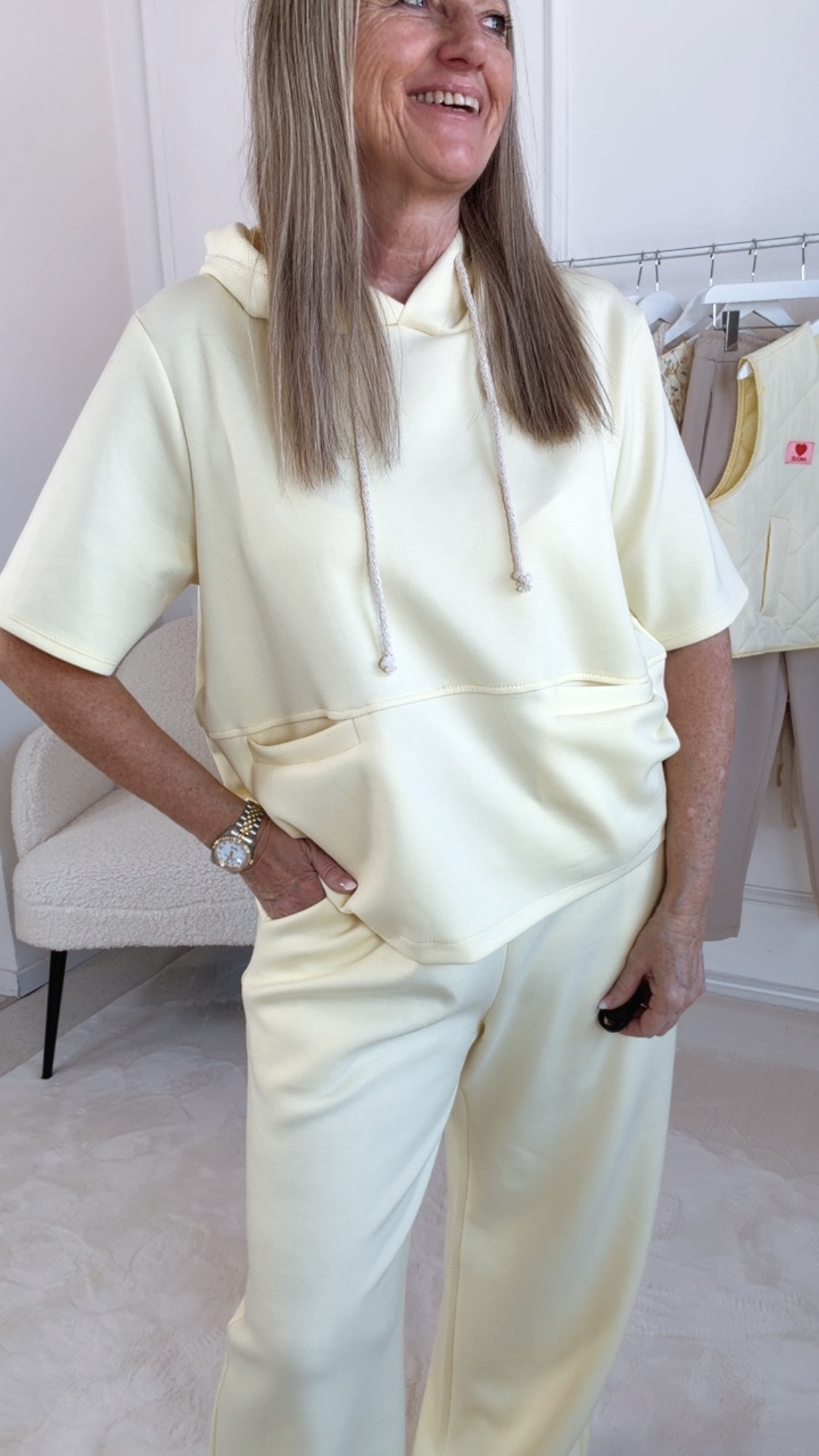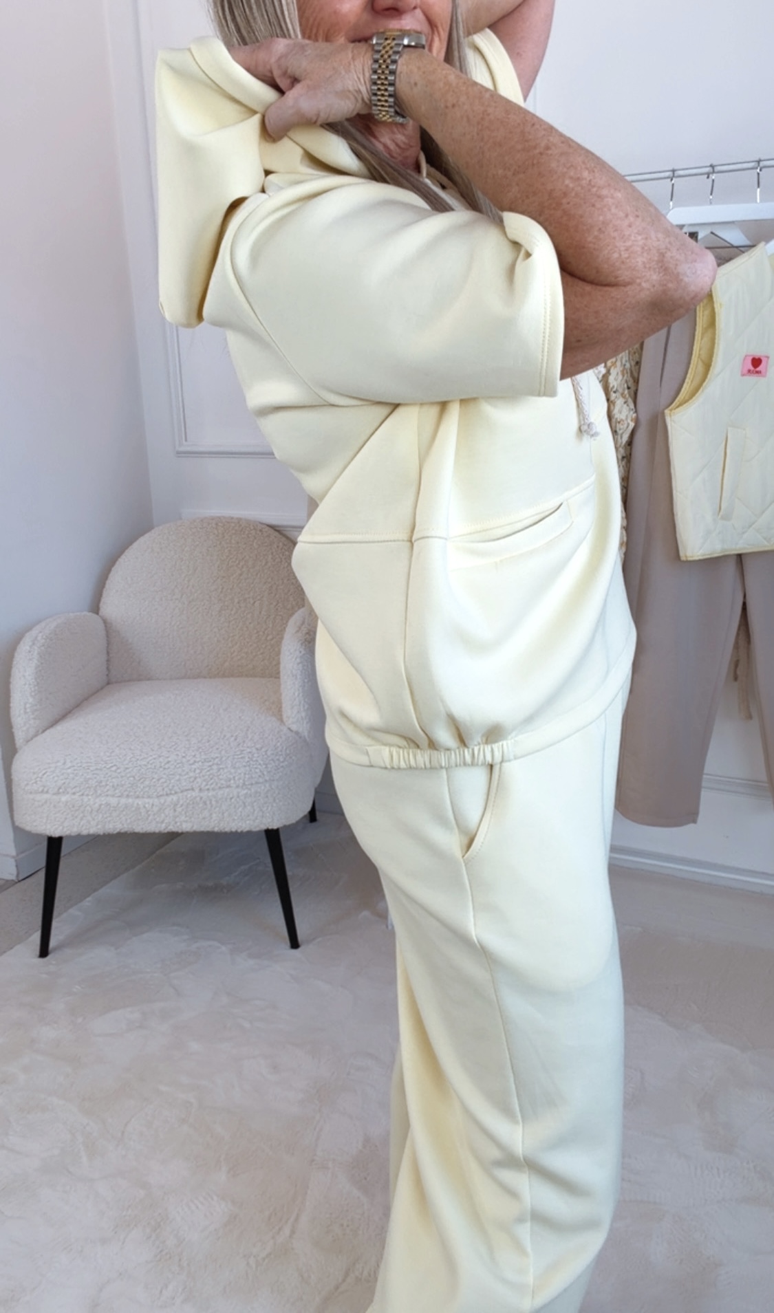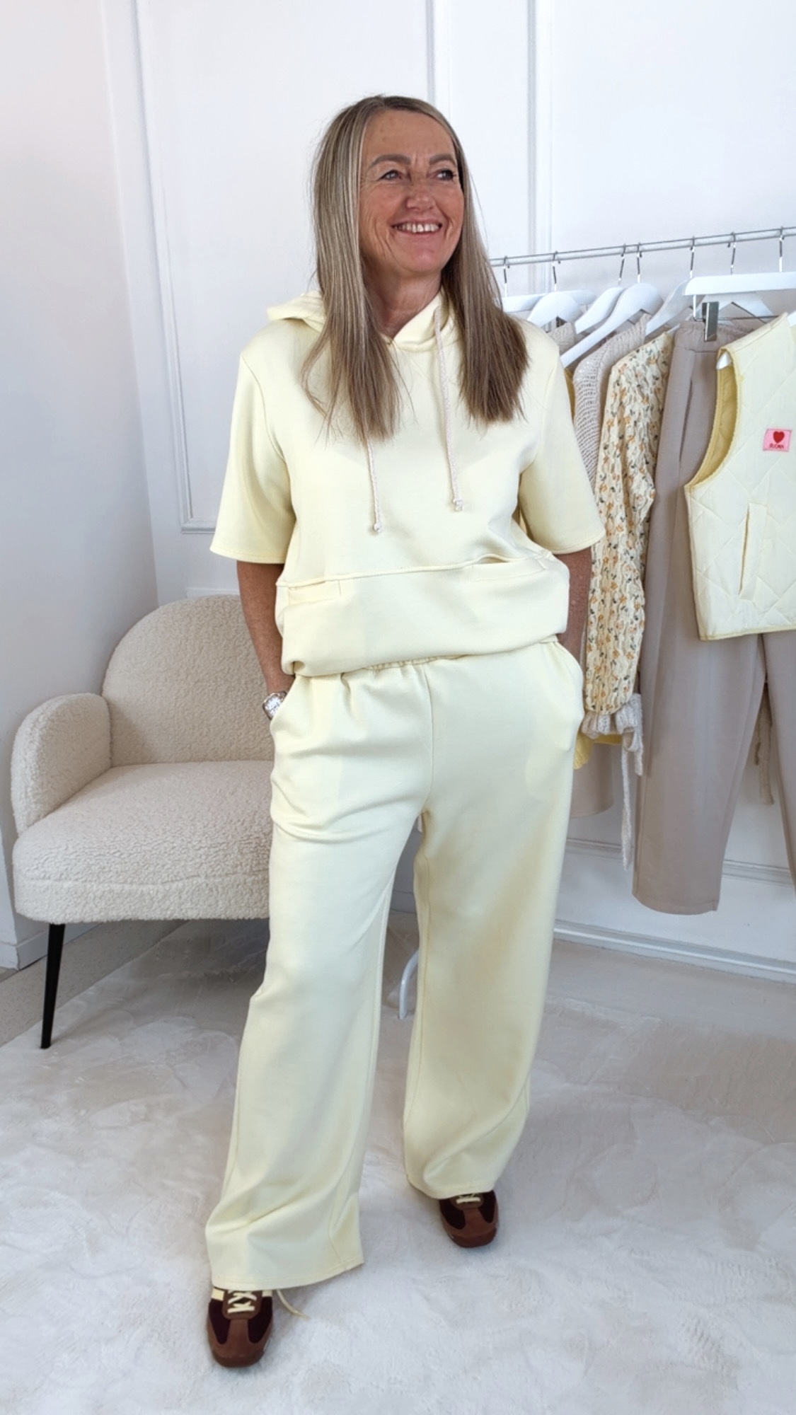 Unser zweiteiliges Comfy-Set „Giulia“ vereint lässigen Style mit maximalem Wohlfühlfaktor. Das Set besteht aus einem locker geschnittenen Kurzarm-Hoodie mit praktischen Taschen und einer weit fallenden Hose mit bequemem Gummibund. Der fließende Schnitt sorgt für eine moderne Silhouette und ein entspanntes Tragegefühl.