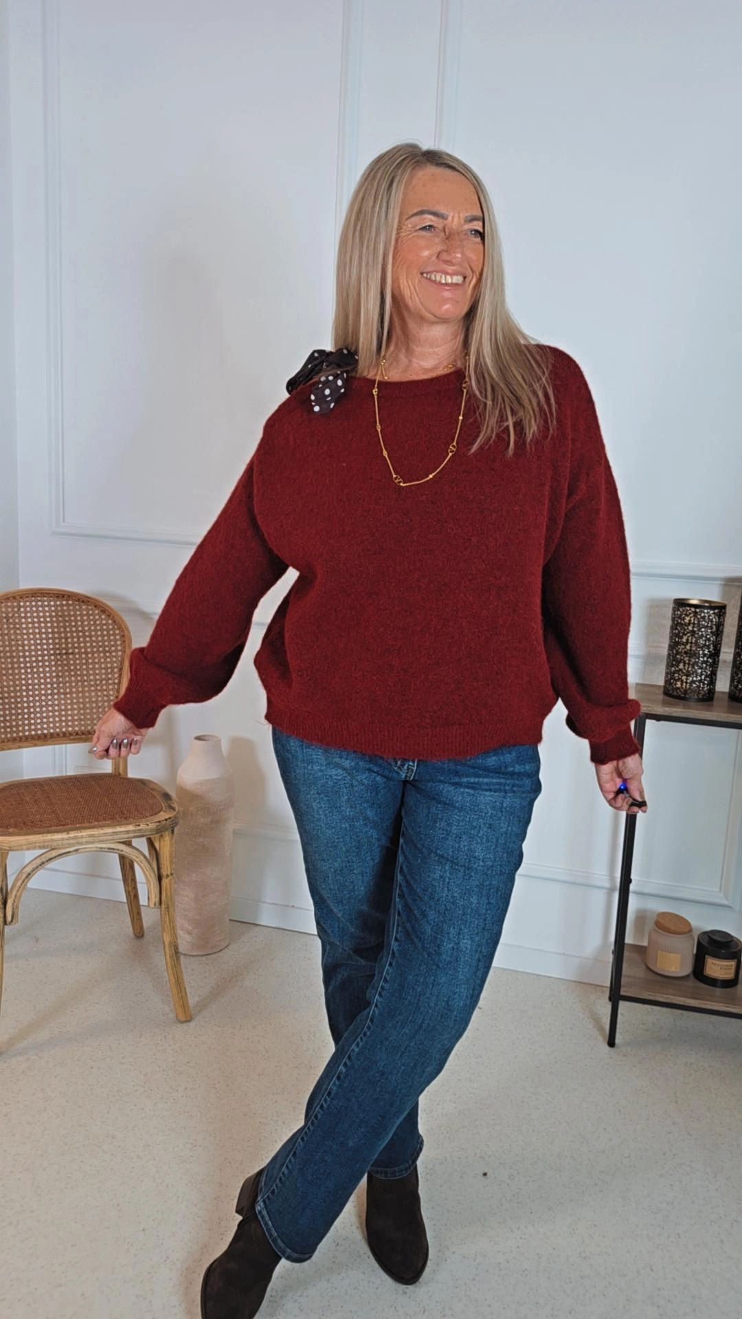 Dank der One-Size-Passform (34–44) schmeichelt der Pullover verschiedensten Figuren und sitzt bequem und lässig. Unser Model ist 1,64 m groß und zeigt, wie vielseitig sich Macy stylen lässt – ob casual zu Jeans oder feminin zum Rock.