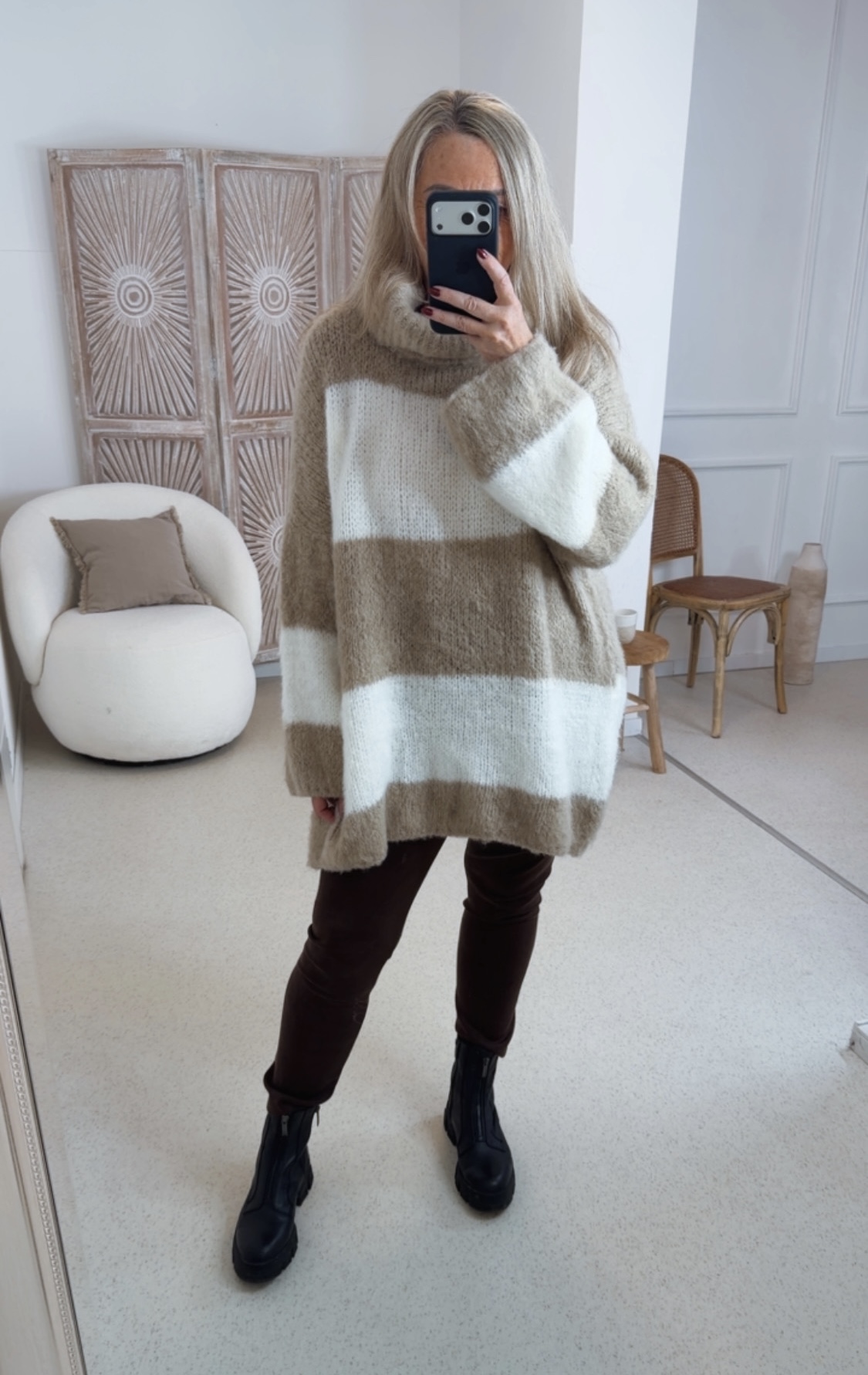 Der Helsinki ist ein vielseitiger, angenehm weicher Strick, der sowohl als Pullover als auch als kurzes Kleid getragen werden kann. Die breiten Streifen verleihen ihm einen modernen, entspannten Look, während der lässige Schnitt für hohen Tragekomfort sorgt.