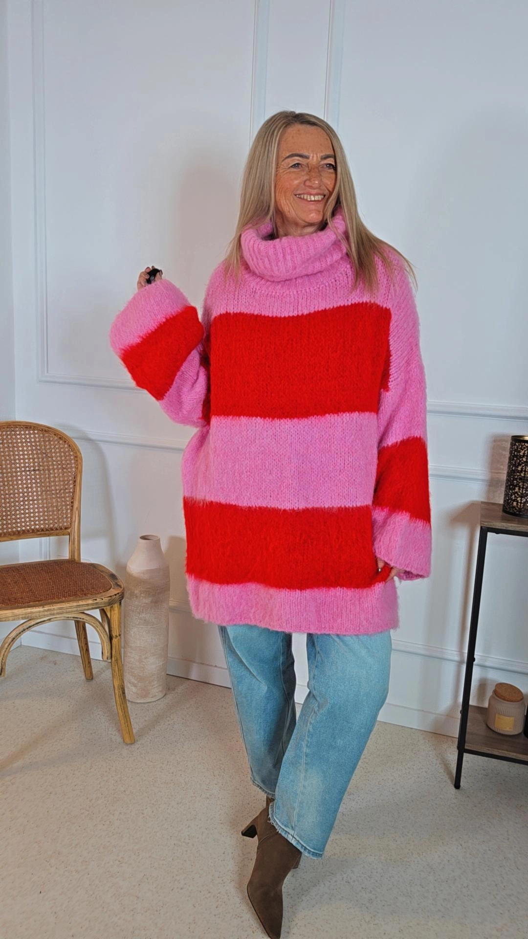 Der Helsinki ist ein vielseitiger, angenehm weicher Strick, der sowohl als Pullover als auch als kurzes Kleid getragen werden kann. Die breiten Streifen verleihen ihm einen modernen, entspannten Look, während der lässige Schnitt für hohen Tragekomfort sorgt.