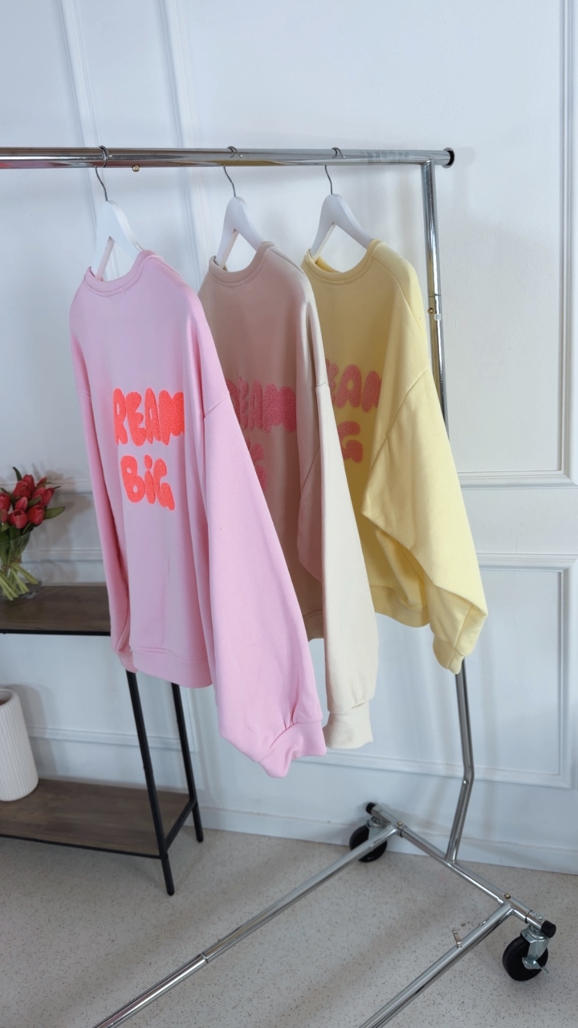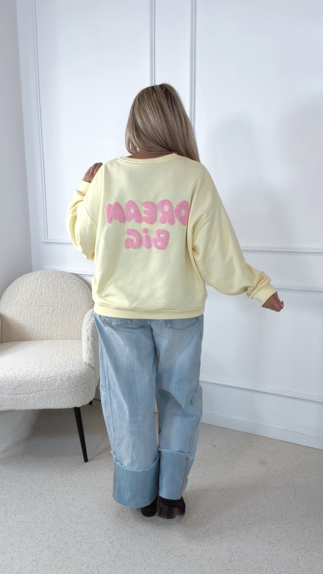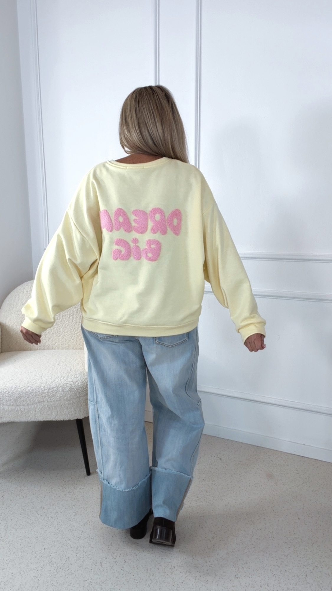 Der beflockte Rückenaufdruck „Dream Big“ setzt ein starkes Highlight und überzeugt durch seine hochwertige, samtige Haptik. Der bequeme Schnitt und das angenehm weiche Material machen den Sweater zum perfekten Begleiter für jeden Tag.