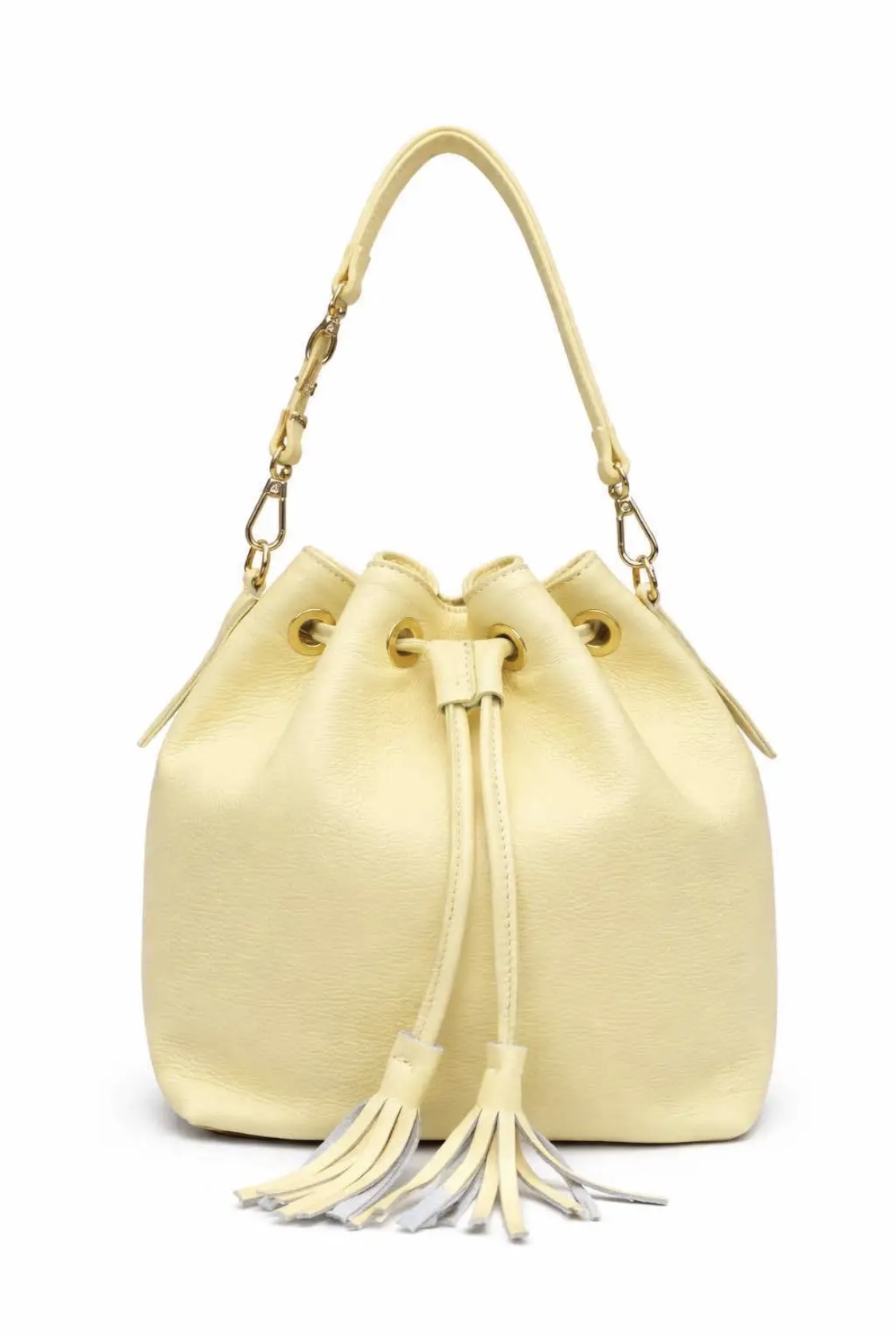 Diese wunderschöne Beuteltasche aus echtem Leder – Made in Italy vereint zeitlose Eleganz mit moderner Leichtigkeit. Das geschmeidige, hochwertig verarbeitete Leder und die goldfarbenen Metallösen verleihen der Tasche eine edle Ausstrahlung, während die dekorativen Lederquasten am Zugband einen femininen, modischen Akzent setzen.