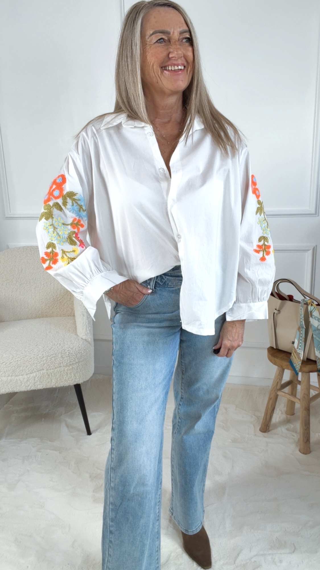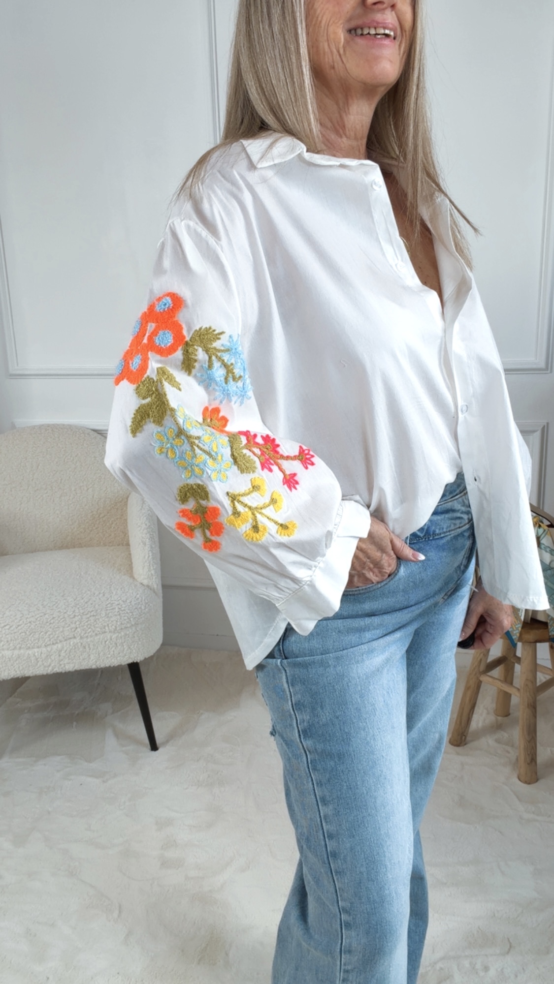 Das Highlight sind die kunstvoll bestickten Blumenmuster auf beiden Ärmeln. Die feinen Stickereien verleihen der Bluse eine feminine, romantische Note und setzen einen stilvollen Akzent, ohne aufdringlich zu wirken. Die detailreiche Verarbeitung unterstreicht die hochwertige Qualität und macht jedes Outfit zu etwas Besonderem.