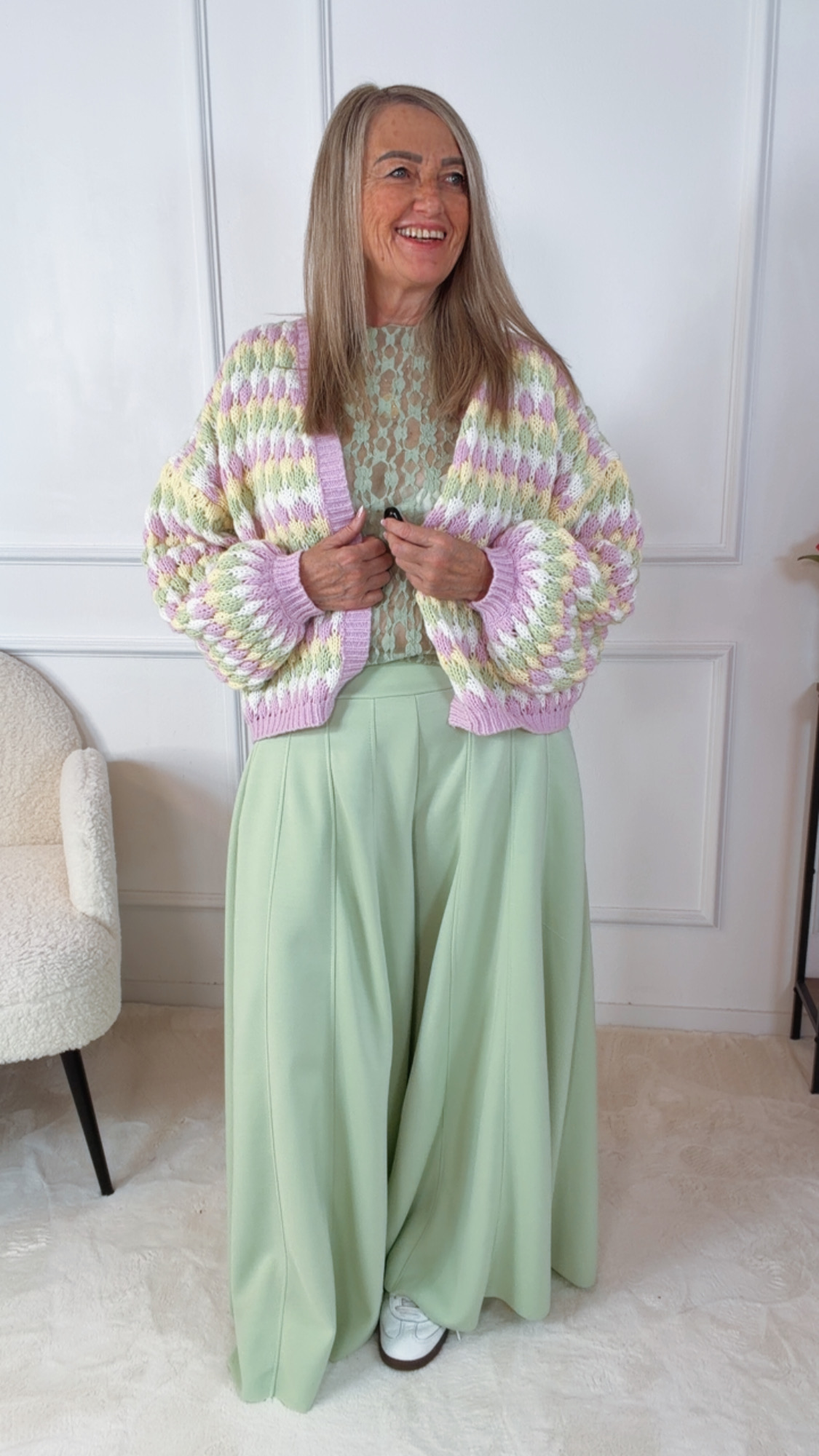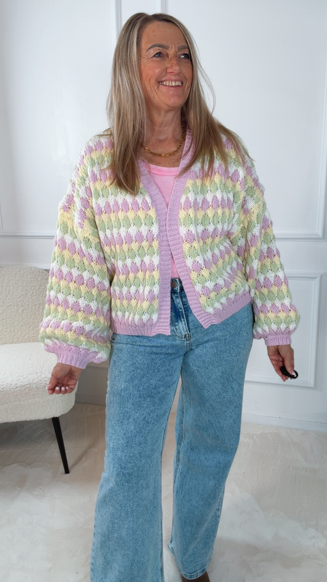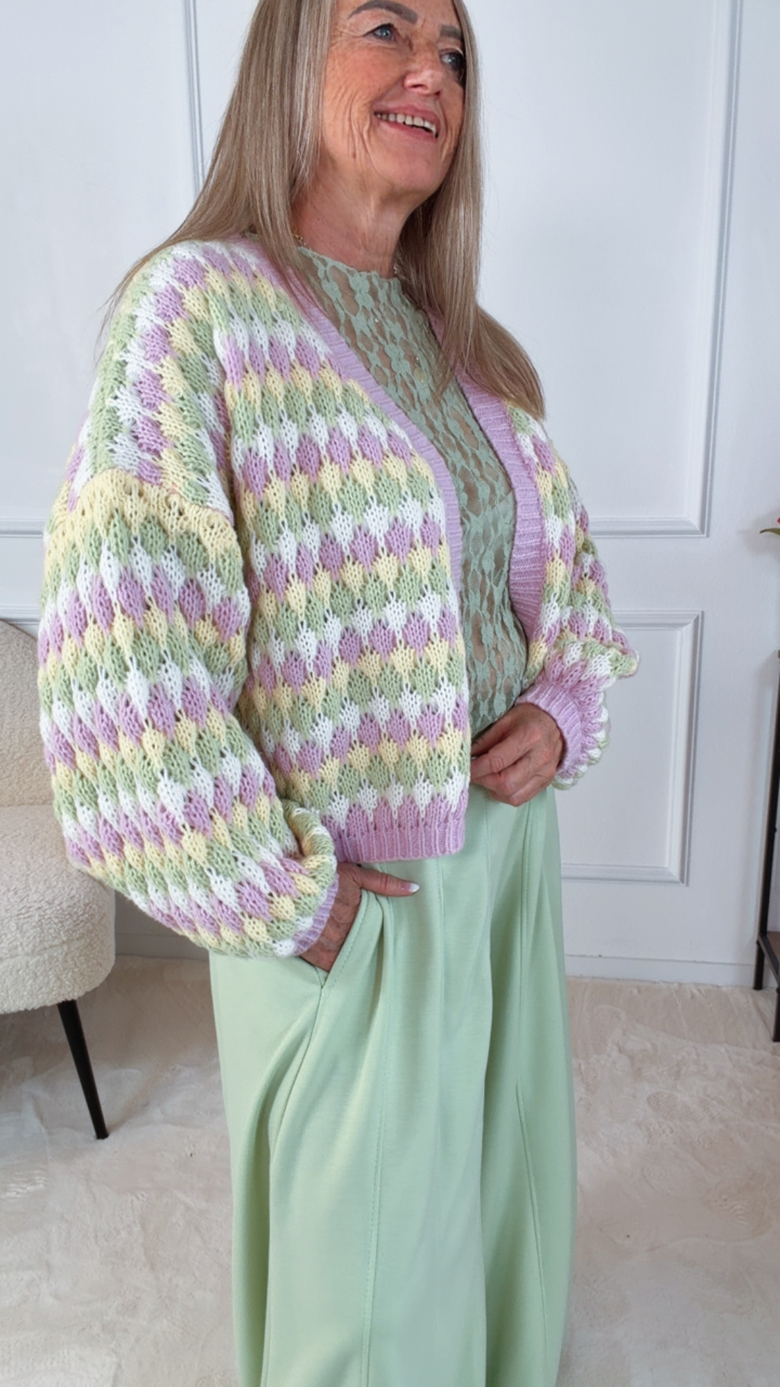 Dieser hochwertige Cardigan überzeugt mit einem außergewöhnlich schönen, aufgewürfelten Strickmuster und modischen Ballonärmeln. Die sanften Puffärmel verleihen dem Design eine feminine Note und machen die Strickjacke zu einem echten Blickfang. In wunderschönen Farben gehalten, lässt sich dieses Modell vielseitig kombinieren – ob lässig im Alltag oder elegant gestylt.