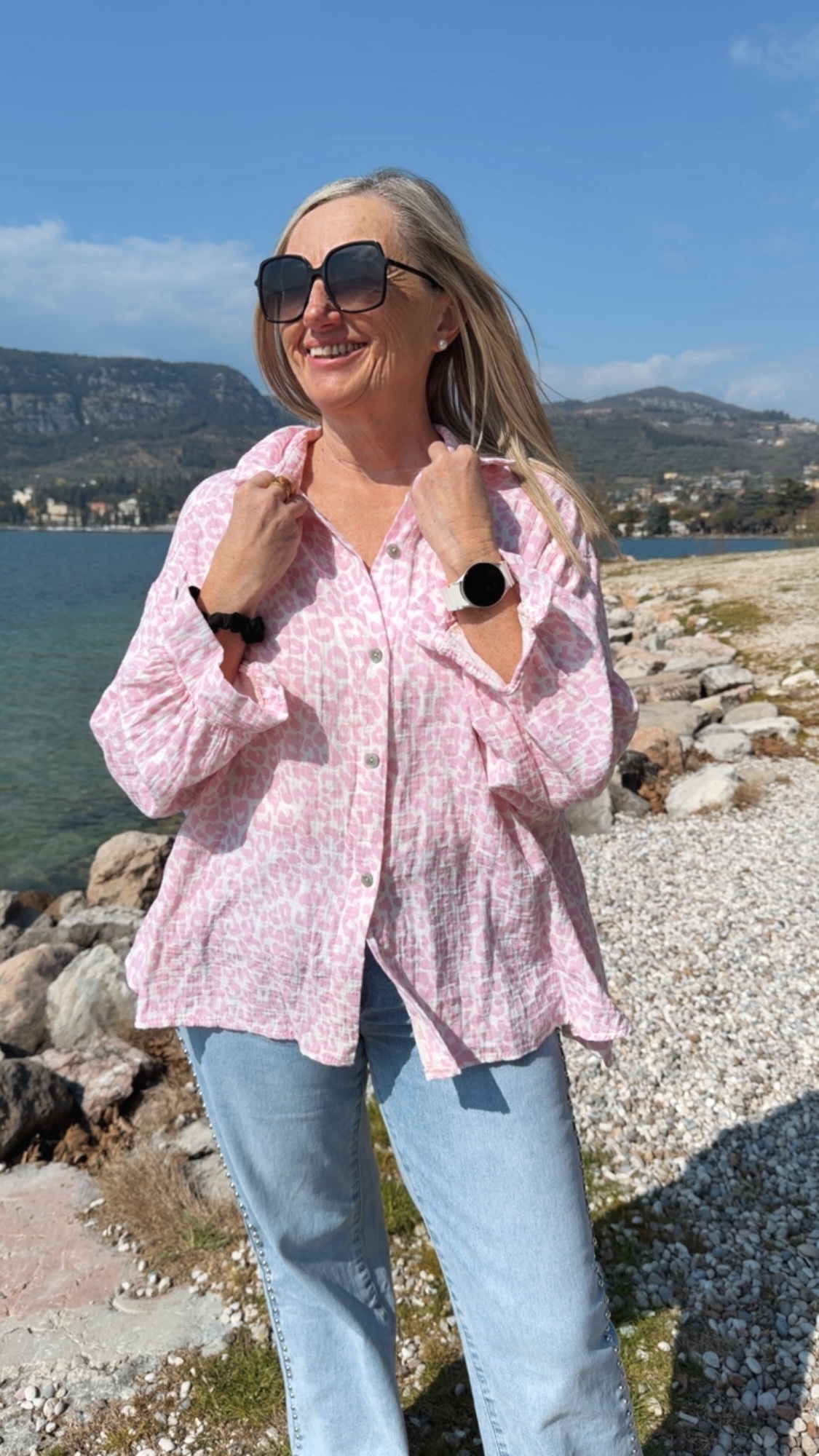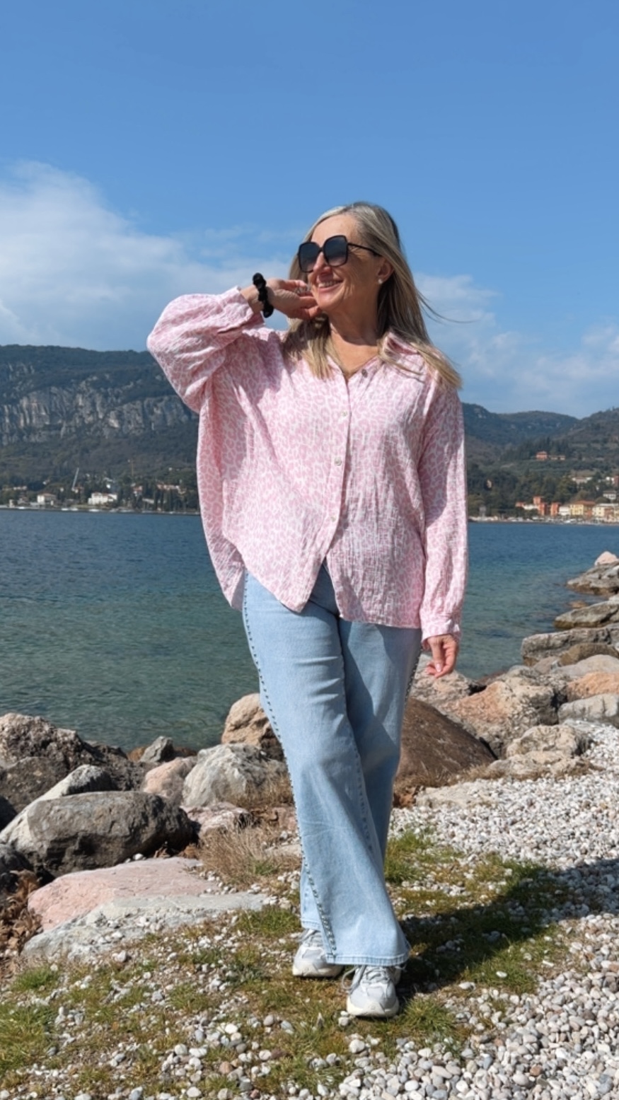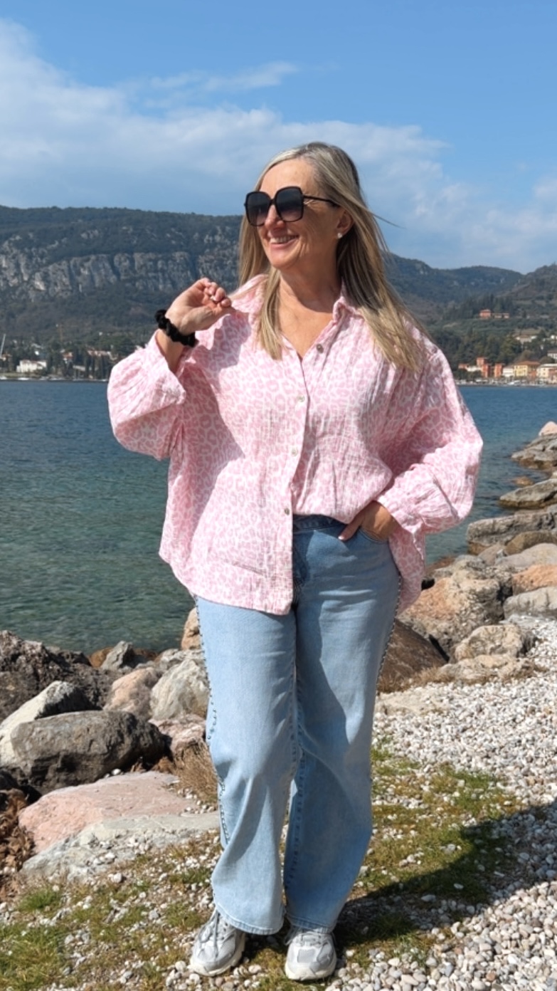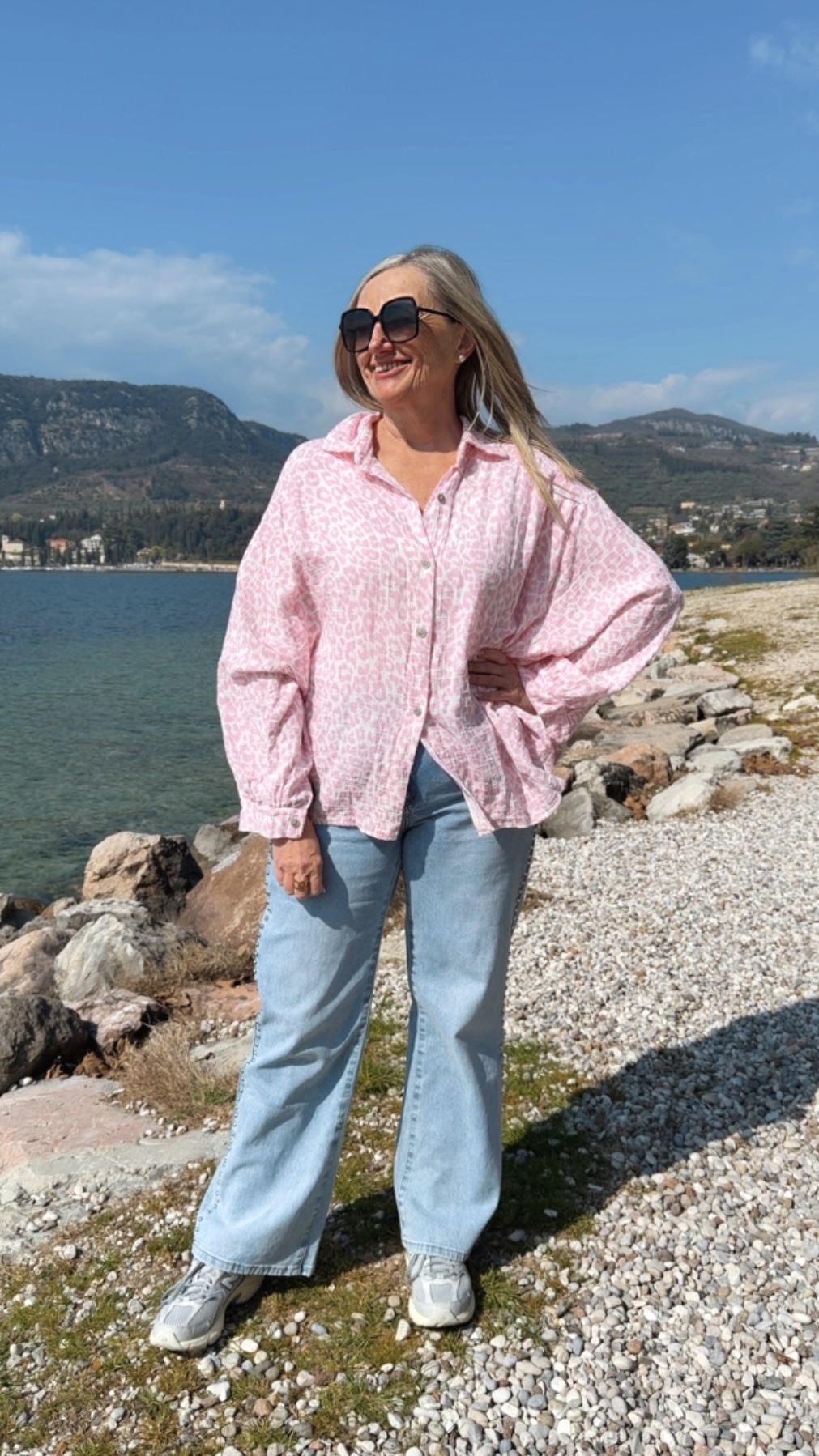 Der lockere Schnitt mit einer Brustweite von ca. 80 cm und einer Länge von ca. 65 cm schmeichelt der Figur und passt bequem bis Größe 44/46. Das moderne Leo-Design macht die Bluse zum echten Hingucker und lässt sich vielseitig kombinieren – ob lässig zur Jeans oder feminin zum Rock.