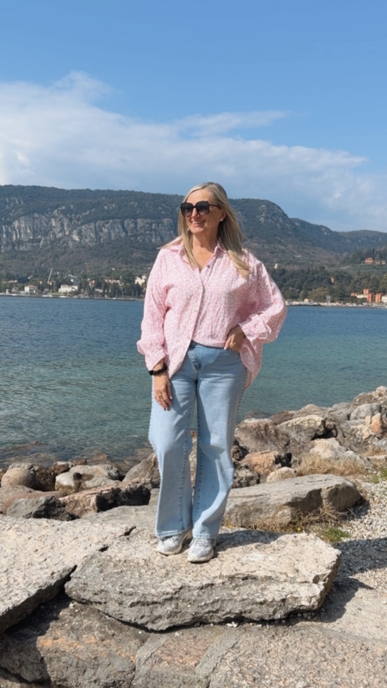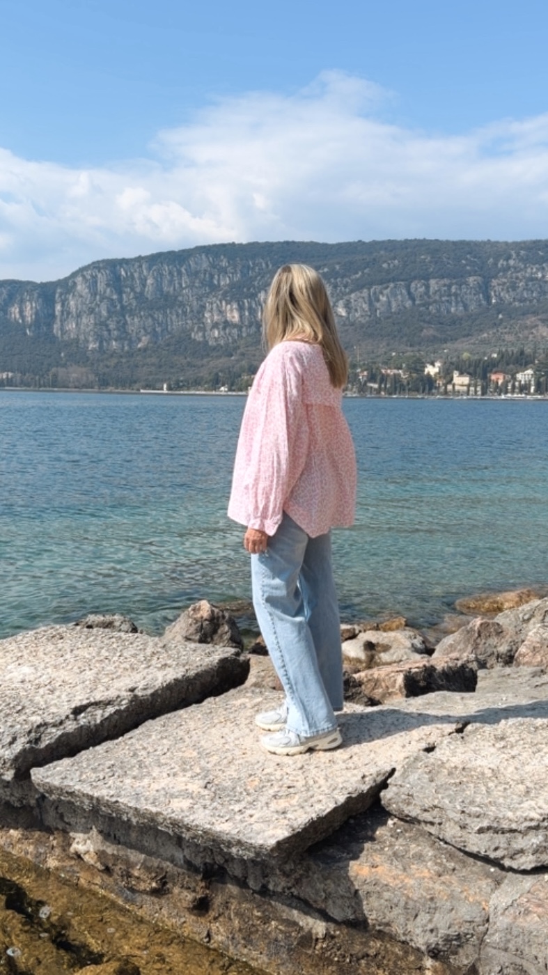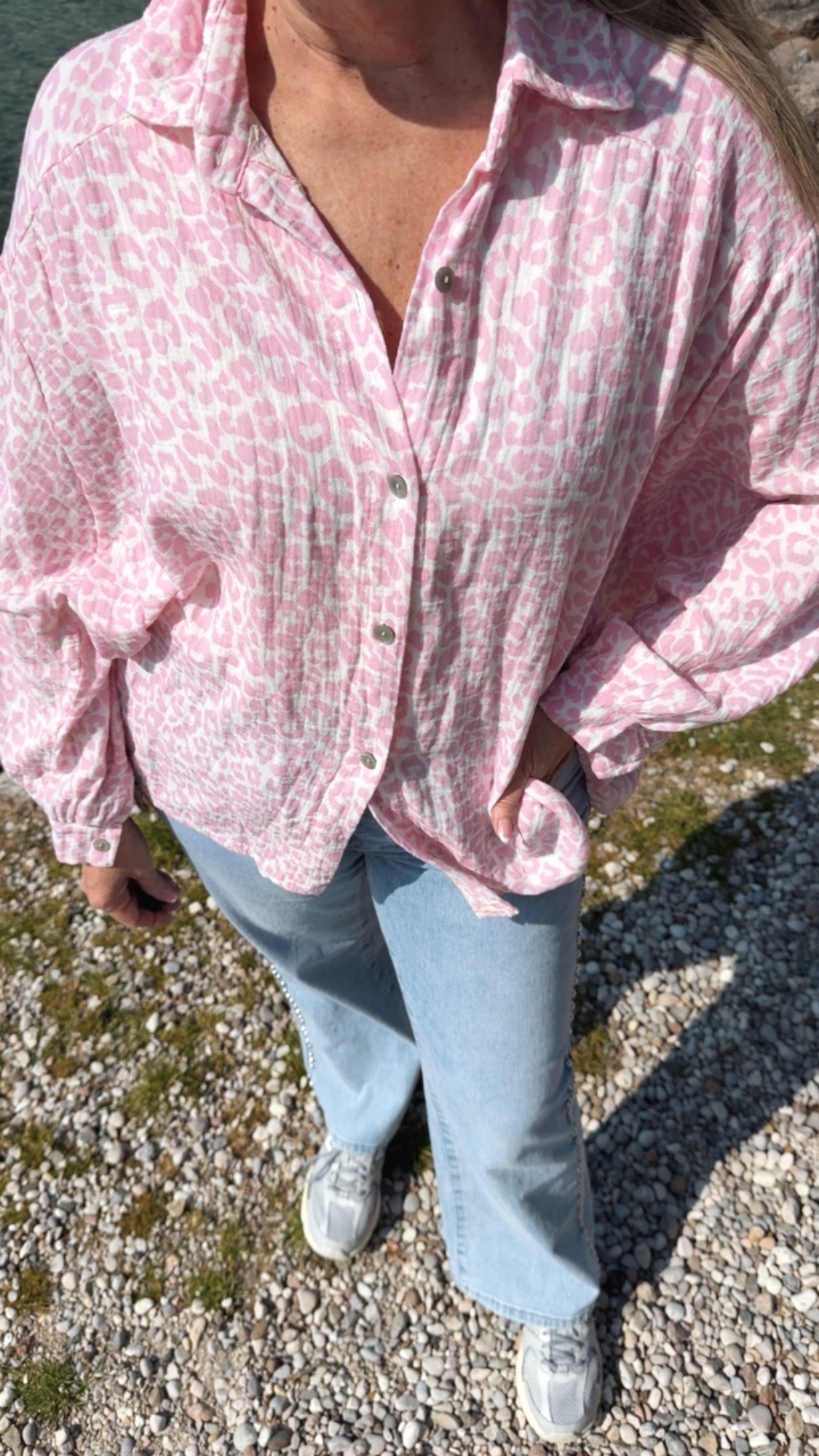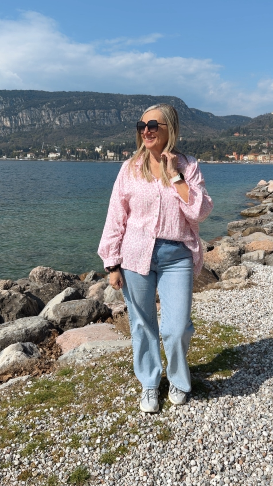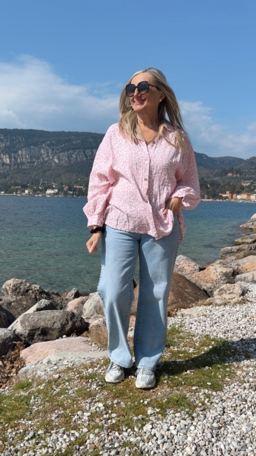 Der lockere Schnitt mit einer Brustweite von ca. 80 cm und einer Länge von ca. 65 cm schmeichelt der Figur und passt bequem bis Größe 44/46. Das moderne Leo-Design macht die Bluse zum echten Hingucker und lässt sich vielseitig kombinieren – ob lässig zur Jeans oder feminin zum Rock.