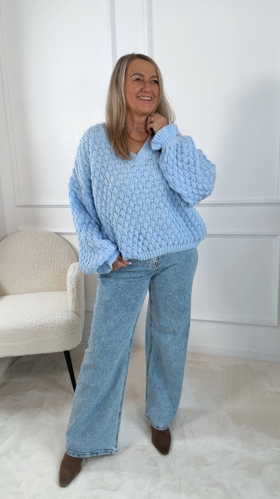 Dank des lockeren Schnitts passt der Pullover bequem bis circa Größe 42 und schmeichelt verschiedenen Figurtypen.