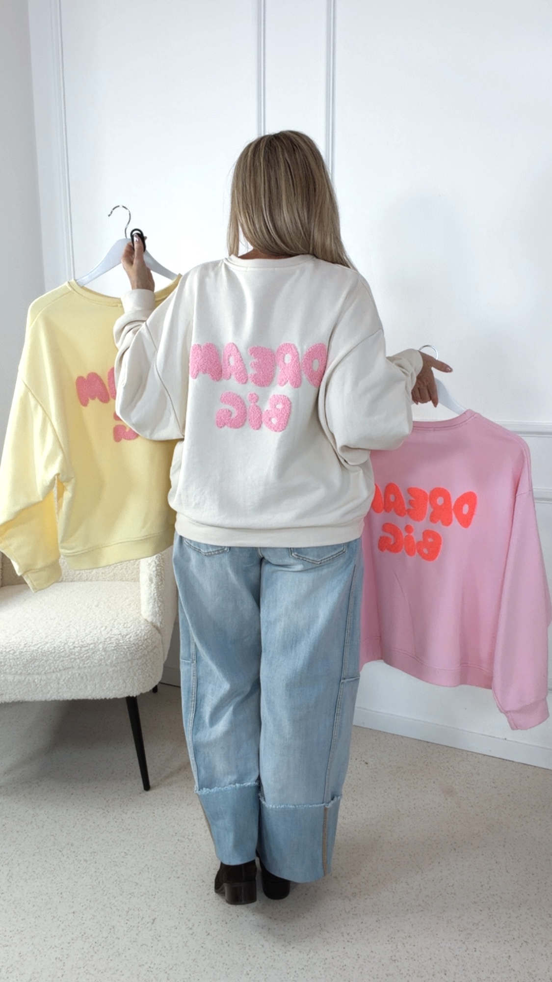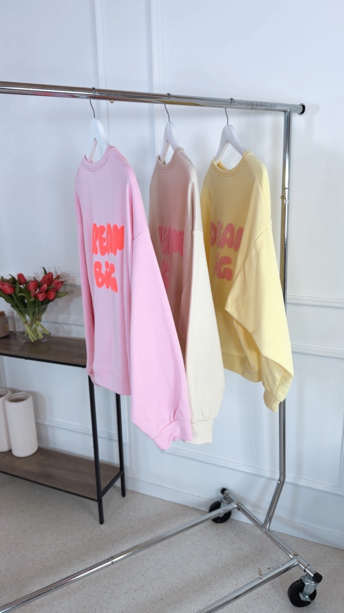 Der beflockte Rückenaufdruck „Dream Big“ setzt ein starkes Highlight und überzeugt durch seine hochwertige, samtige Haptik. Der bequeme Schnitt und das angenehm weiche Material machen den Sweater zum perfekten Begleiter für jeden Tag.