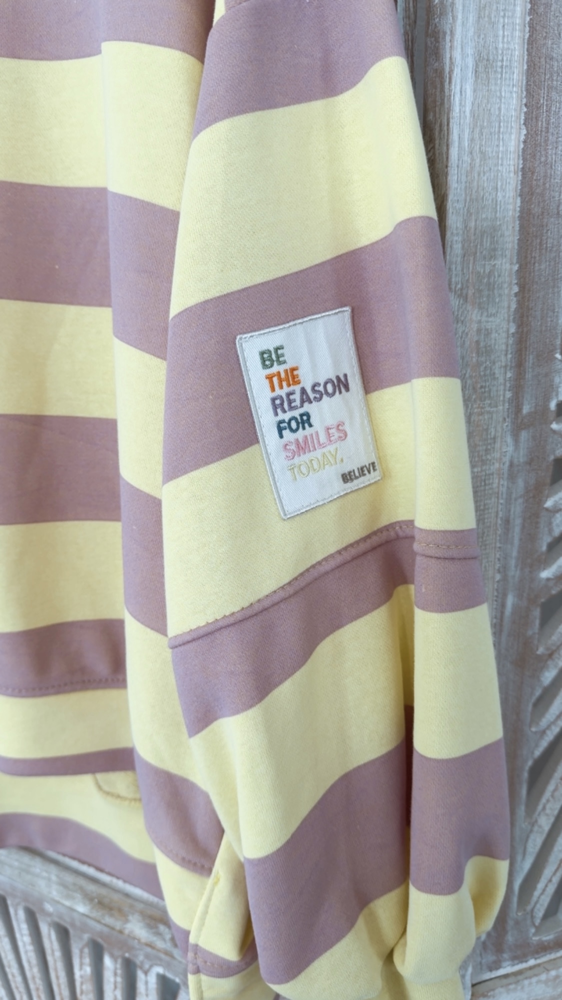 Statement-Patch am Ärmel: „be the reason for smiles today“