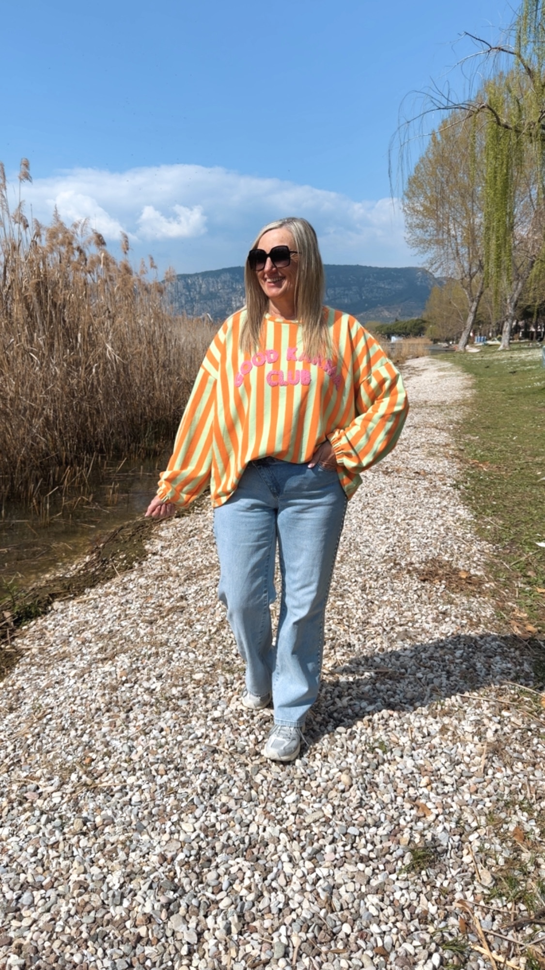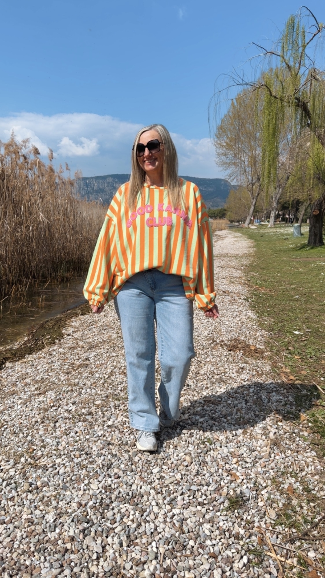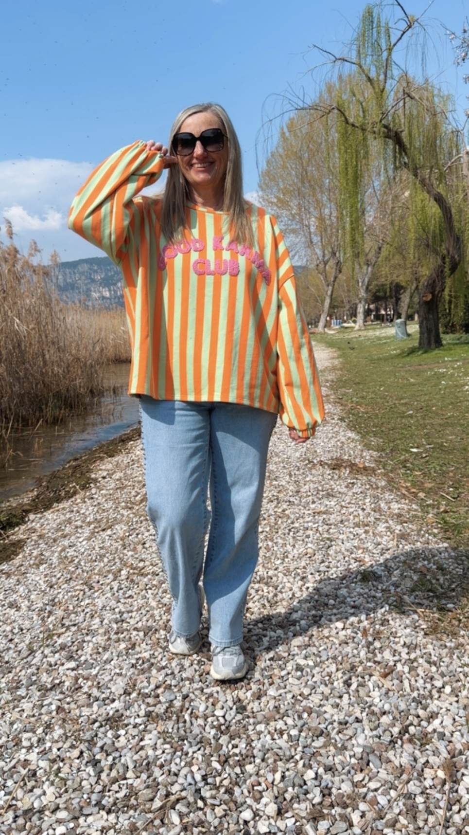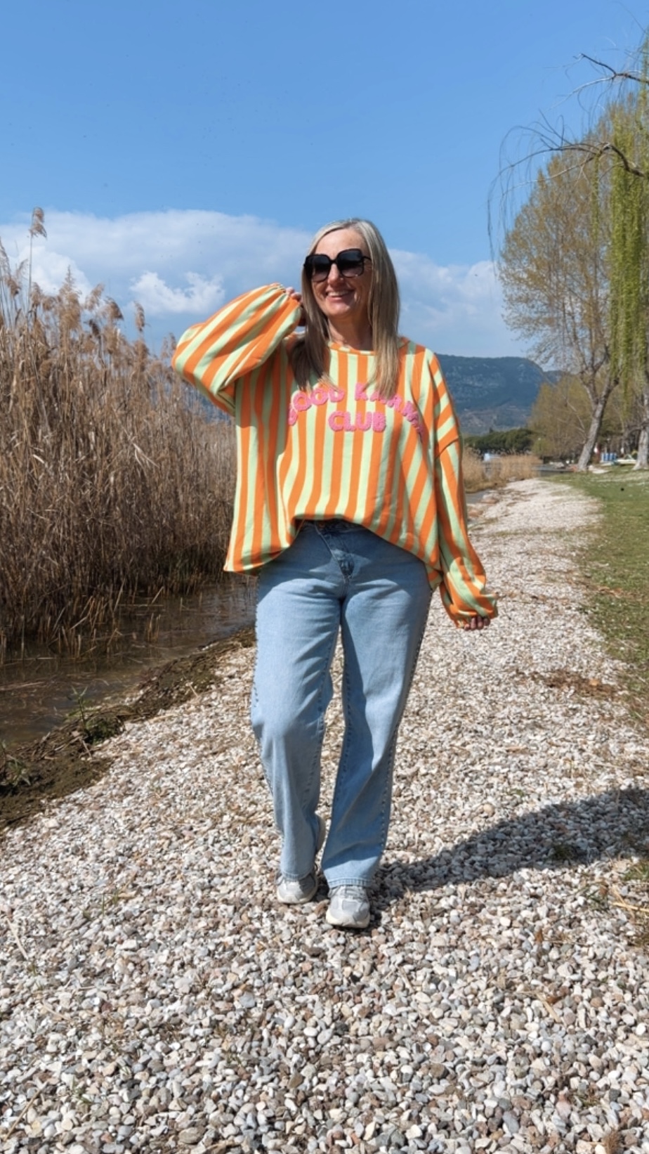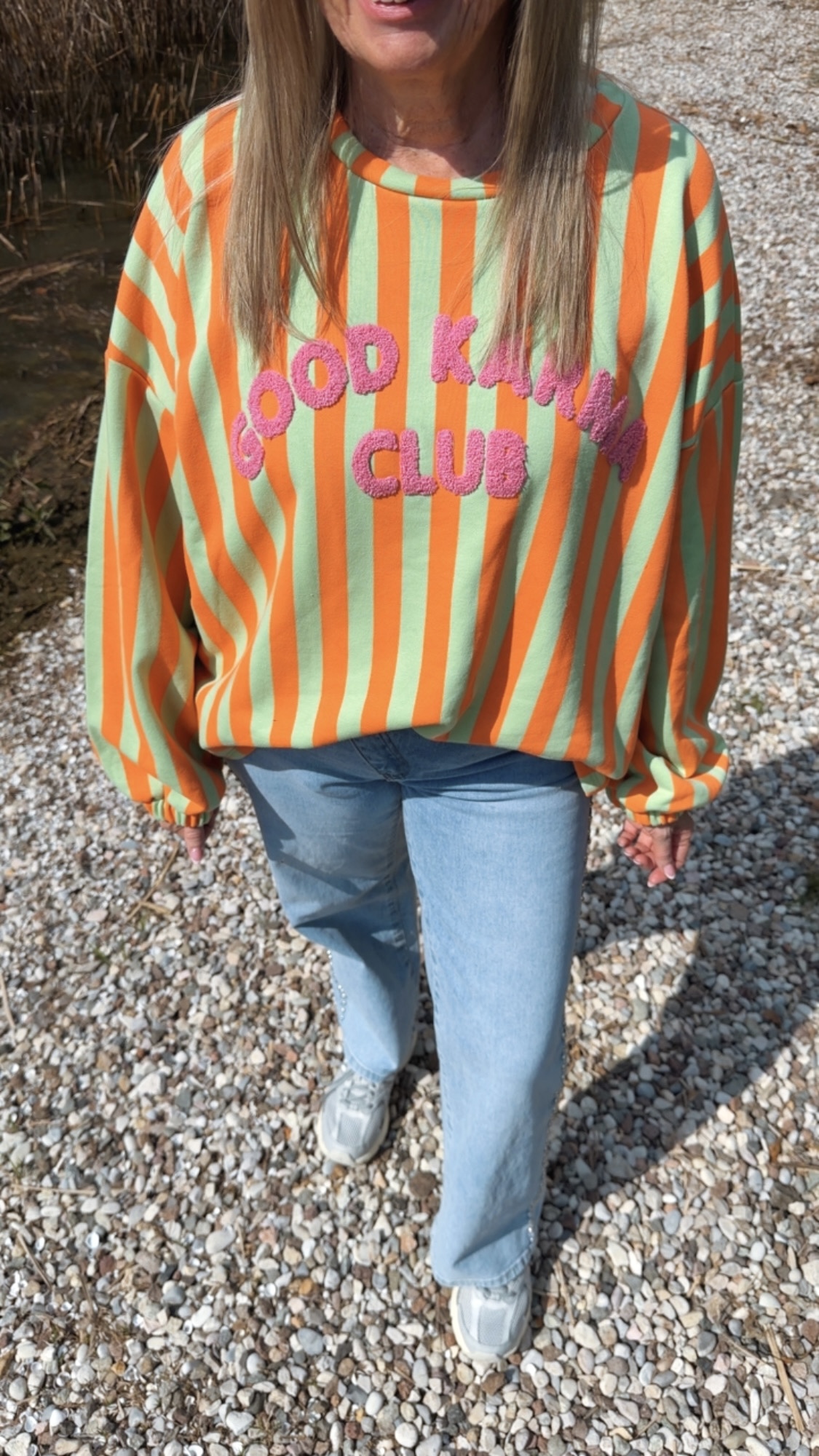 Dieses stylische Streifensweatshirt bringt Farbe und gute Laune in deinen Alltag. Mit seinem auffälligen Streifenmuster und dem flauschigen „Good Karma Club“-Schriftzug auf der Vorderseite wird es garantiert zum Hingucker. Der lockere Schnitt mit leicht überschnittenen Schultern und elastischen Bündchen an den Ärmeln sorgt für eine lässige Passform und hohen Tragekomfort.