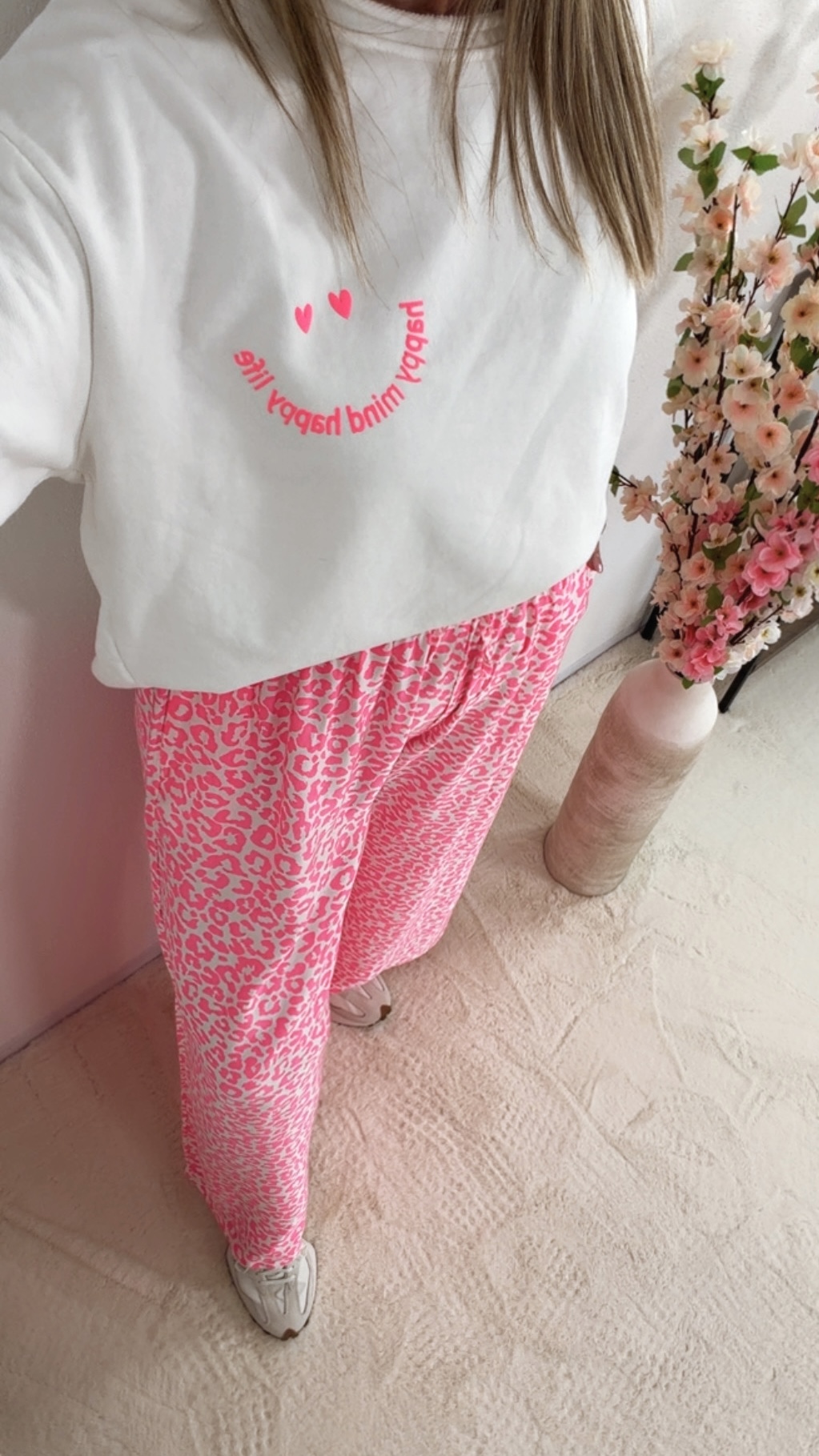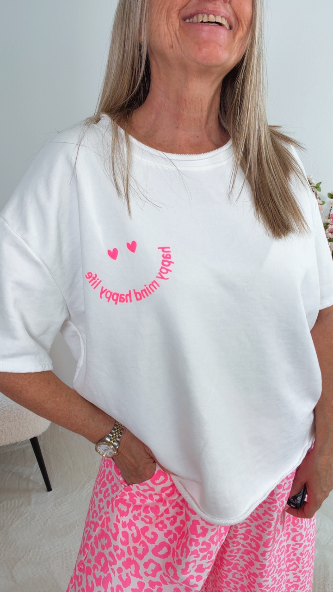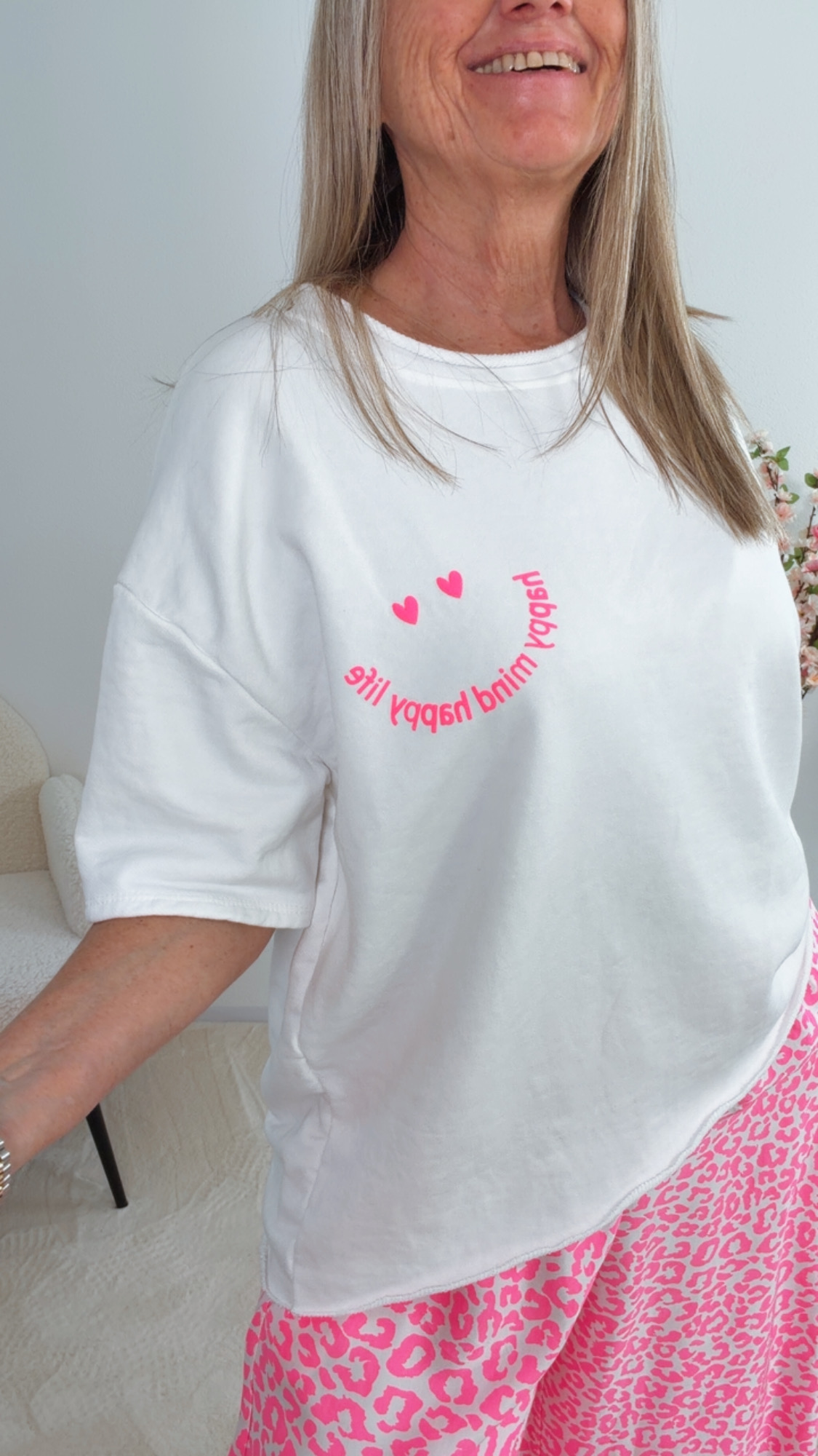 Der stylische T-Shirt-Sweater „Elovira“ begeistert mit seinem modernen Look und dem inspirierenden Schriftzug „Happy Mind, Happy Life“ 💛✨