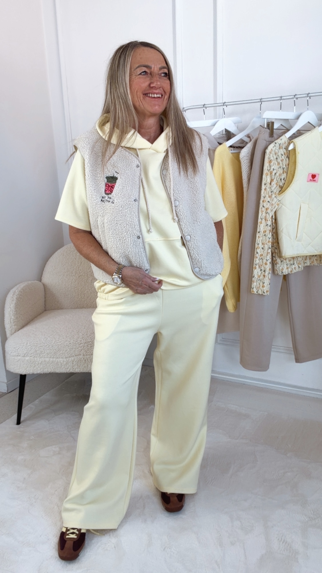 Diese Teddyweste ist der perfekte Mix aus cozy Komfort und angesagtem Style. Das weiche, flauschige Material hält warm, während die praktischen Druckknöpfe für ein unkompliziertes An- und Ausziehen sorgen. Zwei Seitentaschen bieten Platz für kleine Essentials, und der auffällige Stickaufdruck „I love you so Matcha“ setzt einen verspielten, modernen Akzent. Ein Must-Have für lässige, trendige Looks mit Wohlfühlfaktor.