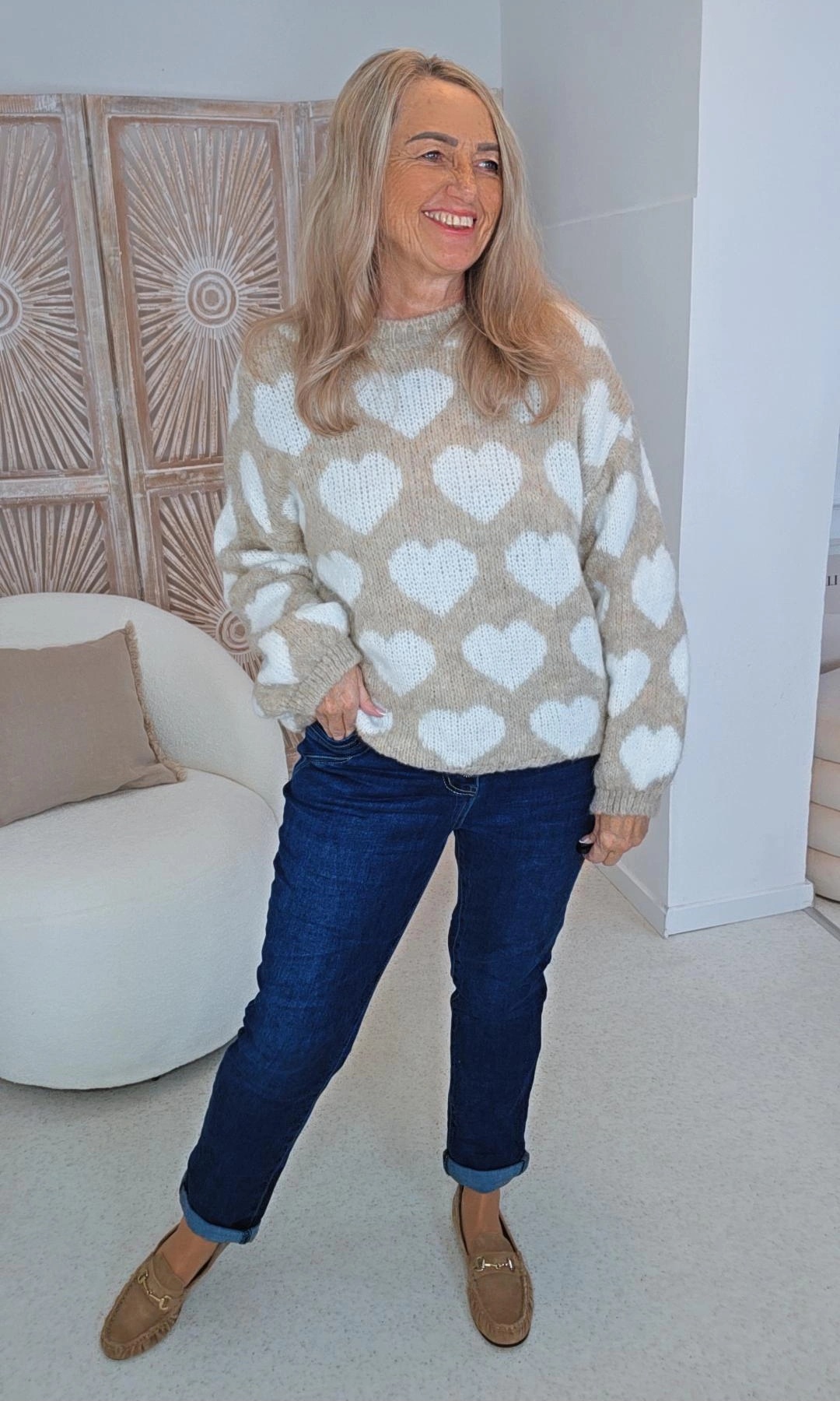 Kuschelig, charmant und modern – dieser Strickpullover mit liebevollem Herzmuster ist ein echtes Lieblingsstück für die kühlen Tage. Der weiche Materialmix mit Wollanteil sorgt für angenehme Wärme und ein wunderbar sanftes Tragegefühl auf der Haut.