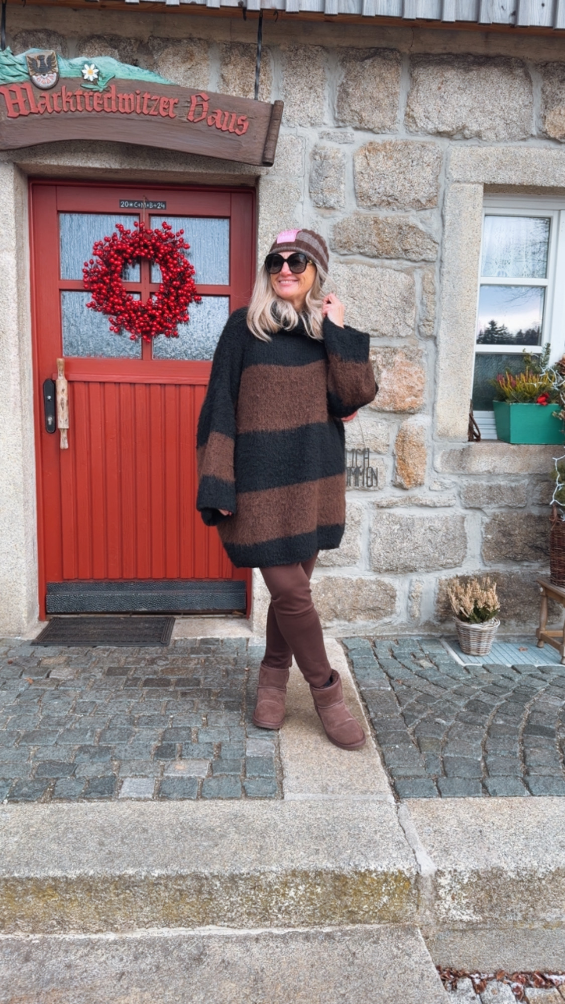 Der Helsinki ist ein vielseitiger, angenehm weicher Strick, der sowohl als Pullover als auch als kurzes Kleid getragen werden kann. Die breiten Streifen verleihen ihm einen modernen, entspannten Look, während der lässige Schnitt für hohen Tragekomfort sorgt.