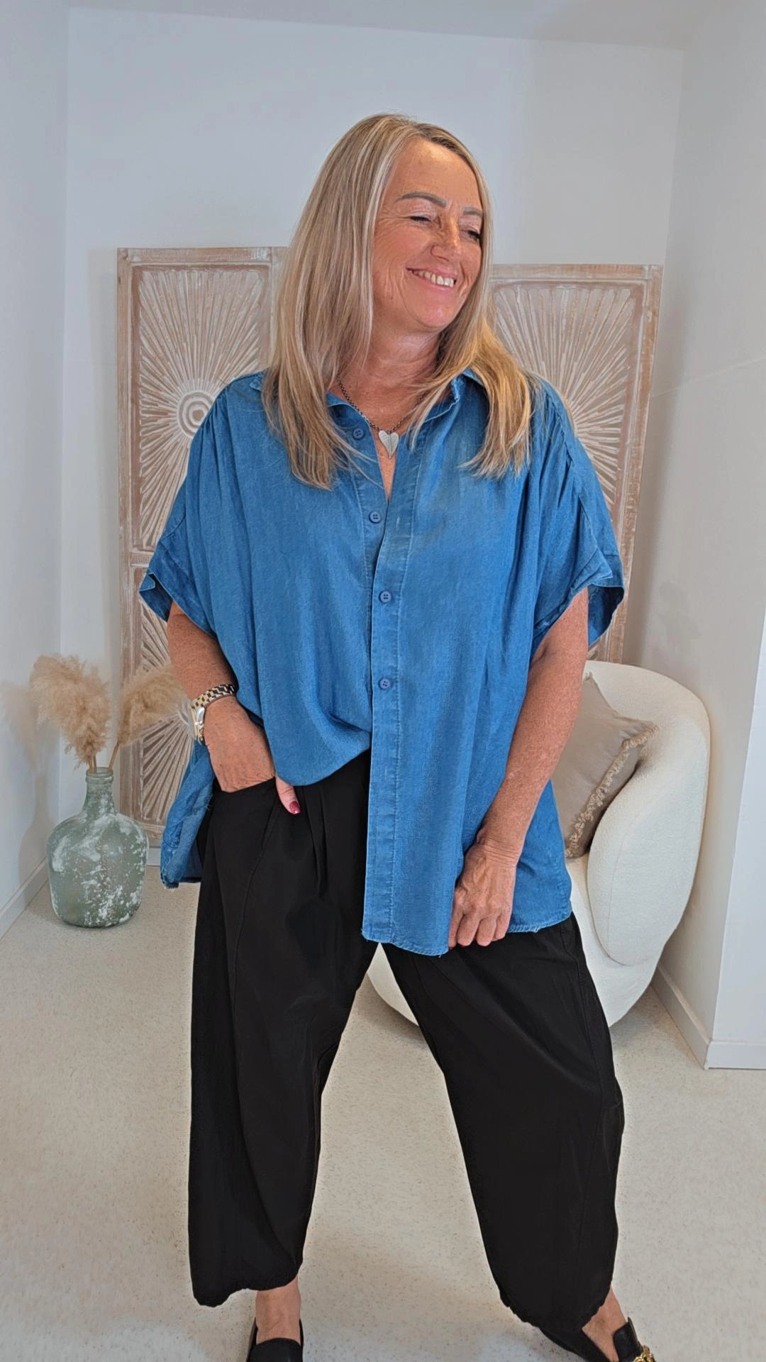 DENIM KURZARMBLUSE DOMINIQUE LYOCELL Made in Italy Größe 36-46