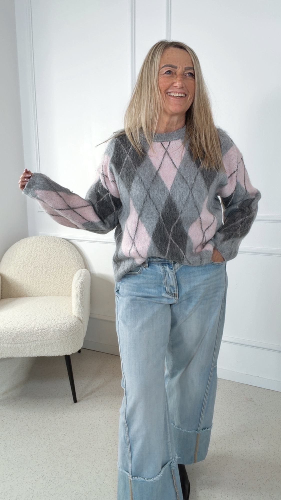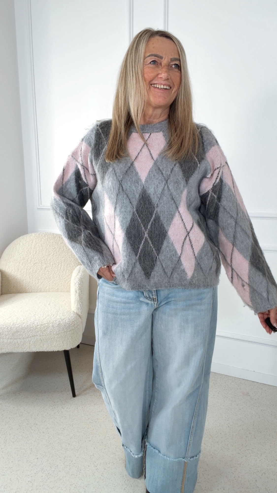 Ein wunderschöner Pullover, der mit seinem klassischen Argyle-Muster sofort ins Auge fällt und jedem Outfit eine stilvolle Note verleiht ✨ Der lockere, angenehme Schnitt sorgt für ein entspanntes Tragegefühl und macht diesen Pullover zu einem vielseitigen Begleiter – ob casual im Alltag oder liebevoll kombiniert für besondere Momente.