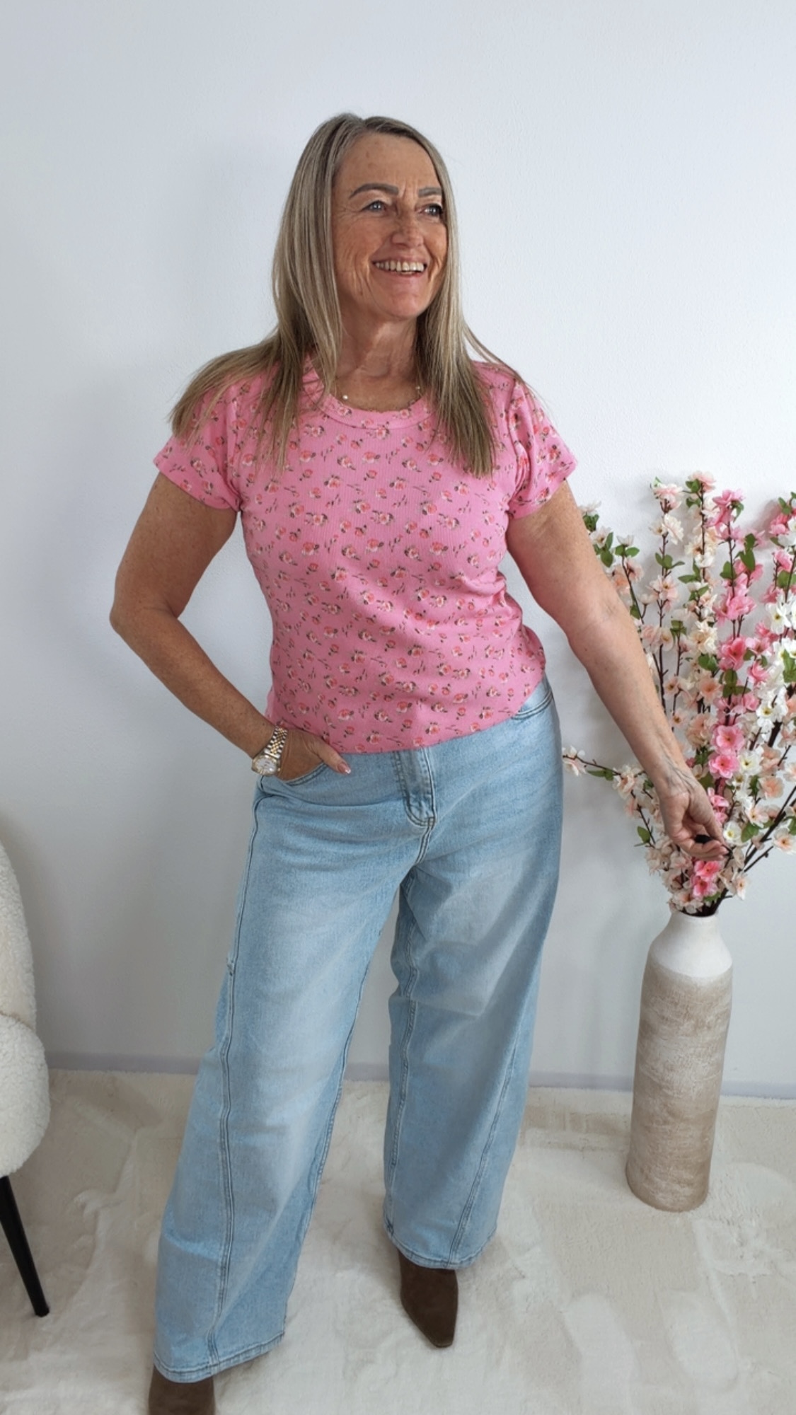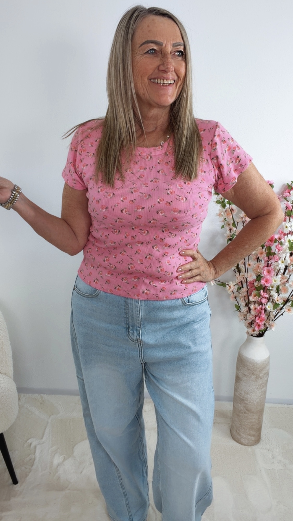 Produktinformationen "🌸 Feinripp-T-Shirt „Blooming Love“ Made in Italy kurze Form Blümchen 34-42"