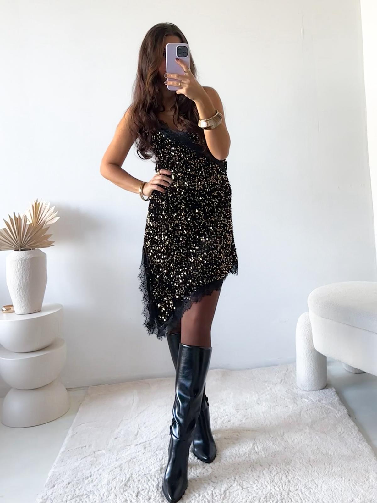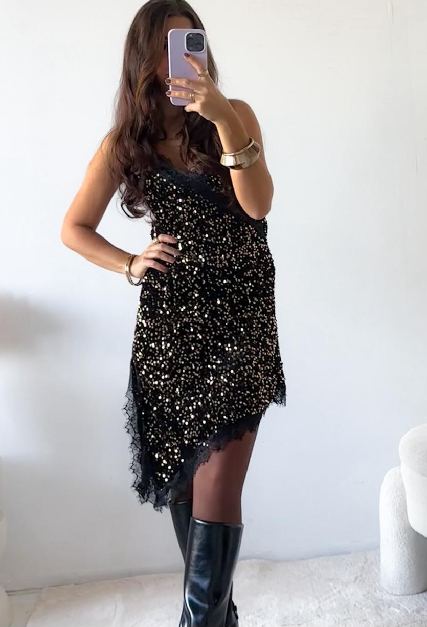 Produktinformationen "FESTLICHES PAILLETTEN KLEID PENELOPE 34-40 Made in Italy Spaghettiträger Glitzer Top Asymmetrisch"