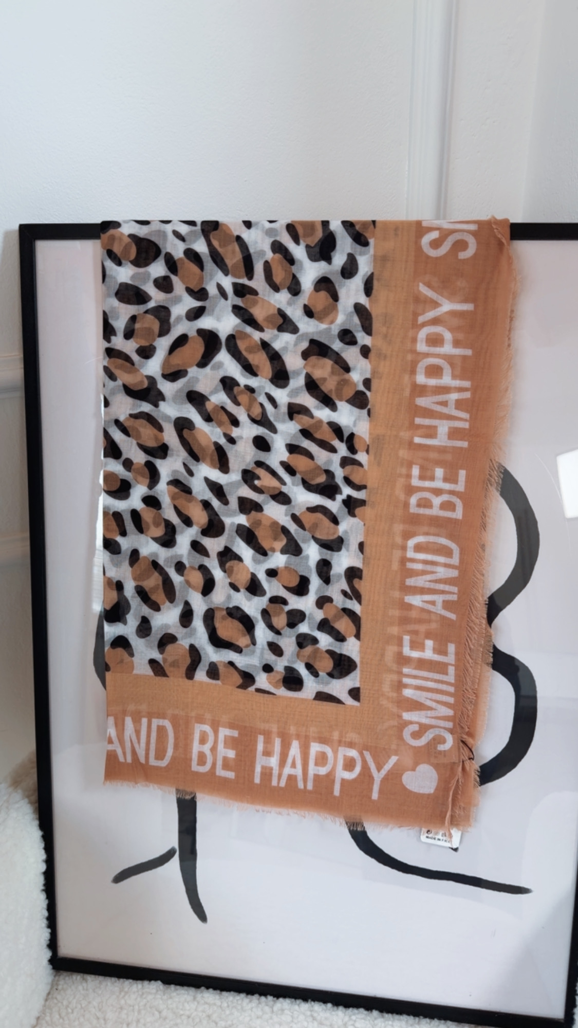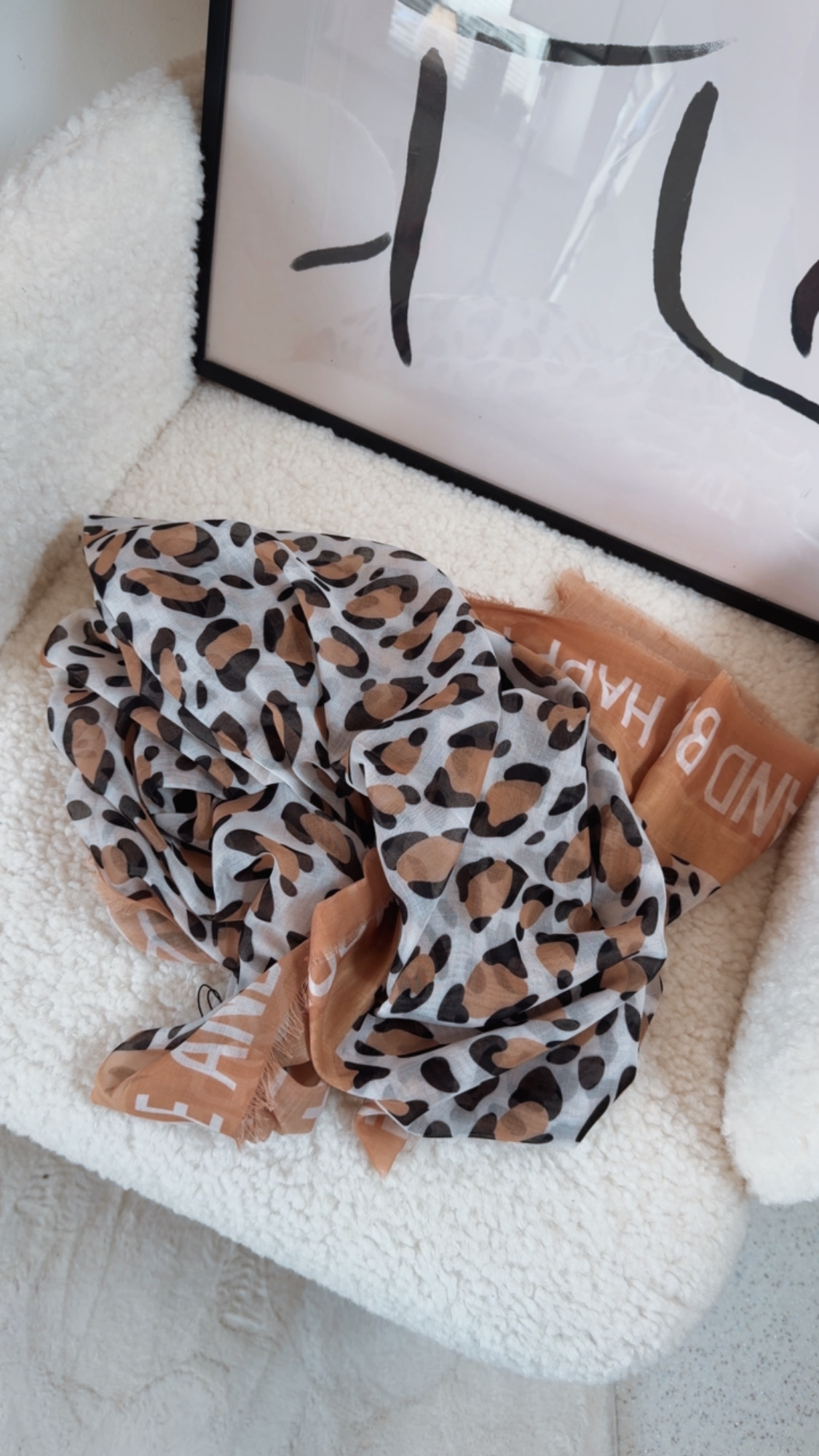 Dieses Halstuch setzt ein modisches Statement mit einem verspielten Leo-Design und der fröhlichen Botschaft „Be happy and smile“. Die Kombination aus trendigem Animal-Print und positivem Schriftzug macht es zu einem echten Hingucker und hebt jedes Outfit sofort auf ein frisches, stylisches Level.