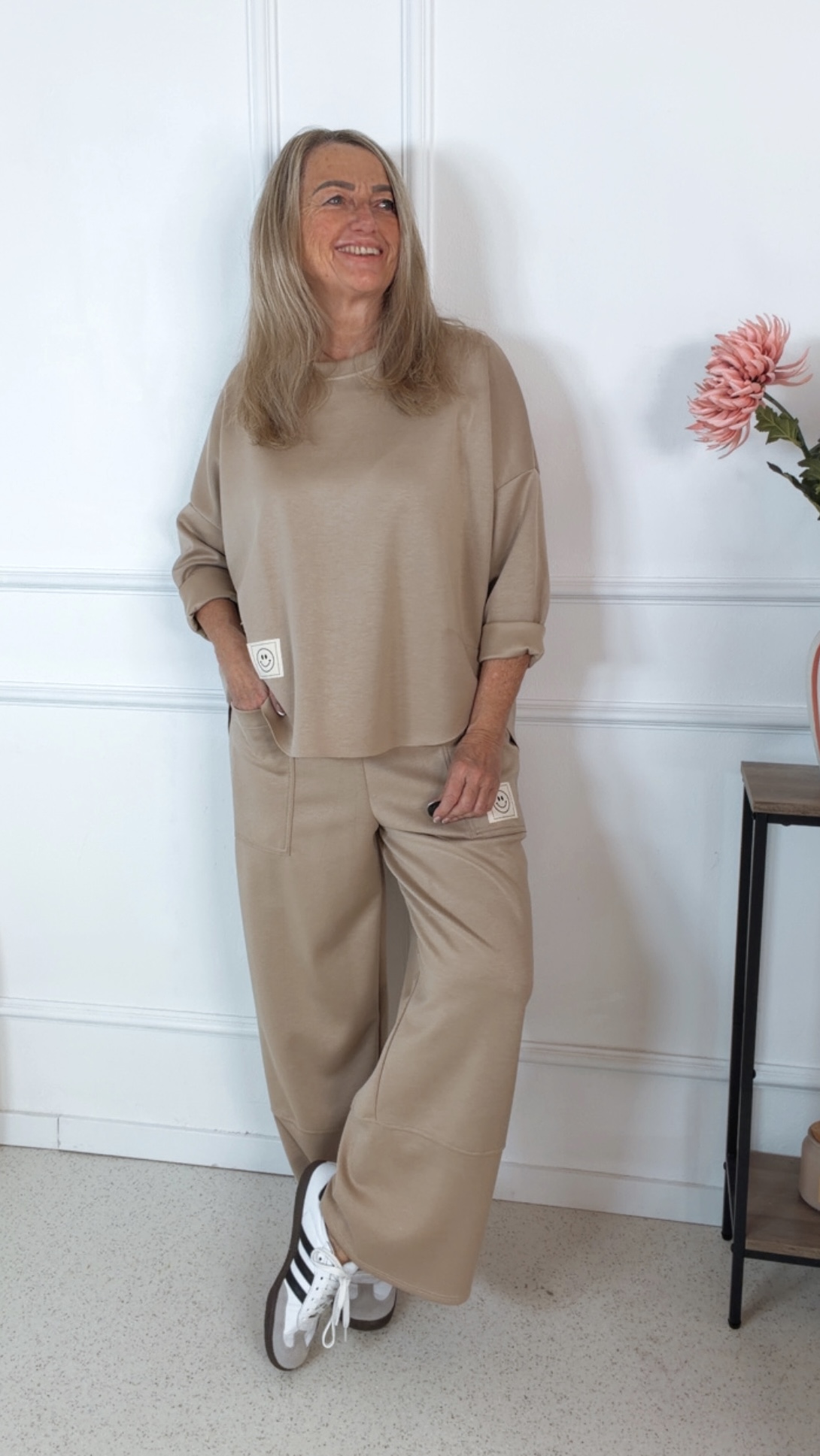 Die sportliche Joggings-Pants kombiniert mit einem angesagten Oversize-Pullover ergibt ein perfekt abgestimmtes Outfit für Alltag, Freizeit und Reisen. Super süß mit dem aufgenähten Smile Patch.