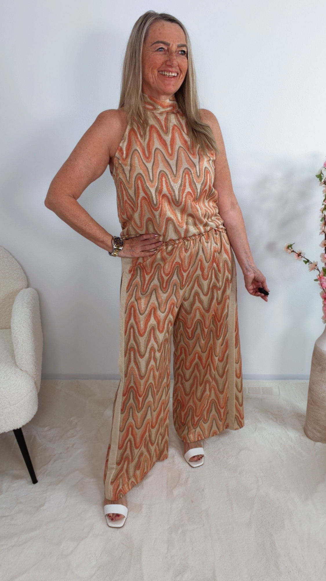 Die stilvolle Hose „Virellina“ überzeugt mit ihrem außergewöhnlichen, wellenförmigen Muster 😍✨ und sorgt für einen modernen, eleganten Look mit besonderem Twist 🌊🤍