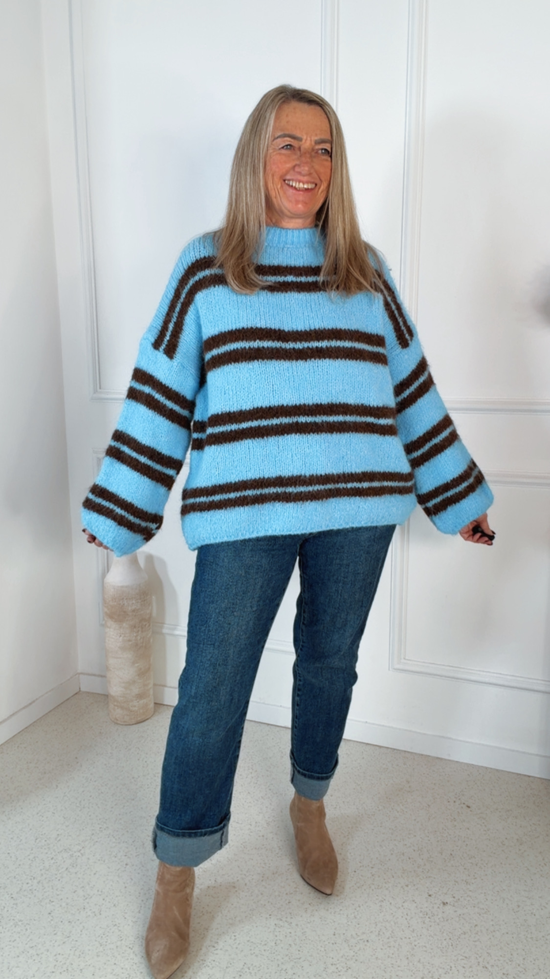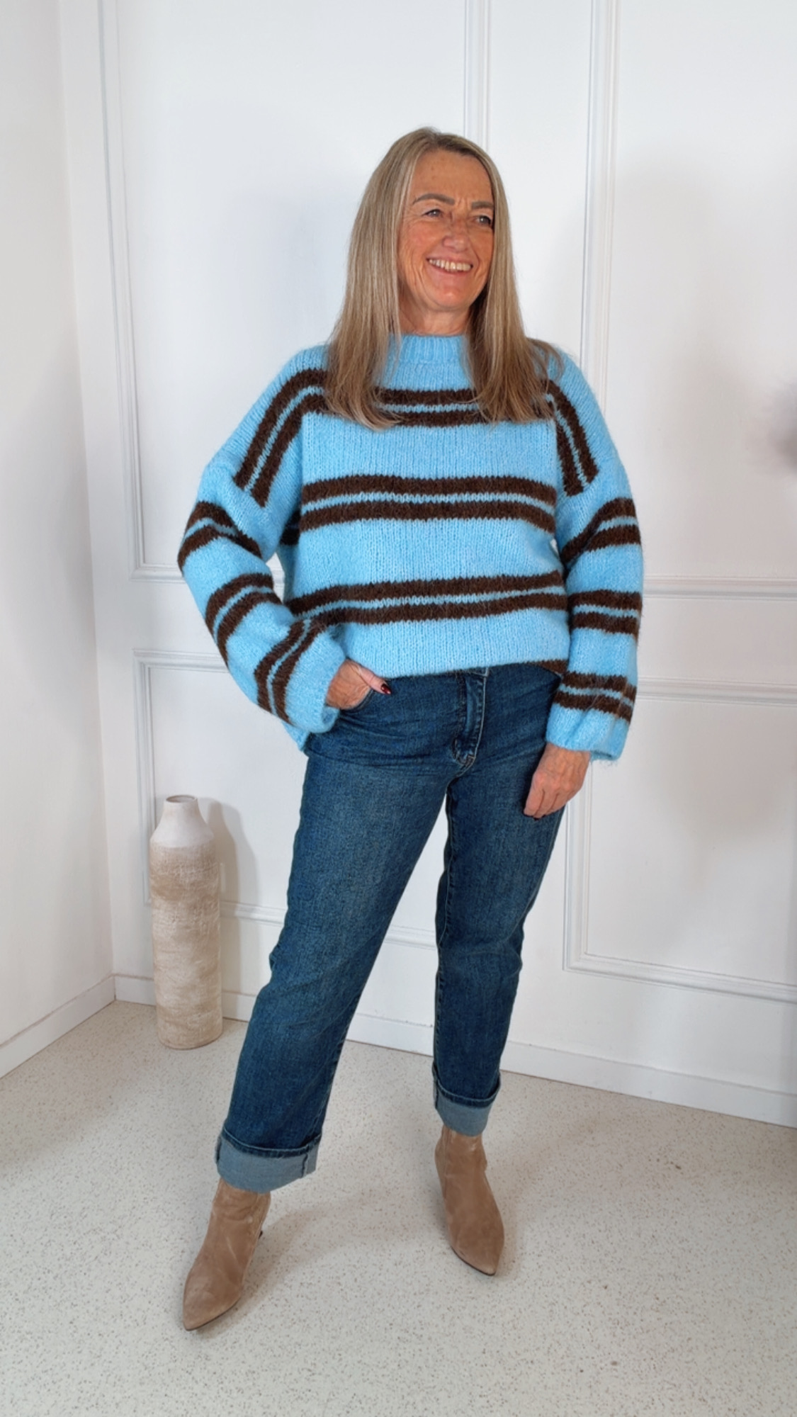 Der Strickpullover Bärbel begeistert mit seinem wunderschönen Oversize-Schnitt und dem modernen Streifenmuster, das ihm einen zeitlosen und zugleich angesagten Look verleiht.
