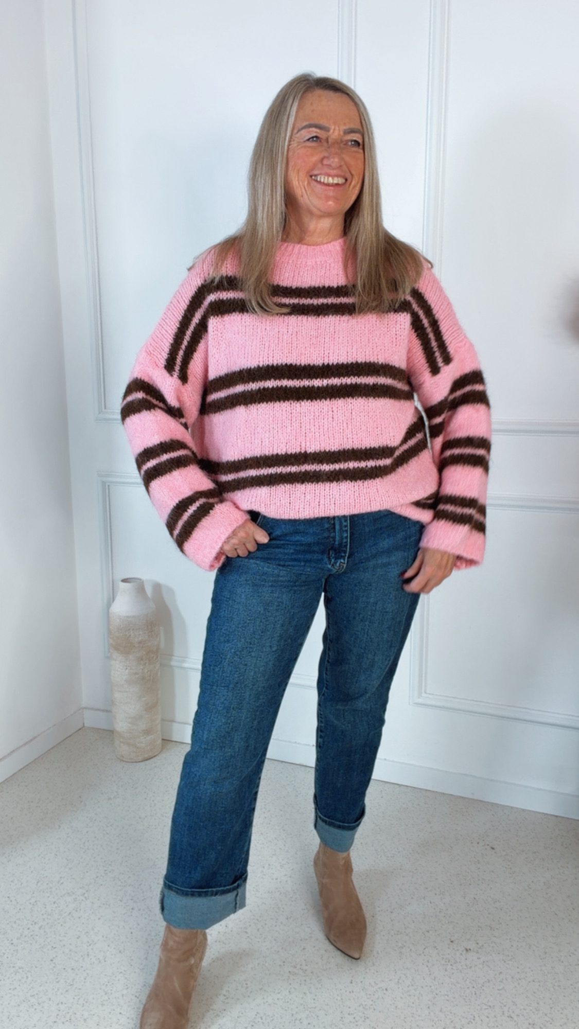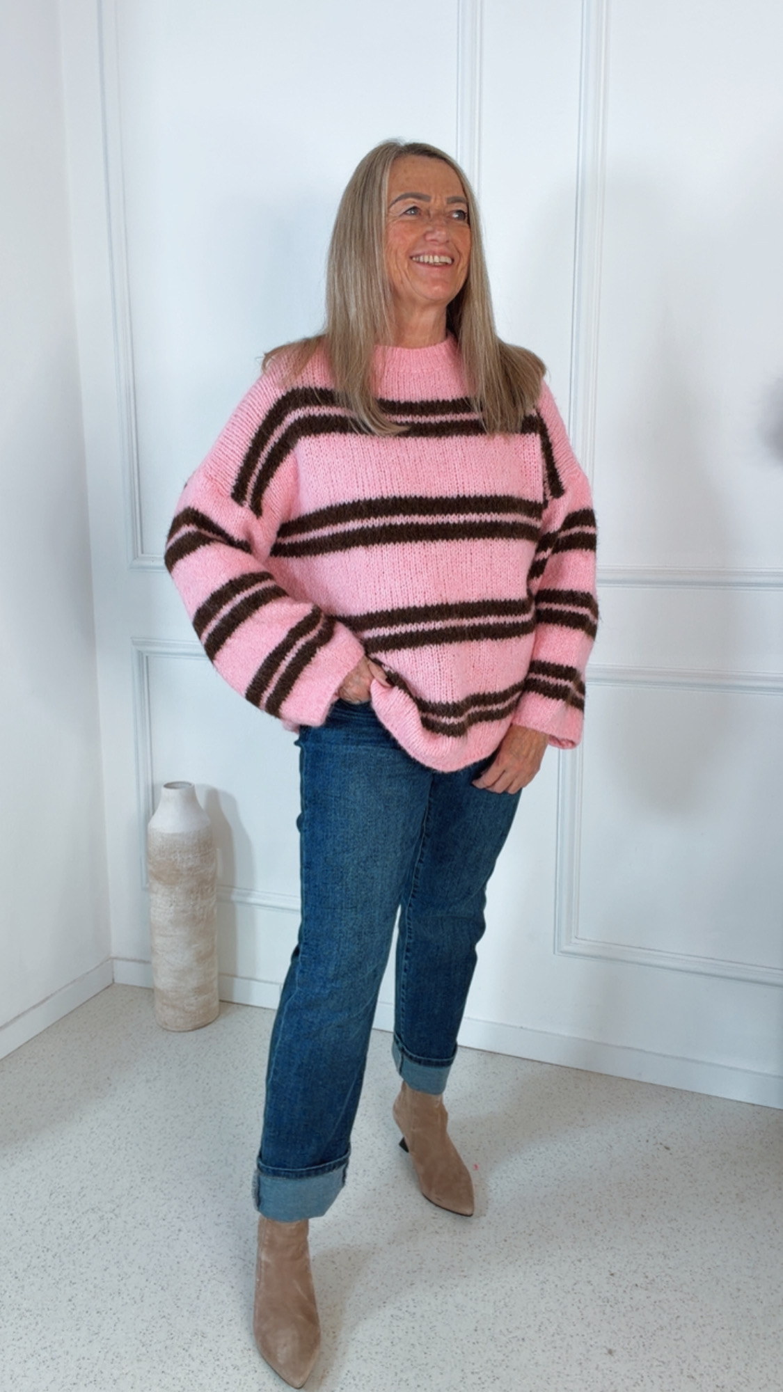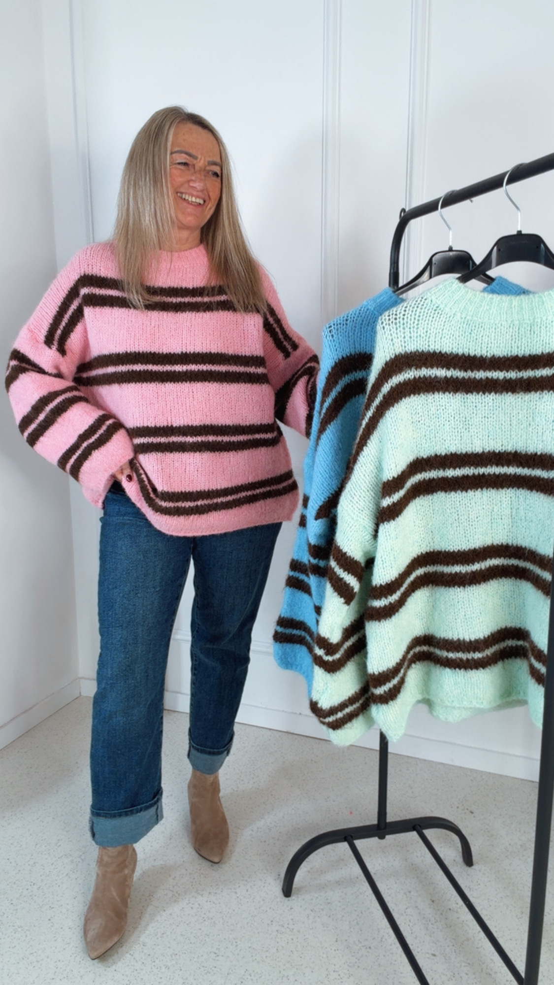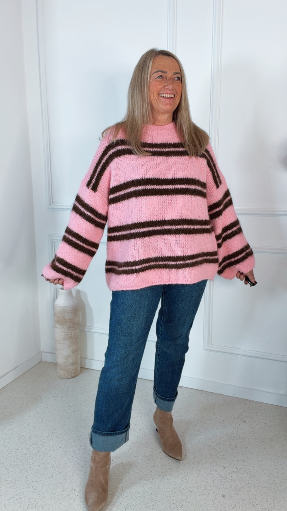 Der Strickpullover Bärbel begeistert mit seinem wunderschönen Oversize-Schnitt und dem modernen Streifenmuster, das ihm einen zeitlosen und zugleich angesagten Look verleiht.