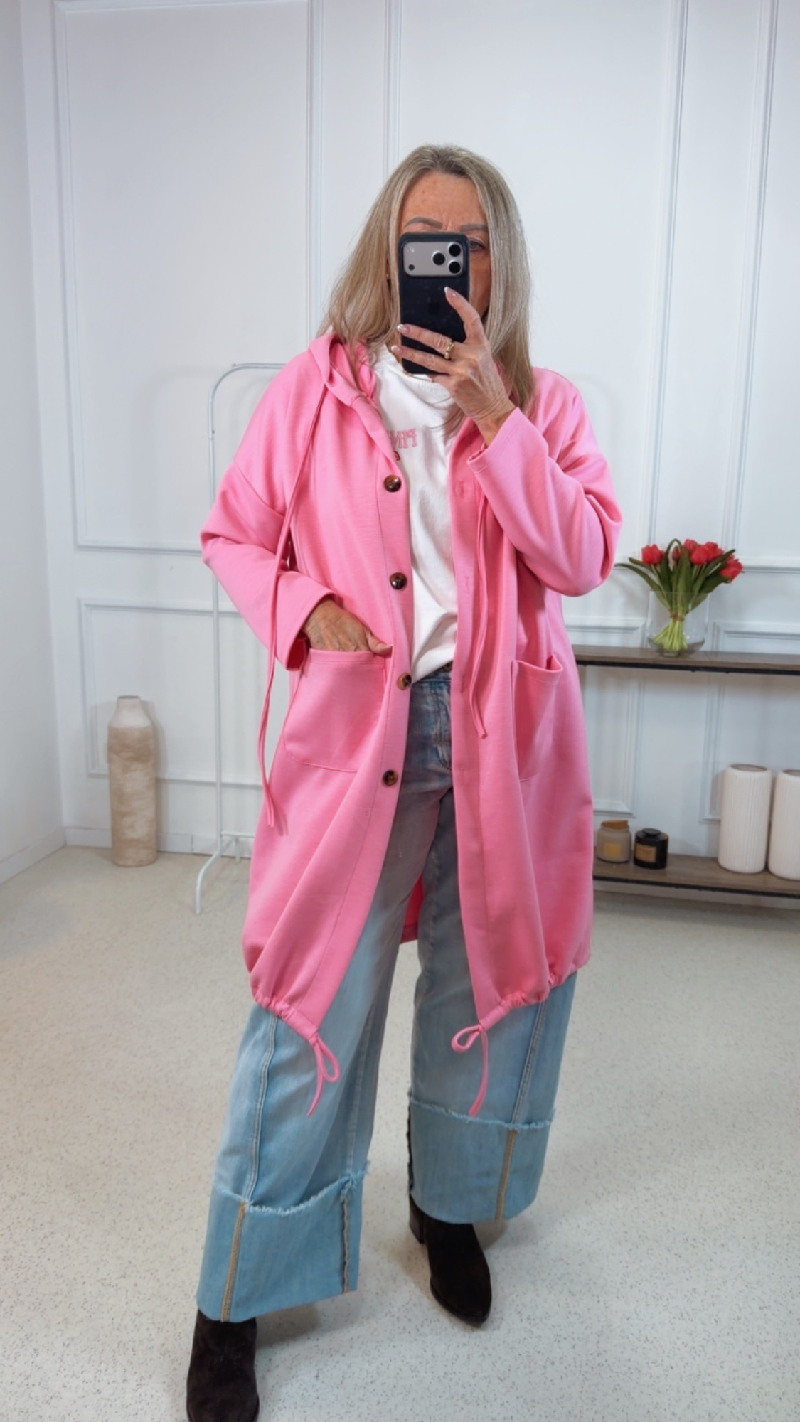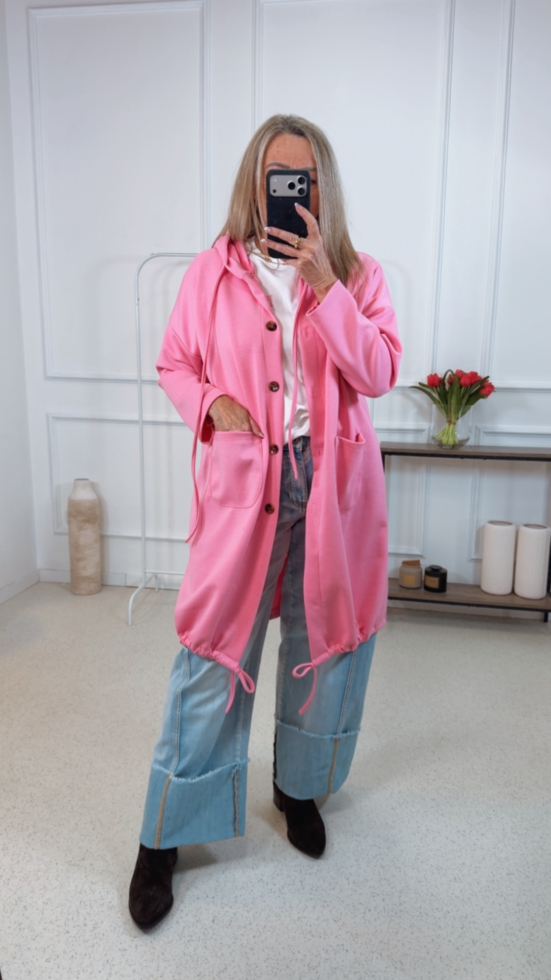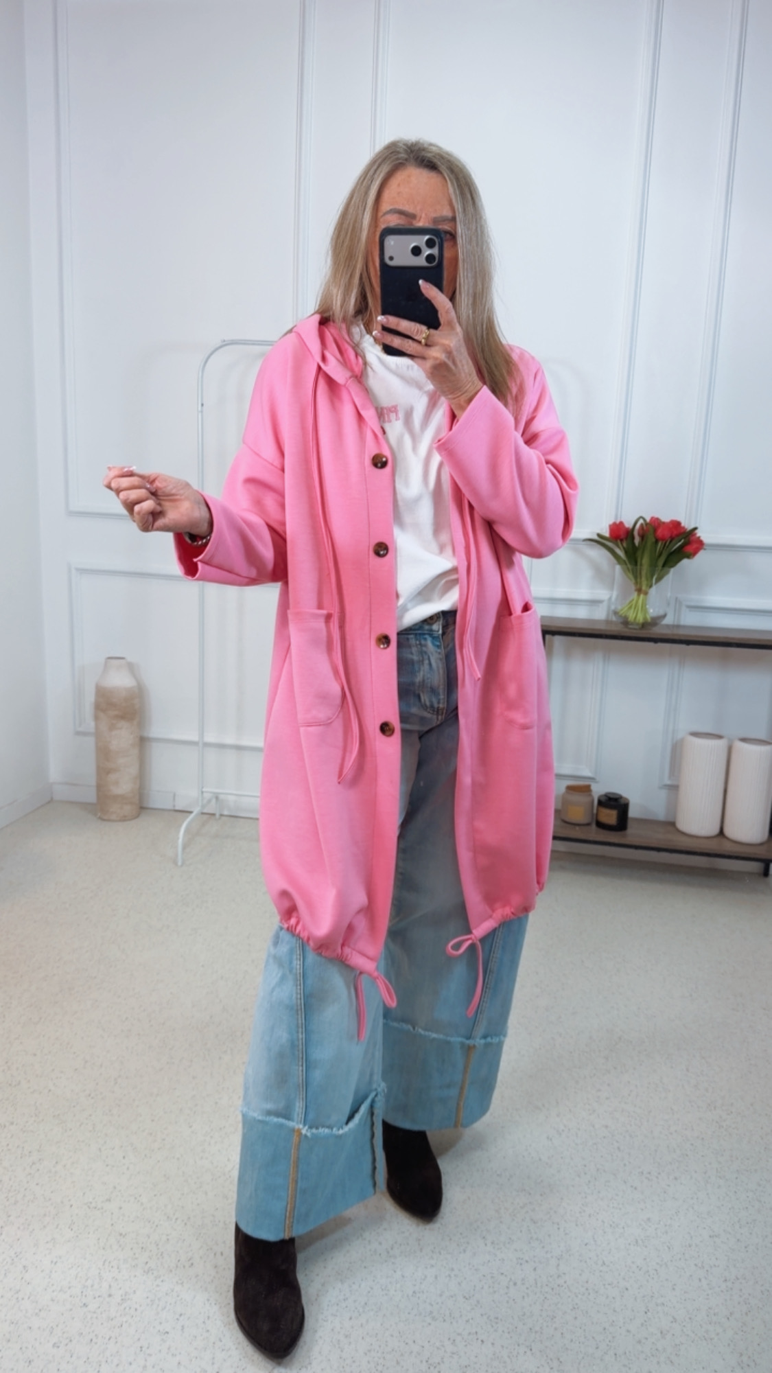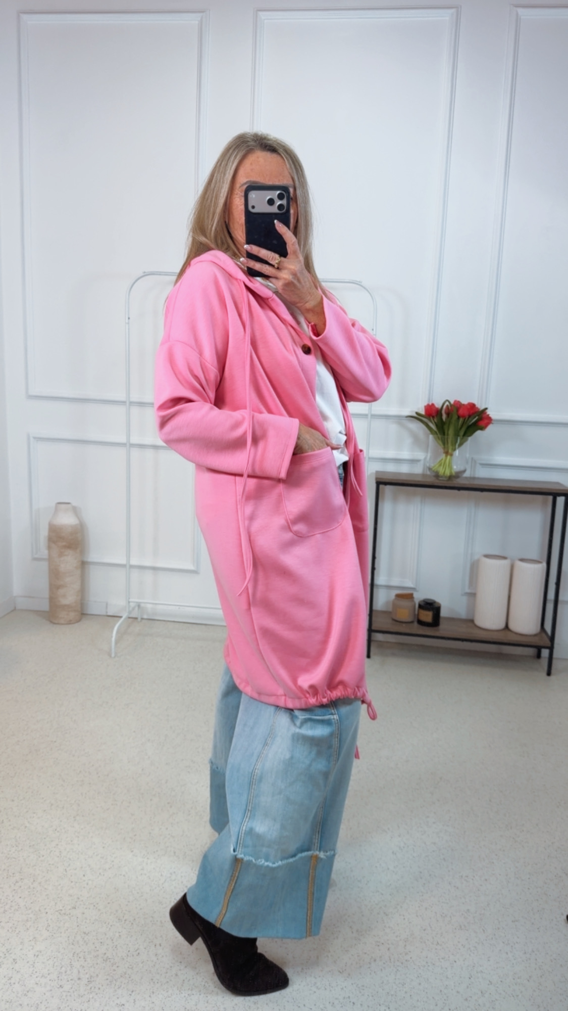 - Trendige lange Sweater Jacke mit Kapuze