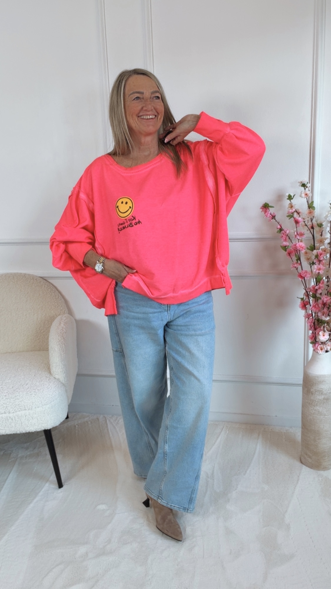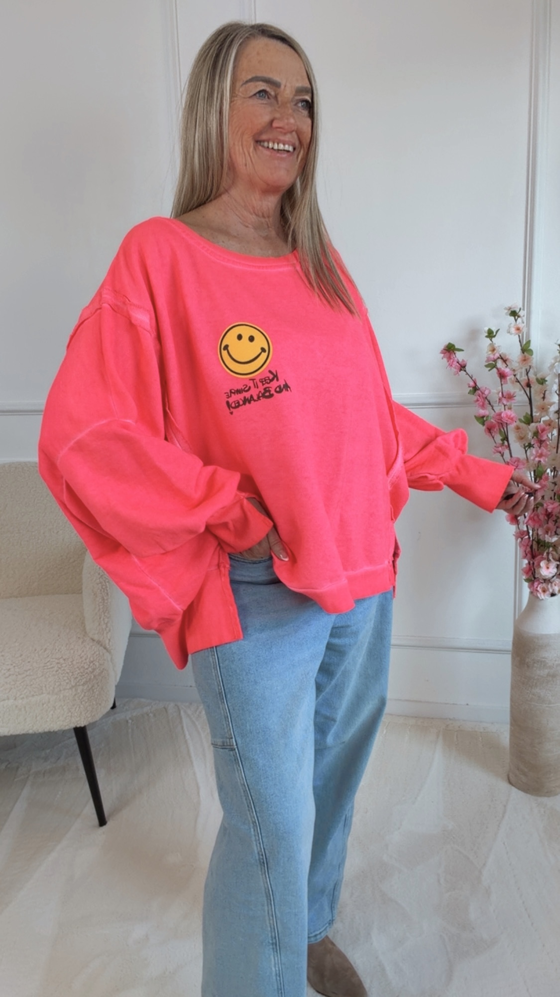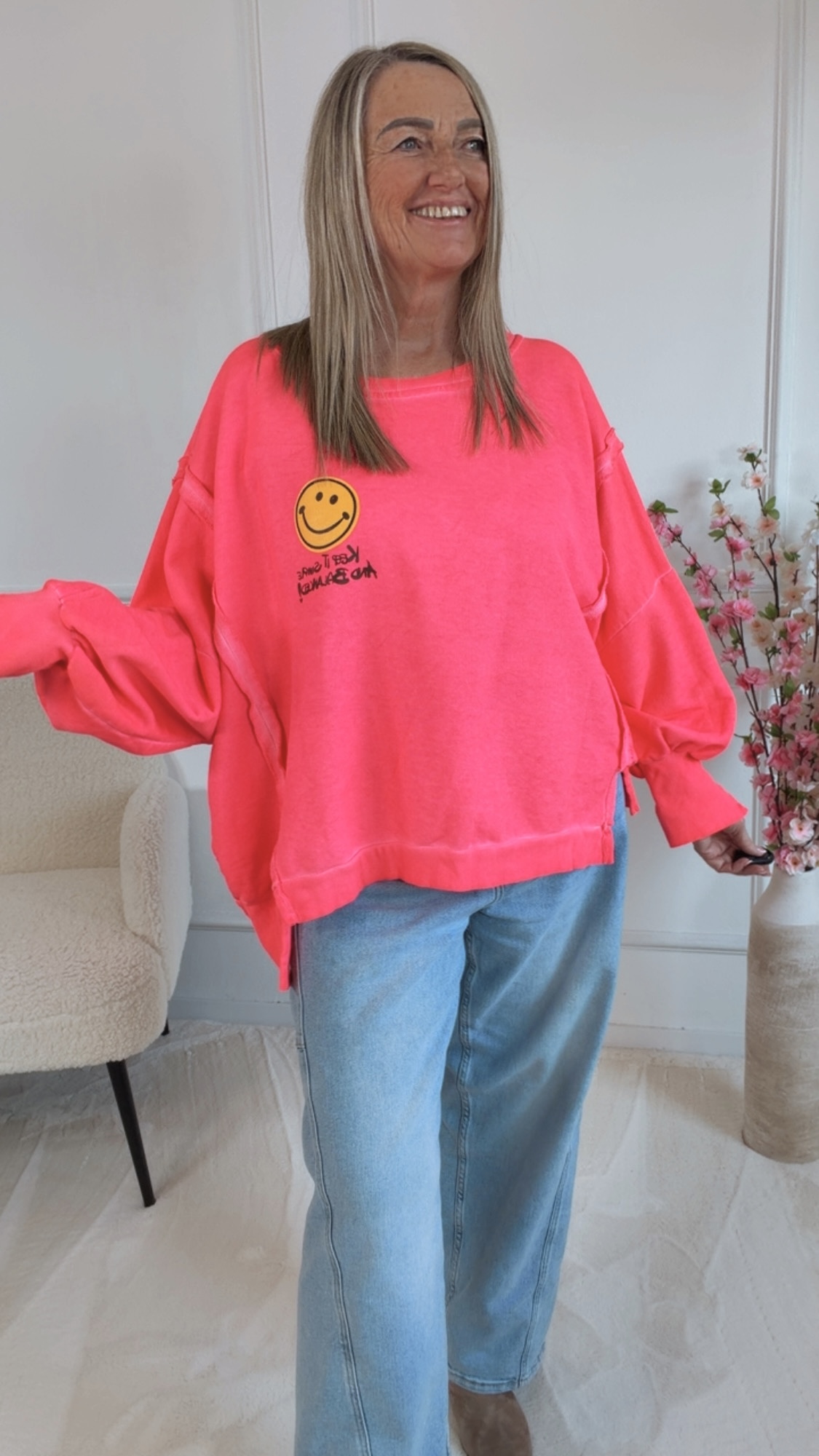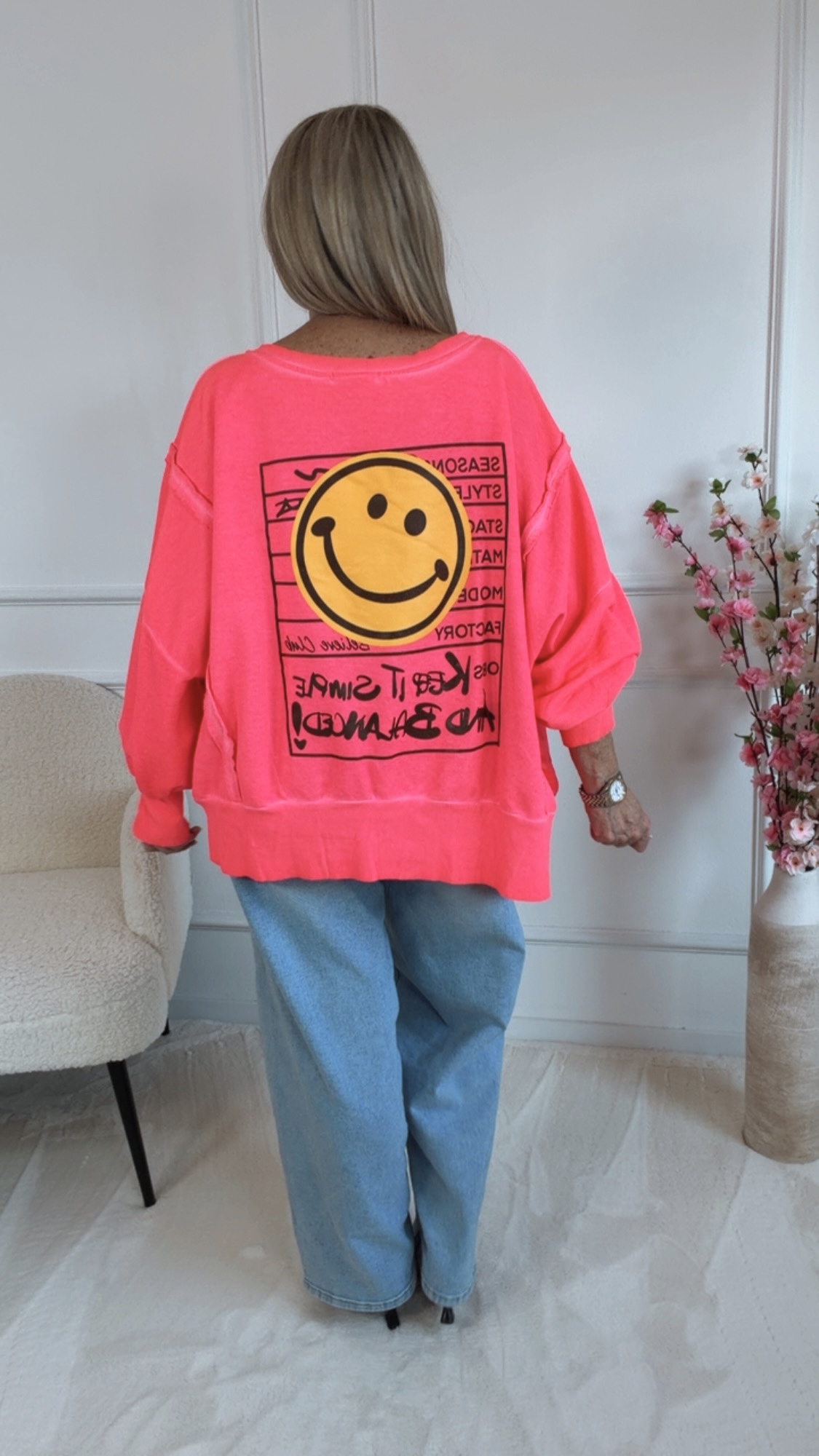 Dieser Sweater vereint Komfort und positive Vibes. Die lässigen Schlitze an den Ärmeln sorgen für einen modernen Twist und machen den Look besonders entspannt. Der dezente Smile-Aufdruck setzt ein freundliches Statement und erinnert daran, das Leben leicht zu nehmen. Abgerundet wird das Design durch den Schriftzug „keep it smile and balanced“ – eine Botschaft für gute Laune, innere Balance und einen selbstbewussten Style. Perfekt für alle, die Mode mit Gefühl und positiver Ausstrahlung lieben.