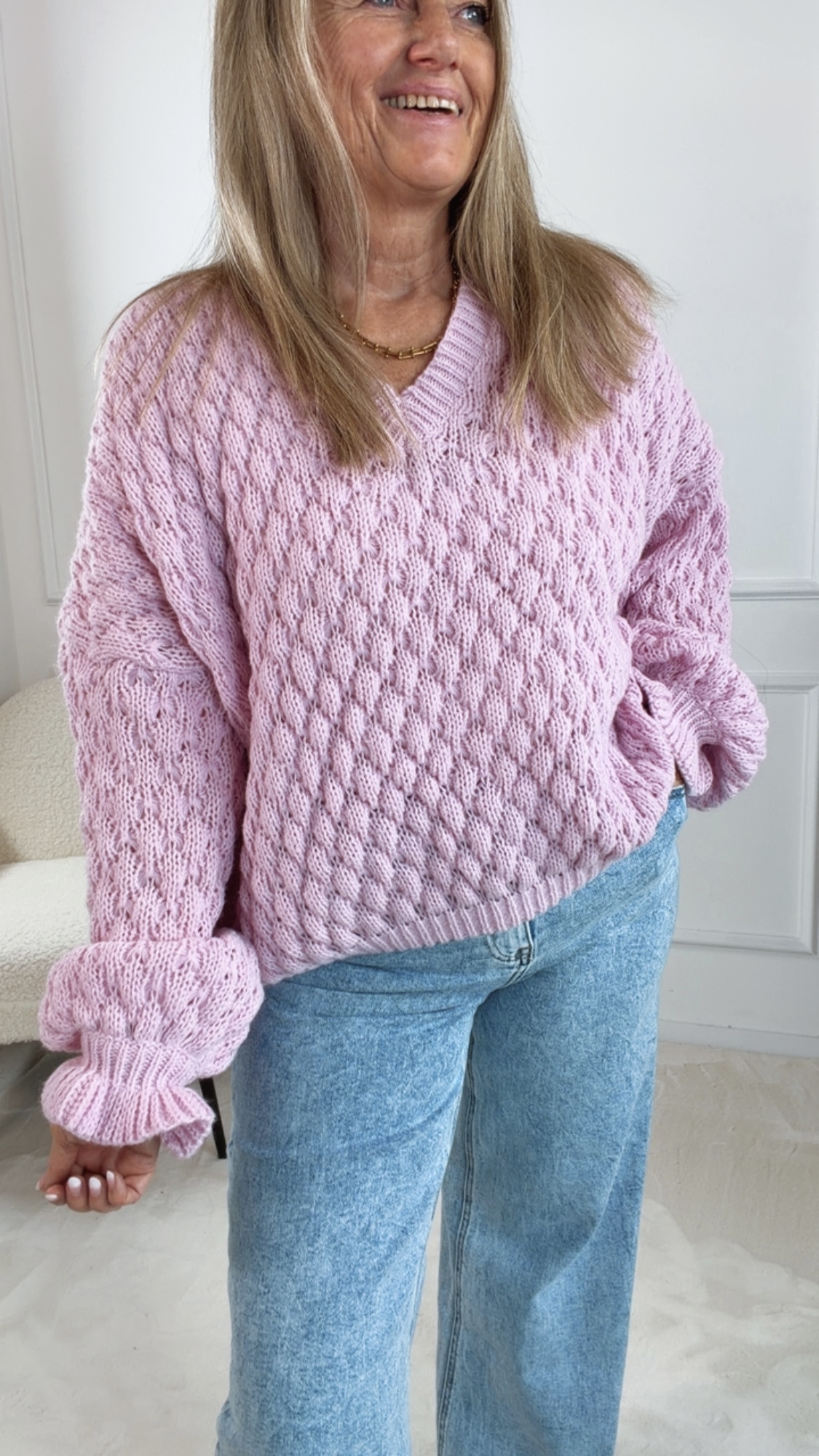 Dank des lockeren Schnitts passt der Pullover bequem bis circa Größe 42 und schmeichelt verschiedenen Figurtypen.