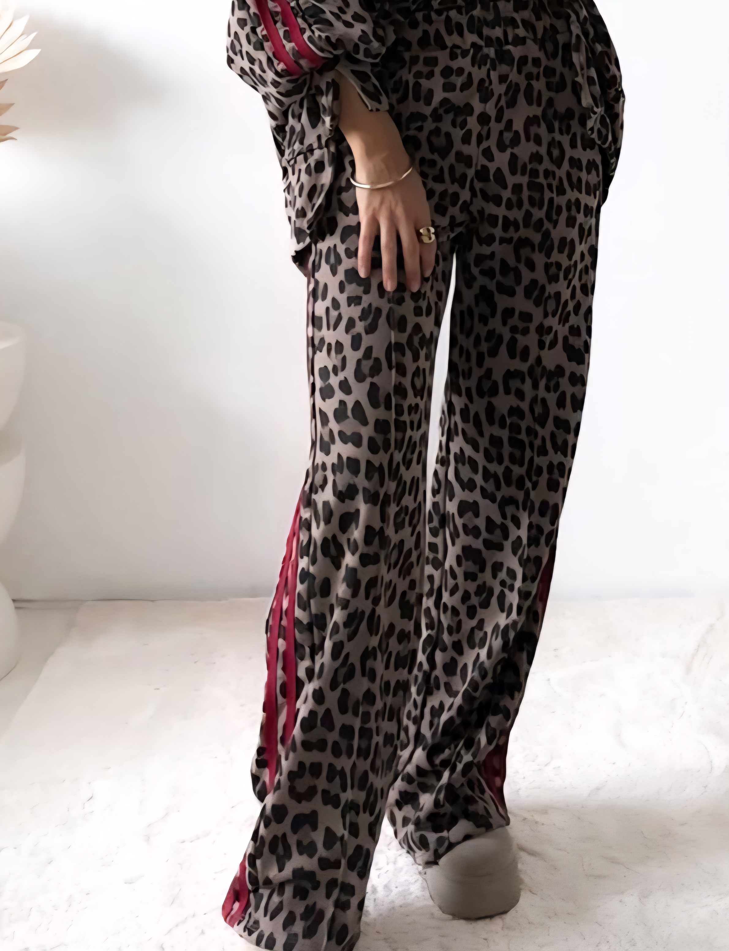 Diese trendige Leo-Hose ist ein echter Hingucker und kombiniert Komfort mit modischem Design. Das markante Leopardenmuster wird durch seitliche rote Streifen modern akzentuiert und verleiht der Hose einen sportlich-eleganten Look – perfekt für Freizeit, Streetstyle oder einen stylischen Alltagsauftritt.