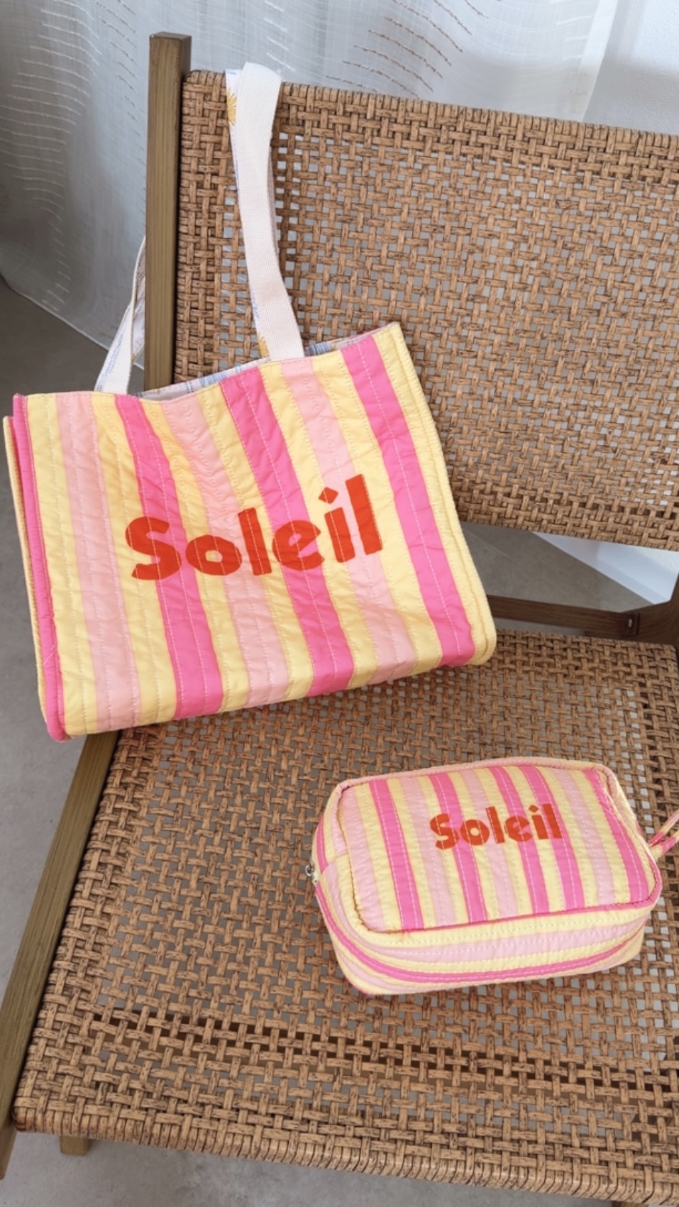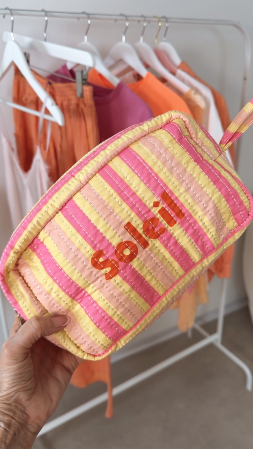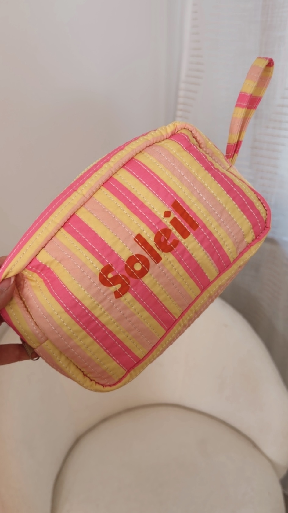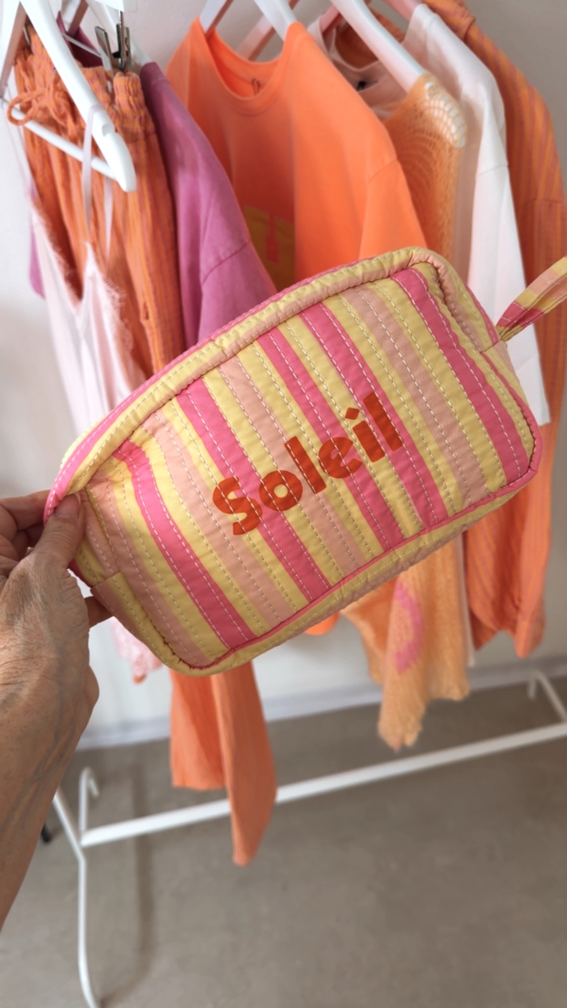 Die perfekte Ergänzung zur Badetasche Soleil! Diese liebevoll gestaltete Kosmetiktasche begeistert mit dem gleichen frischen Streifendesign in Rosa- und Gelbtönen und sorgt sofort für gute Laune – egal ob im Urlaub oder im Alltag.