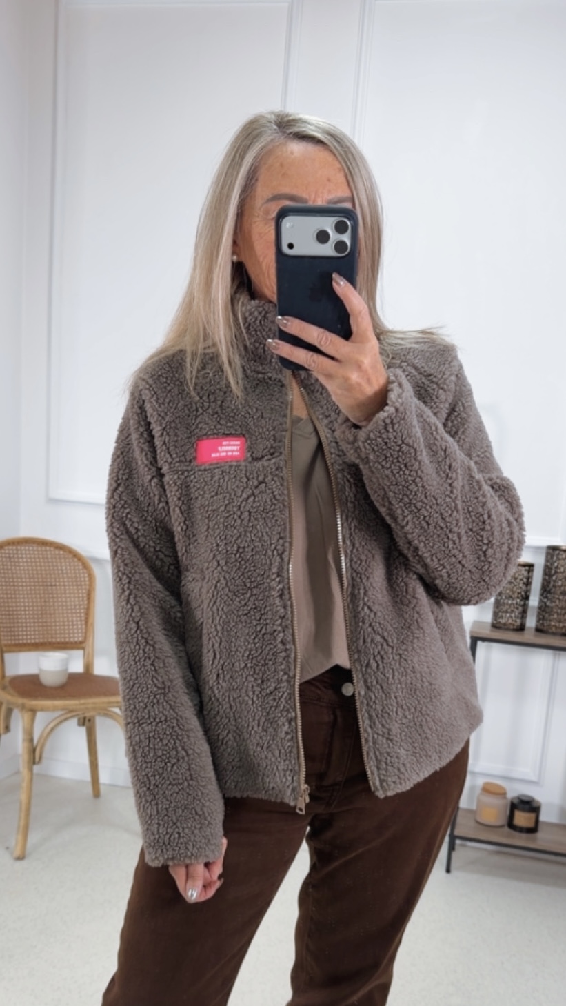 🧸 Teddyjacke mit Statement-Patch – Kuschelig, cool & selbstbewusst