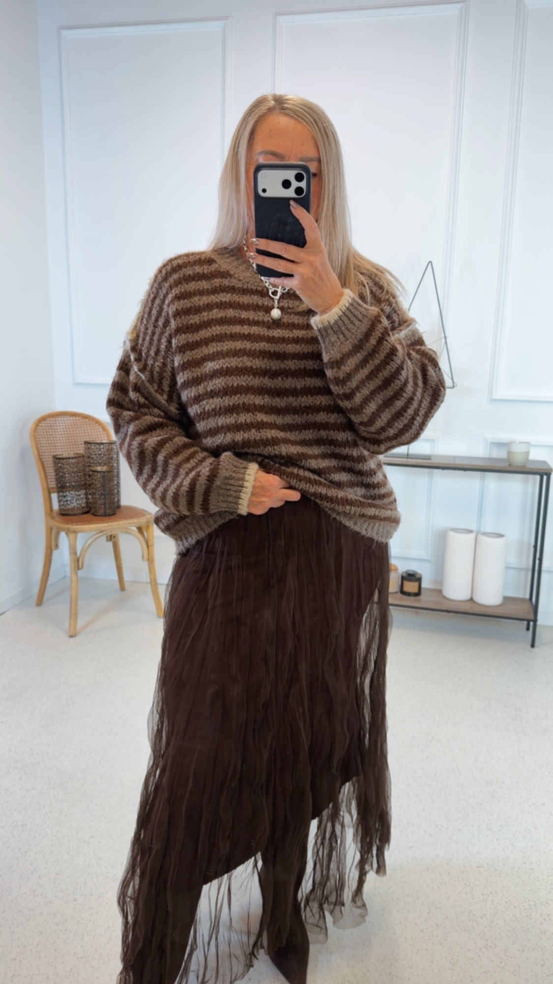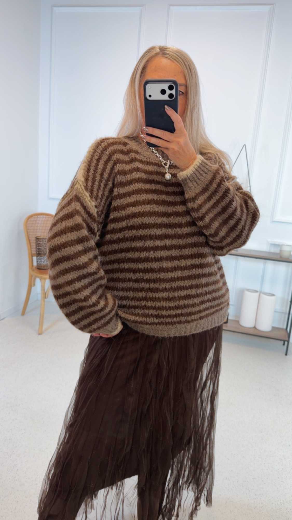 Der kurze Schnitt betont die Taille und lässt sich perfekt zu unseren Barreljeans oder Röcken stylen. Die grobe Strickstruktur unterstreicht den lässigen Charakter und macht den Pullover zu einem echten Hingucker für kühle Tage.