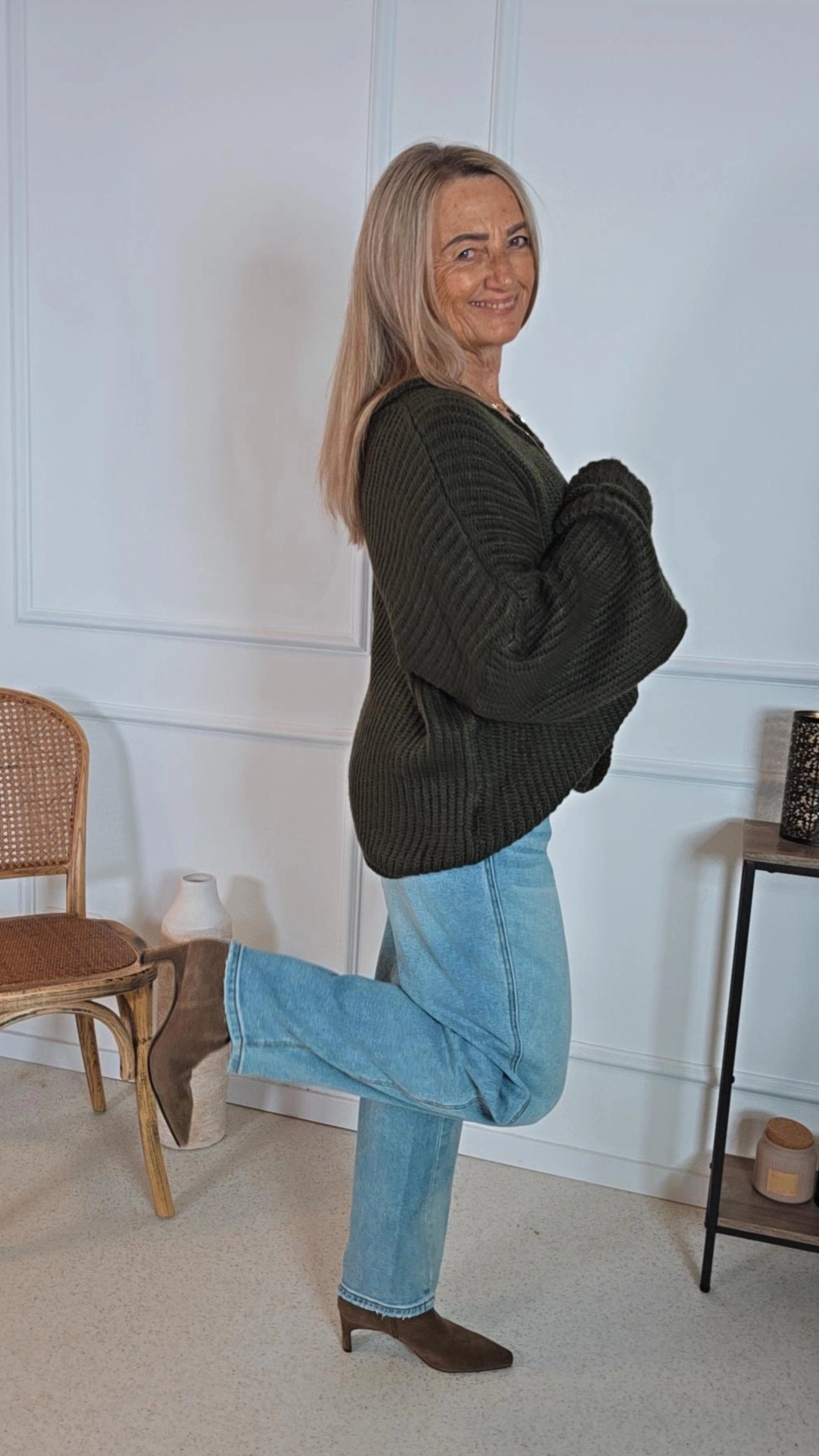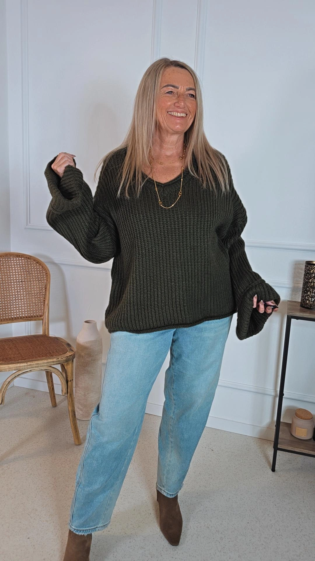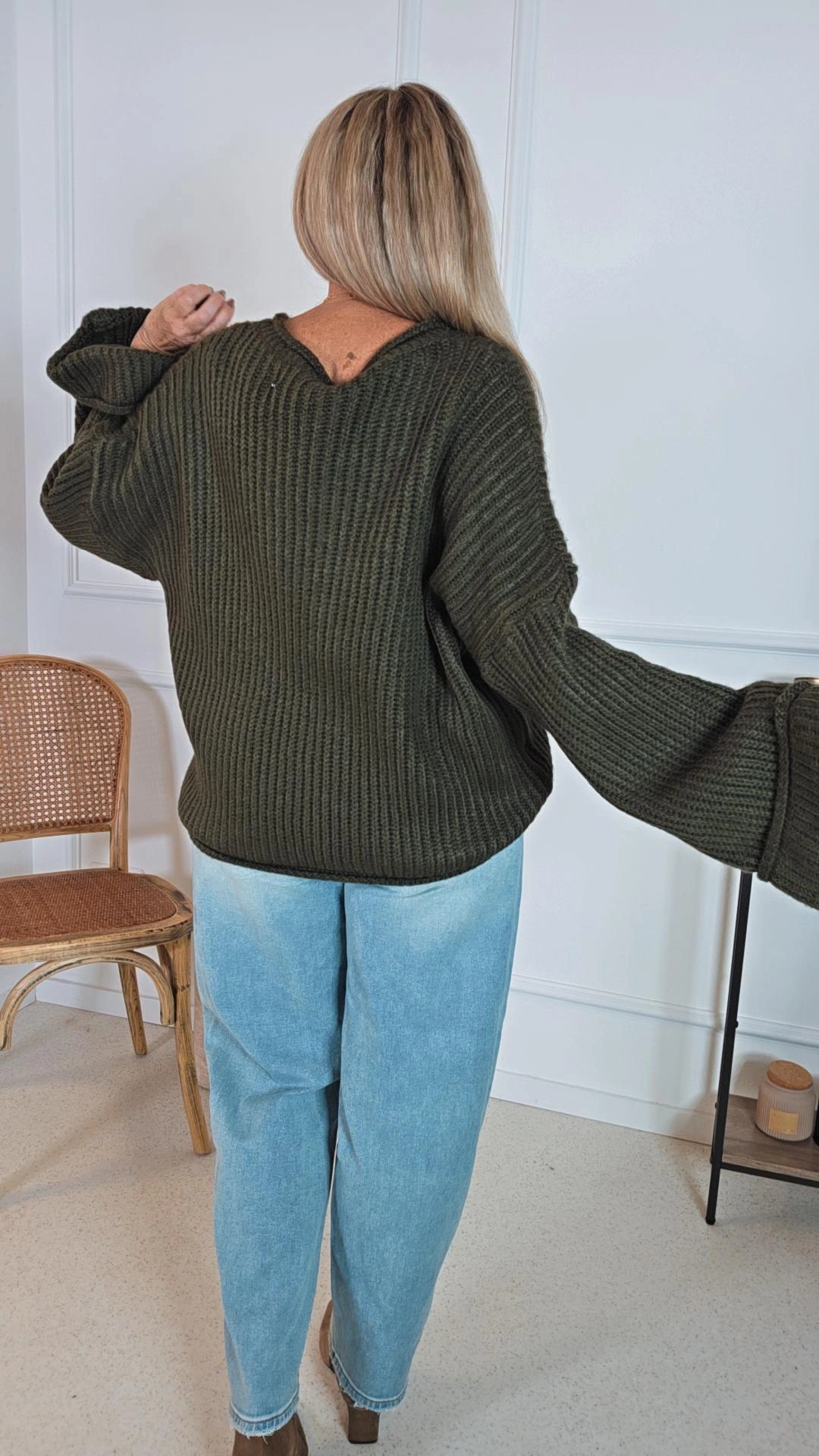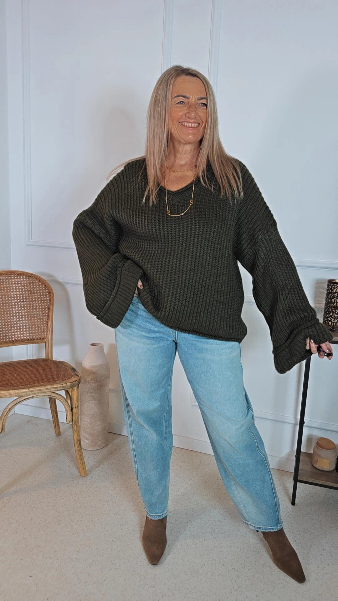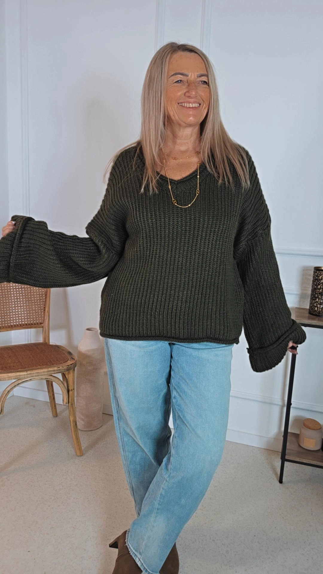 Grobstrick-Pullover mit V-Ausschnitt und ausgestellten Ärmeln