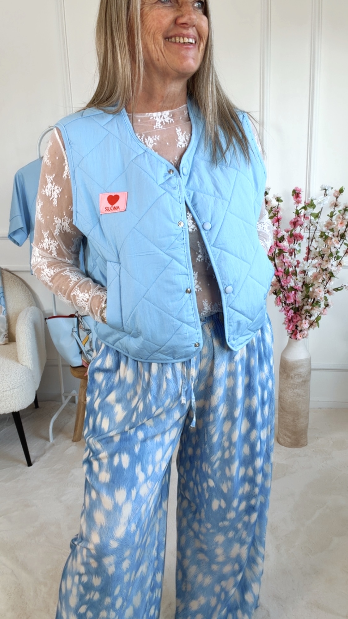 Die weite Hose vereint luftige Leichtigkeit mit stilvoller Eleganz und wird im Handumdrehen zum Lieblingsstück moderner Mädchen- und Damenlooks. Das zarte Federnmuster verleiht ihr eine verspielte, fast schwebende Ausstrahlung, während der passende Gürtel die Taille sanft betont und eine feminine Silhouette formt.